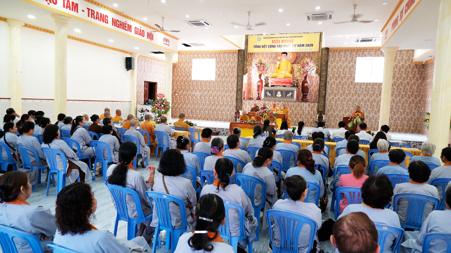 ĐĐ.Thích Thiền Hưng - Phó Thư ký, Chánh VP BTS báo cáo tổng kếtCông tác từ thiện xã hội Phật giáo thành phố đạt gần 3,3 tỷ đồng thông qua nhiều hình thức như: xây nhà tình thương, làm đường giao thông, tặng quà cho người nghèo, học sinh hiếu học, ủng hộ công tác phòng chống dịch COVID-19, cứu trợ đồng bào miền Trung bị thiên tai…