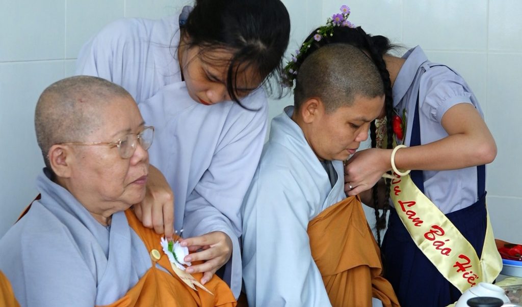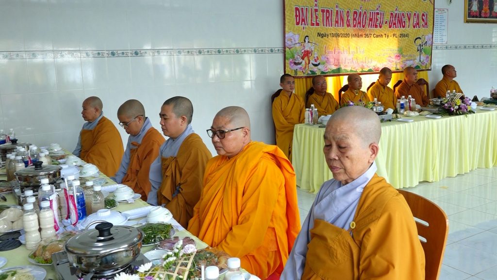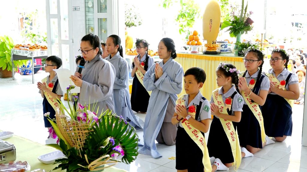 Trong giây phút lắng đọng thành kính, đại diện Phật tử đạo tràng đọc lời cảm niệm ân cha, nghĩa mẹ nhân mùa Vu lan Báo hiếu. Các em Phật tử đạo tràng cung kính thực hiện nghi thức cài bông hồng đến chư Tôn đức Tăng, Ni và các Phật tử có mặt trong buổi lễ.
