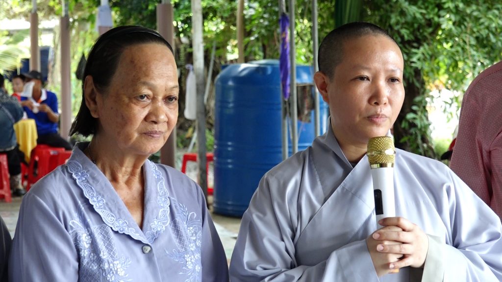 Phát biểu tại lễ trao quà, Sư cô trụ trì gửi lời cám ơn đến các nhà hảo tâm: Gia đình Bà Ngô Thị Ná (Ở Mỹ) đã đóng góp 100 phần quà gồm có 1 tấn gạo, 100 chai nước tương, 100 chai dầu ăn. Gia đình Phật tử Nguyễn Ngọc Lan (Tự Mén) hỗ trợ 1 tấn gạo, cùng Phật tử Trinh Anh và Tâm Phụng ủng hộ 100 thùng mì. Nhân mùa Vu lan Báo hiếu, Sư cô gửi lời chúc đến chư vị Phật tử nhà hảo tâm đã chung tay góp sức cùng Sư cô tổ chức nhiều hoạt động từ thiện trong thời gian qua cũng như quý Phật tử xa gần có thêm nhiều phước báu, an vui.
