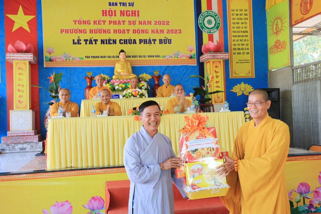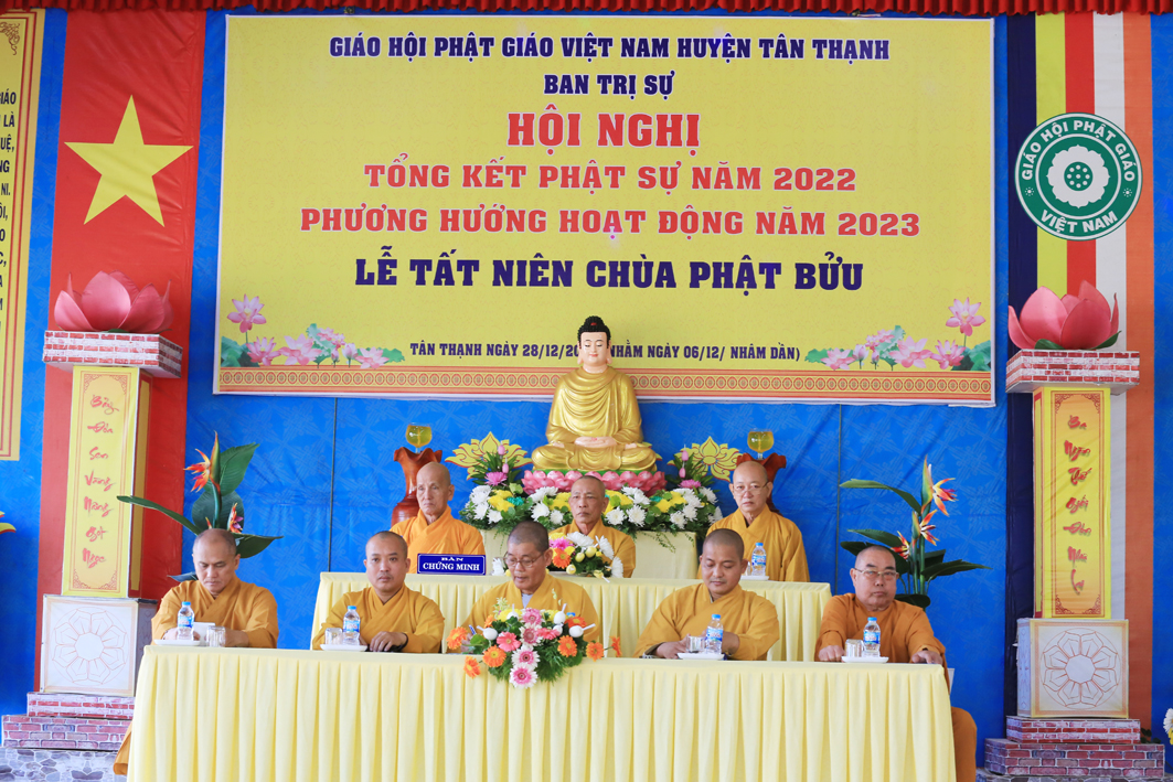 Kết thúc hội nghị, TT. Thích Lệ Tấn, Uỷ viên Thường trực BTS GHPG tỉnh, Trưởng Ban Trị sự PG huyện Tân Thạnh, Trưởng BTC có lời cảm tạ đến chư Tôn đức chứng minh, chư Tôn đức hiện tiền, lãnh đạo chính quyền các cấp, quý Phật tử gần xa, quý vị khách quý cùng toàn thể hội chúng lời tri ân sâu sắc, Thượng toạ cung bày tỏ niềm đại hoan hỷ của mình với những thành tựu công tác Phật sự trong năm 2022 và mong muốn trong năm mới BTS PG huyện Tân Thạnh sẽ có nhiều thành tựu hơn nữa, với niềm hoan hỷ của toàn thể hội chúng Thượng tọa kính gửi những lời chúc tốt đẹp nhất và lời chúc mùa Xuân Quý Mão 2023 sức khoẻ, an lành, hạnh phúc đến toàn thể hội chúng. Hội nghị kết thúc tốt đẹp trong niềm hoan hỷ của tất cả mọi người.