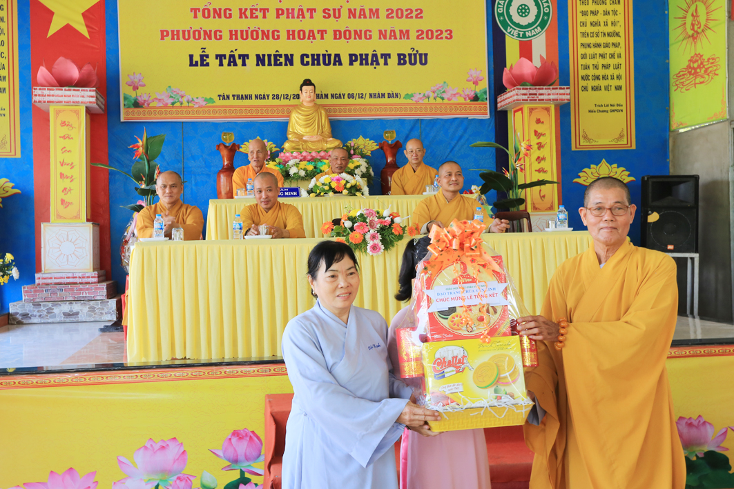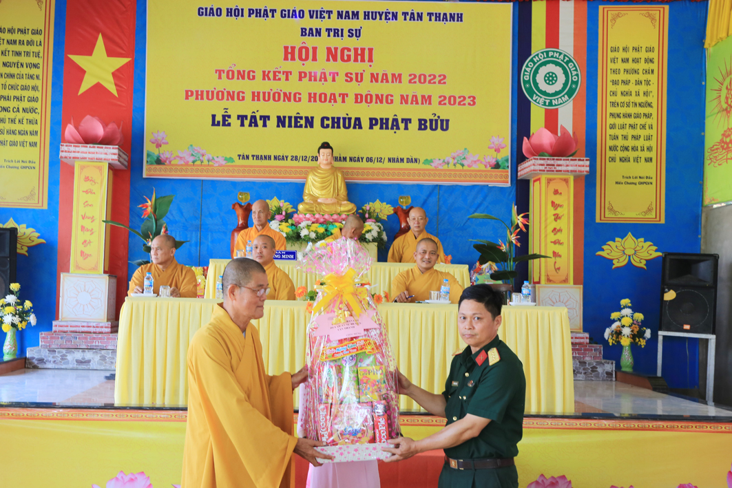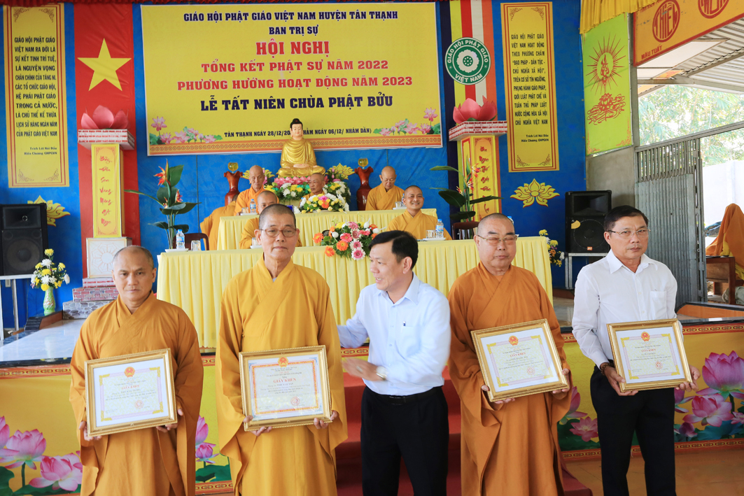 Tại hội nghị, ghi nhận công đức của các tự viện và chư Tôn đức Tăng Ni, Phật tử tiêu biểu đã hỗ trợ BTS GHPGVN huyện Tân Thạnh năm 2022; UBND huyện Tân Thạnh đã trao, Bằng khen cho những tập thể và cá nhân tiêu biểu có thành tích xuất sắc.