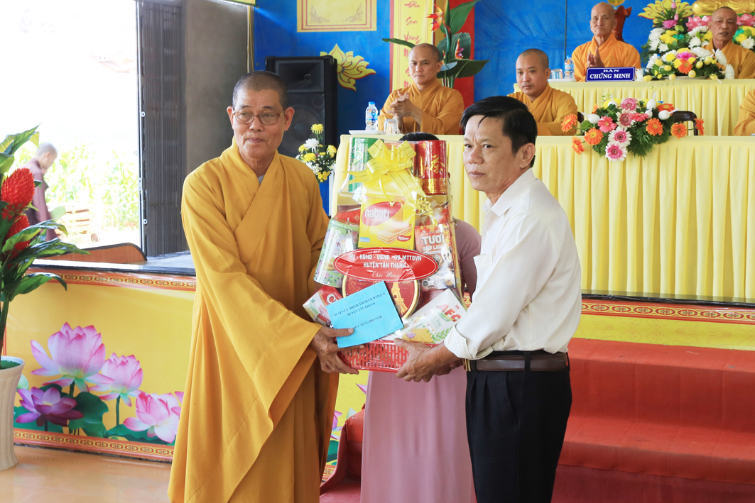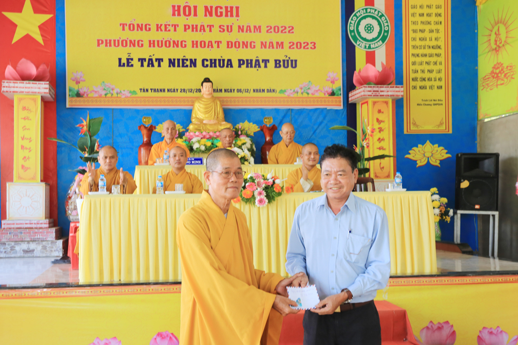 Thay mặt cho chính quyền các cấp hiện, ông Hà Thanh Chì, Uỷ viên Ban thường vụ Huyện ủy, Phó chủ tịch UBND huyện Tân Thạnh đã bày tỏ sự hoan hỷ theo báo cáo Tổng kết công tác Phật sự năm 2022 vừa qua. Ông đã thông tin sơ lược về 6 điểm nổi bật về kinh tế, chính trị, xã hội của huyện Tân Thạnh năm 2022. Ông ghi nhận những đóng góp to lớn của Phật giáo huyện nhà nhất là công tác An sinh xã hội xây dựng cầu nông thôn. Nhân dịp này, Ông xin ghi nhận, biểu dương và gửi lời tri ân trân trọng đến chư Tôn đức, quý Phật tử cùng quý vị Mạnh thường quân đã góp phần cho sự thành tựu các công tác của huyện Tân Thành. Ông mong muốn BTS sẽ tiếp tục đồng hành cùng lãnh đạo chính quyền huyện Tân Thạnh ở những năm kế tiếp. Ông kính gửi những lời chúc tốt đẹp, một mùa Xuân Quý Mão an lành đến tất cả mọi người.