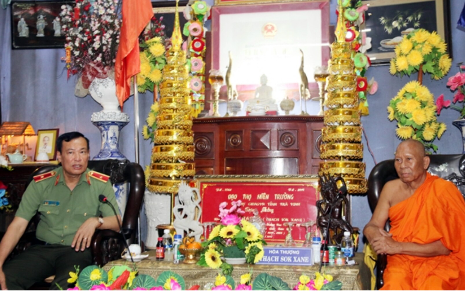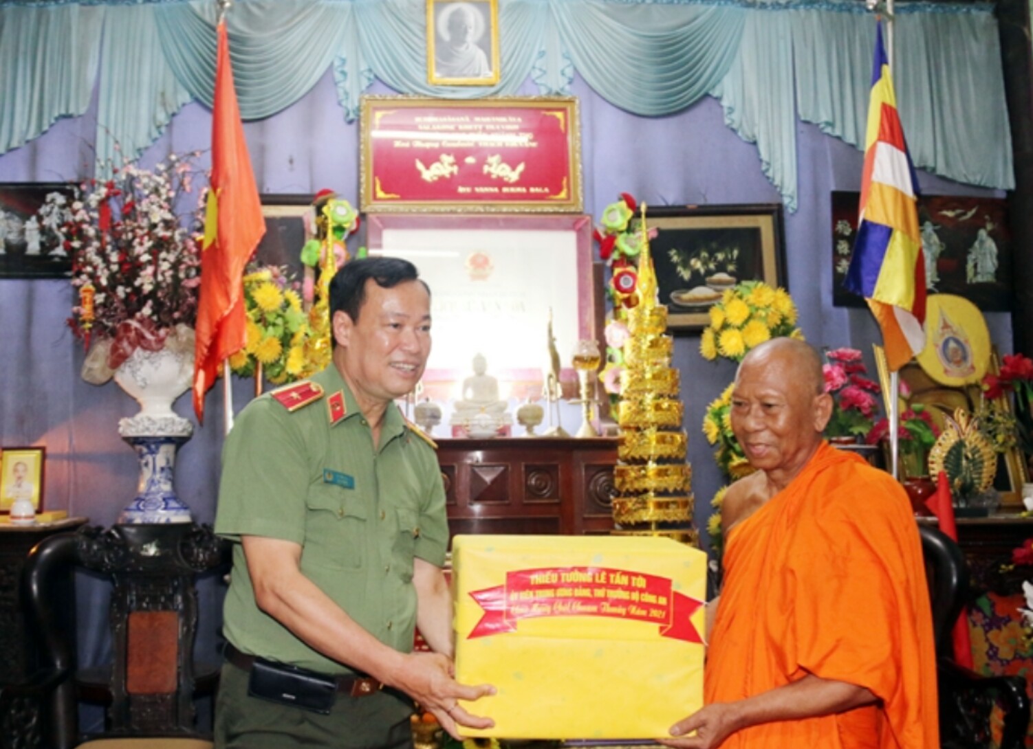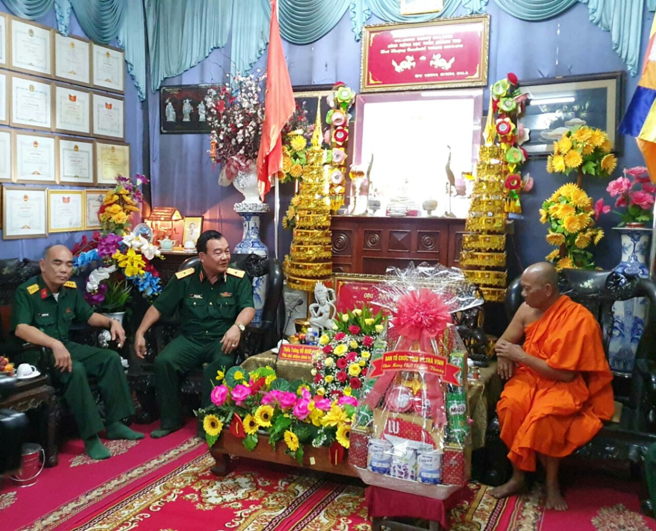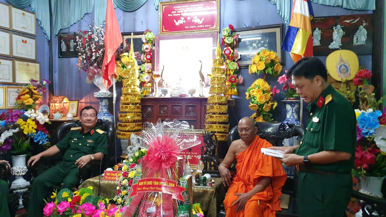 Đoàn Bộ tư lệnh Quân khu 9 do Thiếu tướng Hồ Minh Phương - Phó Chủ nhiệm chính trị Bộ tư lệnh Quân khu 9, làm Trưởng đoàn; Đoàn công tác Bộ công an do Thiếu tướng Lê Tấn Tới - Uỷ viên Trung ương Đảng, Thứ Trưởng Bộ công an làm Trưởng đoàn; Đoàn công tác của Vụ Địa phương III do ông Tào Việt Thắng - Phó vụ trưởng vụ Địa phương III, làm Trưởng đoàn, đã đến thăm và chúc tết các vị chư Tăng, BQT và bà con Phật tử các chùa Khmer và gia đình chính sách trên địa bàn tỉnh Trà Vinh.