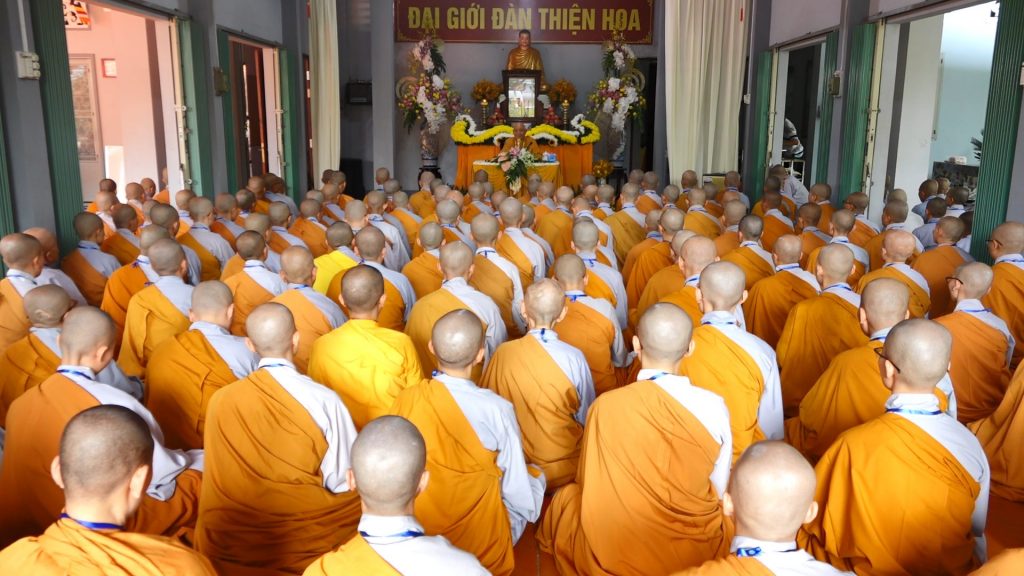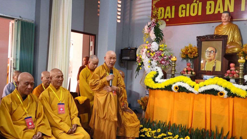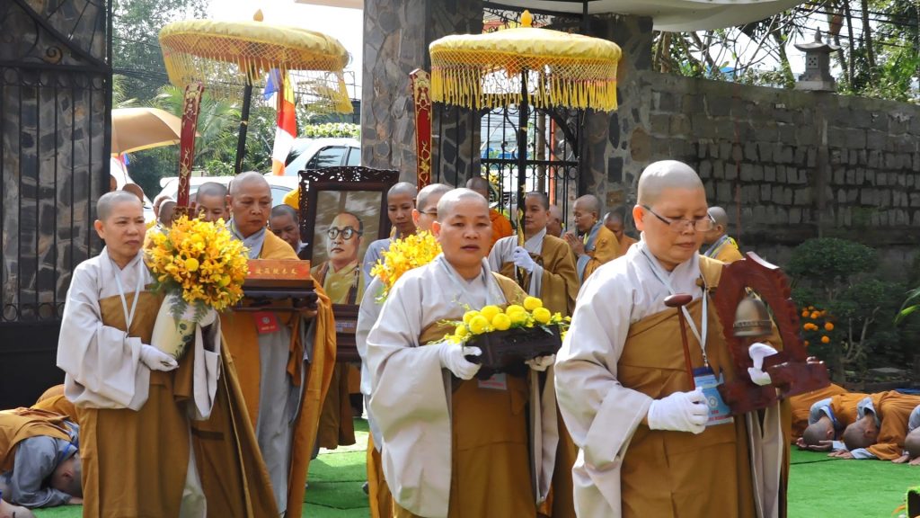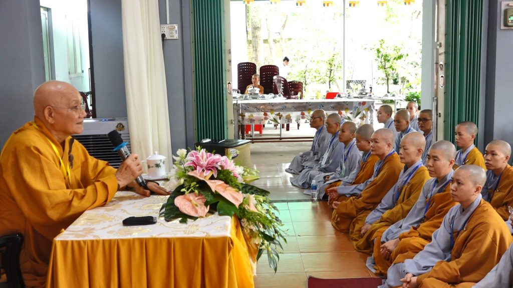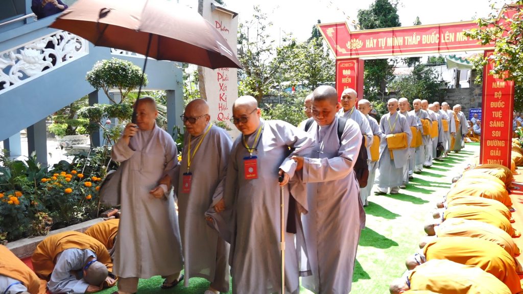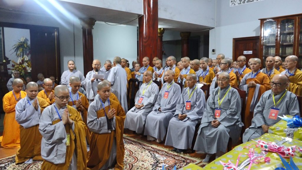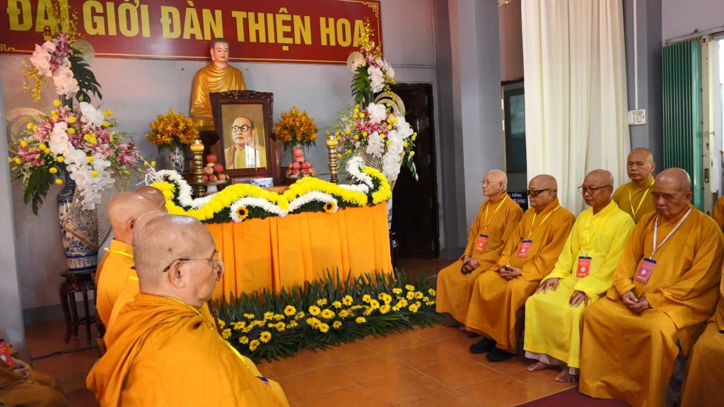 Sau nghi thức trang nghiêm cung đón di ảnh cố HT.Thiện Hoa, quý Ni trưởng, Ni sư đã niệm hương, bạch Phật, các giới tử đã được cung đón chư Tôn đức BTS GHPGVN tỉnh Vĩnh Long đến chứng minh và sách tấn cho hàng Ni giới.