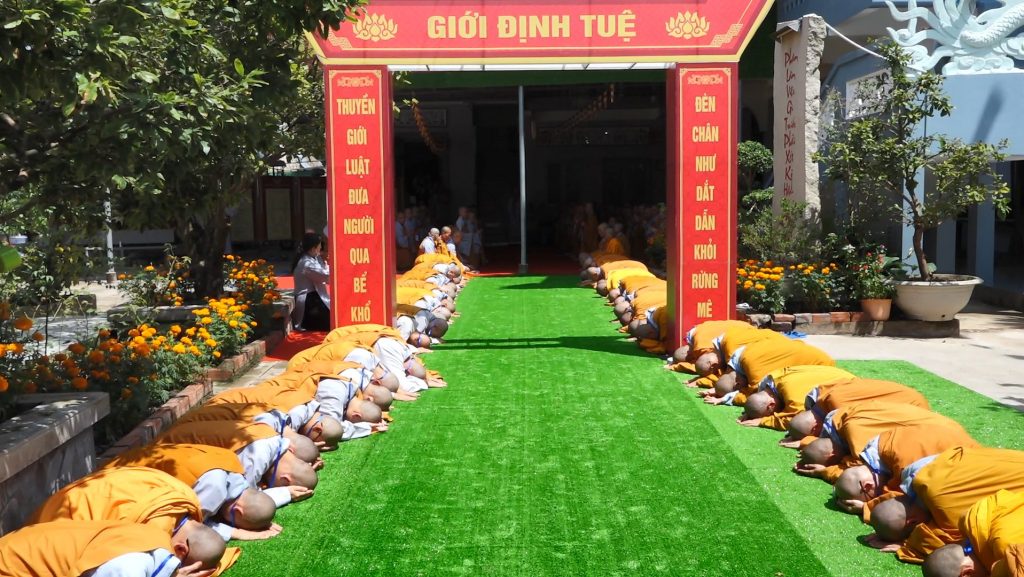 Các giới tử Ni đã đê đầu đảnh lễ Cung an chức sự Thập sư Ni tại Giới trường, chư Hòa thượng Đàn đầu Tôn chứng sư, chư Tôn đức Hội đồng Thập sư Ni, chư Tôn đức Ban kiến đàn, một lòng chí thành cần cầu giới pháp cao quý.