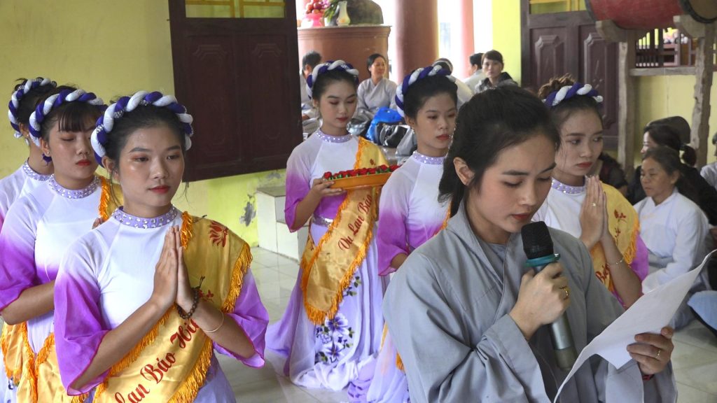 Trong giây phút thiêng liêng nghĩ về ân đức sinh thành, Phật tử Hoằng Duyên đã đại diện cho Phật tử đạo tràng đọc lời cảm niệm ân Cha, nghĩa Mẹ nhân mùa Vu lan Báo hiếu. Các em Phật tử đạo tràng đã trang nghiêm, cung kính thực hiện nghi thức cài Hoa hồng đến chư Tôn đức chứng minh. Những đóa hoa được cài lên áo, mang nhiều cung bậc cảm xúc, khi Cha và Mẹ đã gánh chịu biết bao vất vả, gian lao để nuôi dưỡng chúng ta thành người.