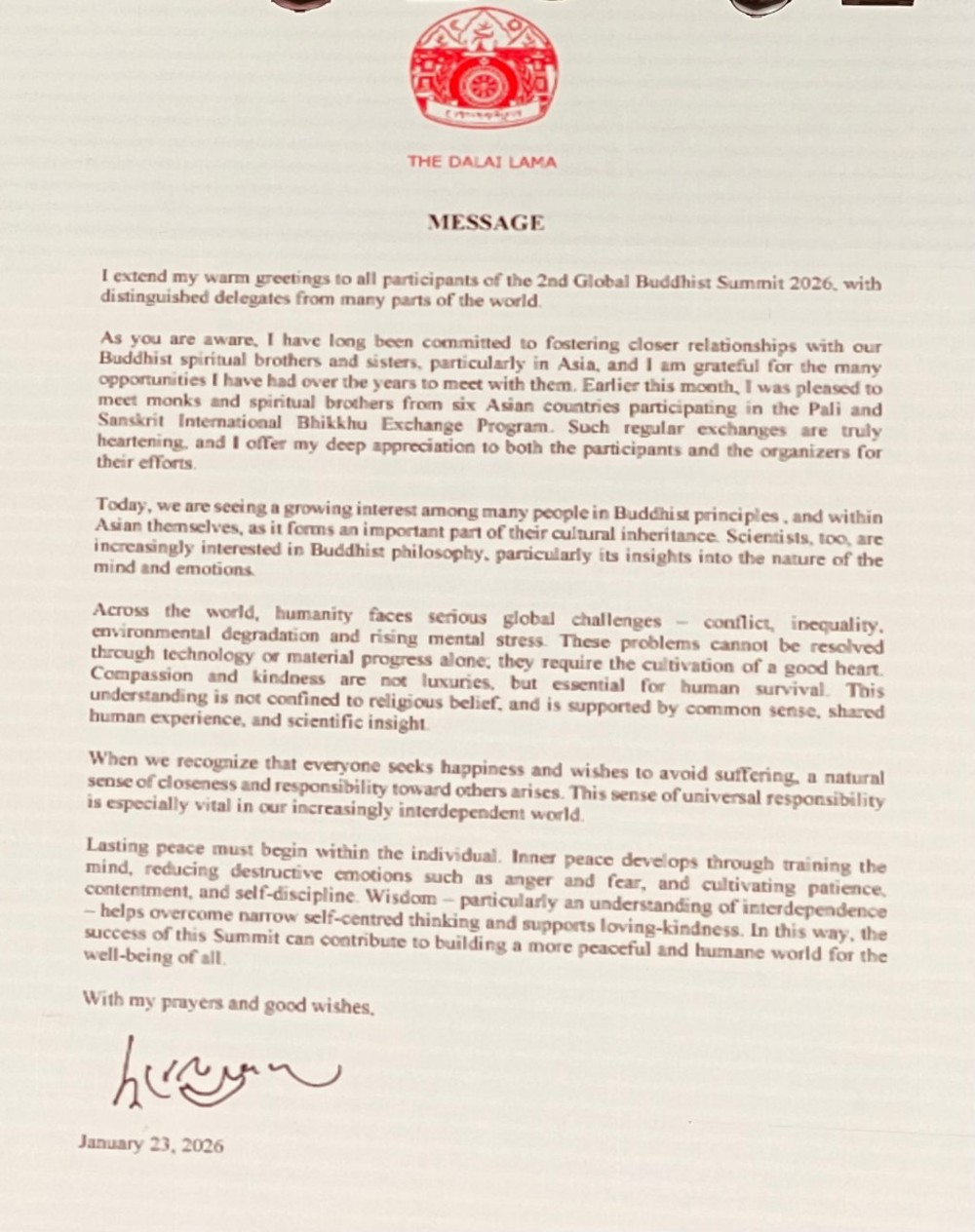 PSO - Nhân dịp Hội nghị Phật giáo Toàn cầu lần thứ hai – Global Buddhist Summit 2026 (GBS 2026), Đức Đạt Lai Lạt Ma thứ 14 đã gửi Thông điệp tới các đại biểu tham dự, nhấn mạnh vai trò của lòng từ bi, trí tuệ và trách nhiệm chung trong việc giải quyết những thách thức toàn cầu hiện nay.