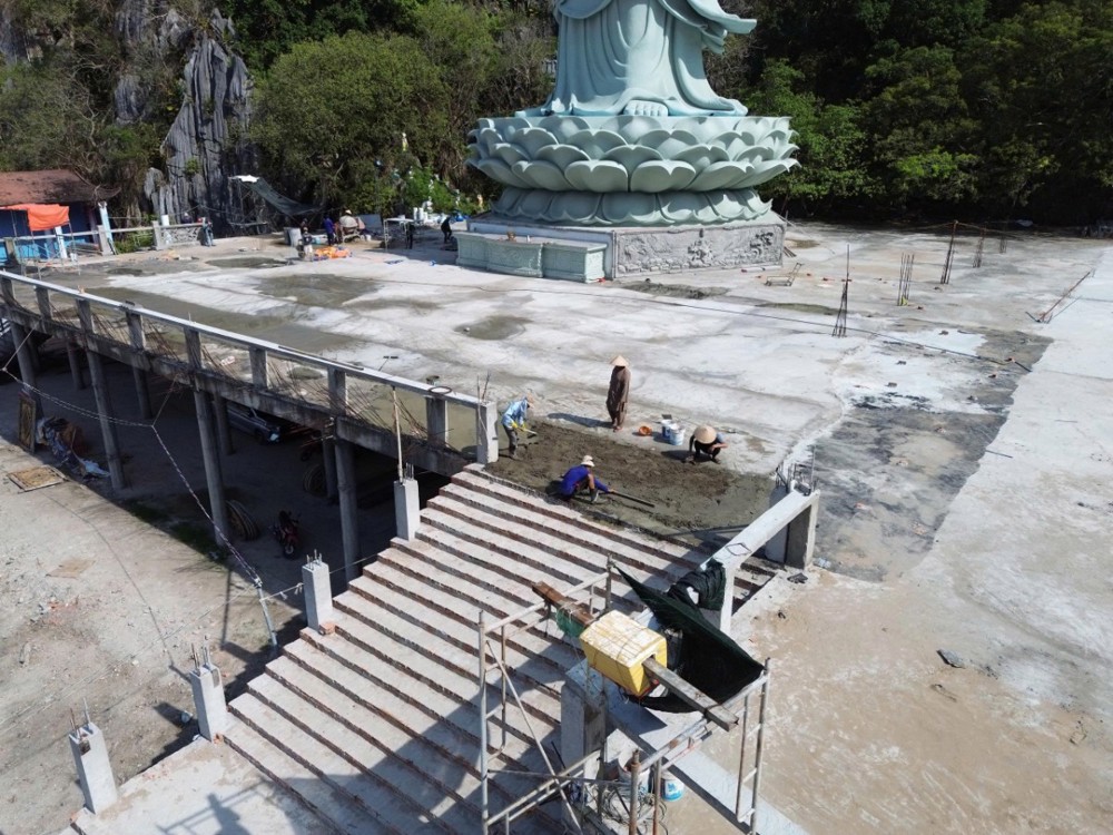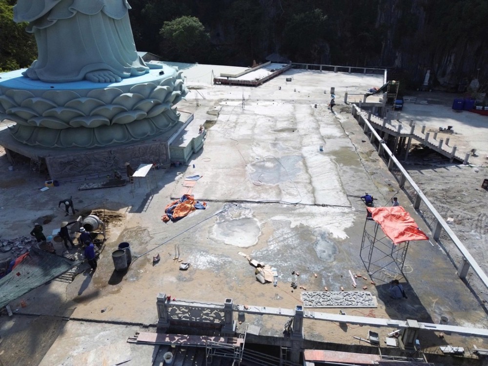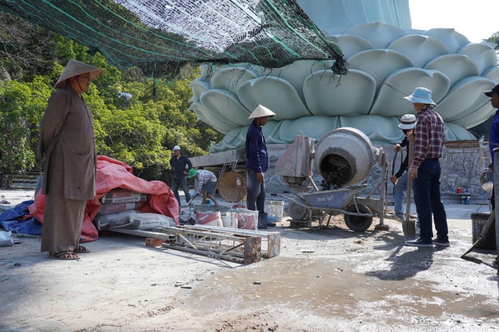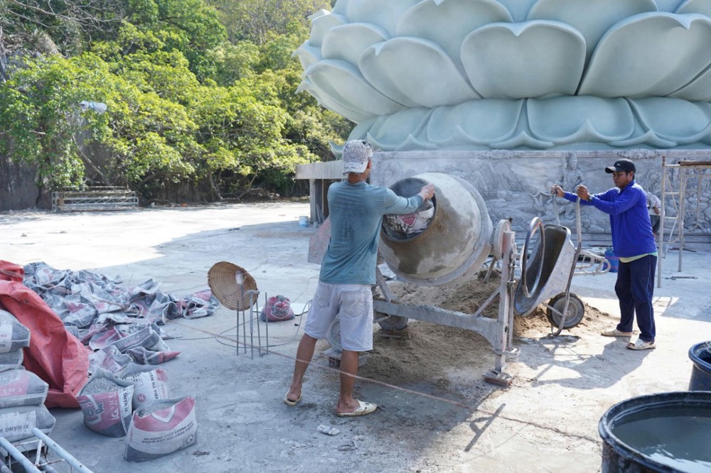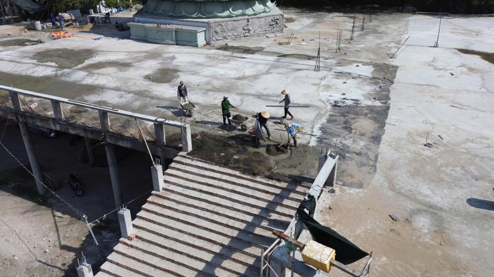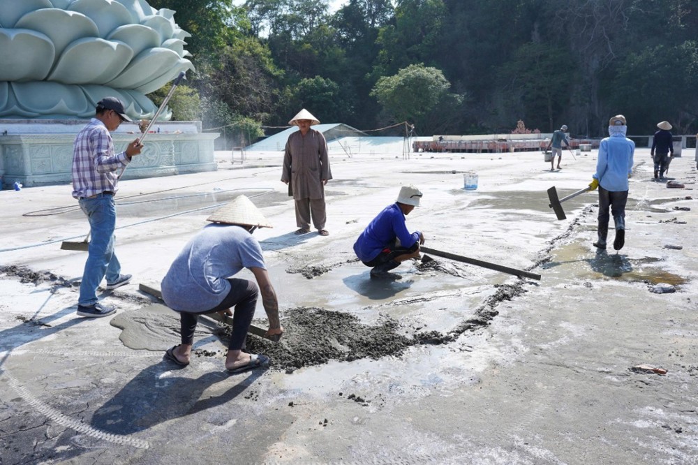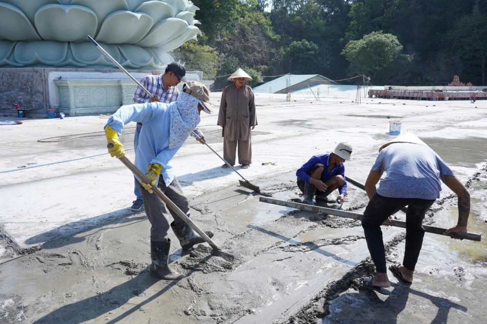 Hiện nay, hạng mục cán lót nền khu vực tượng đài Quán Thế Âm đang được triển khai đồng loạt. Đây là công đoạn nền tảng, giữ vai trò quan trọng trong việc hoàn thiện mặt bằng sinh hoạt và chiêm bái của Phật tử, đồng thời chuẩn bị cho các bước tiếp theo như lát đá, trang trí và bài trí không gian lễ bái trang nghiêm nơi tượng đài.