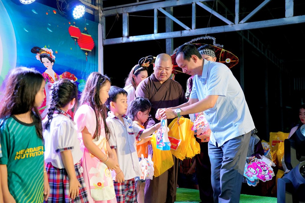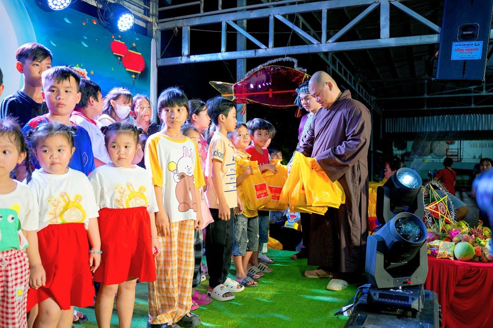 Phát biểu khai mạc, Đại đức Thích Tuệ Tánh gửi lời chúc sức khỏe đến quý lãnh đạo, phụ huynh và toàn thể các em thiếu nhi. Đại đức chia sẻ: “Trung Thu là Tết Đoàn viên, là dịp để gia đình sum họp, để các em thiếu nhi được vui chơi, rước đèn, phá cỗ và tận hưởng tuổi thơ trong ánh trăng vàng. Những món quà trao tặng tuy giản dị nhưng chứa đựng tình thương, niềm động viên, giúp các em thêm niềm vui và nghị lực trong học tập.” Đồng thời, Đại đức cũng bày tỏ lòng tri ân đến chính quyền địa phương và quý mạnh thường quân đã đồng hành, tạo điều kiện để chương trình diễn ra thành công.