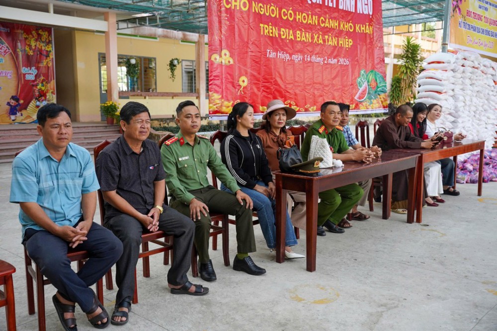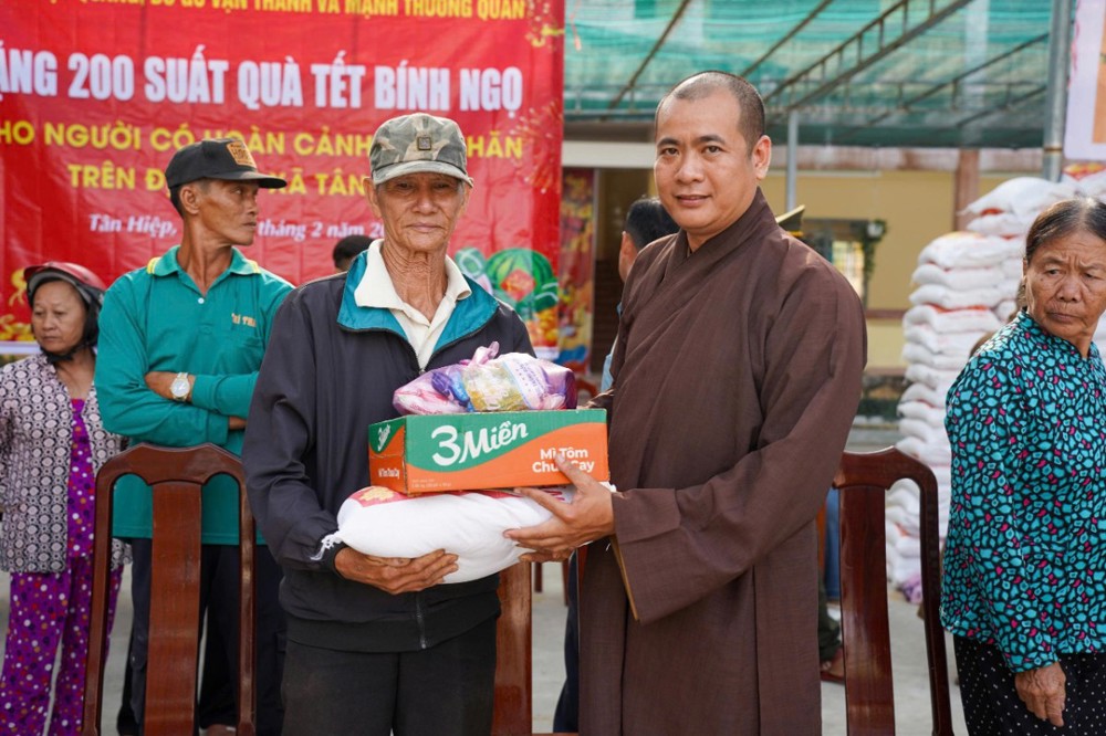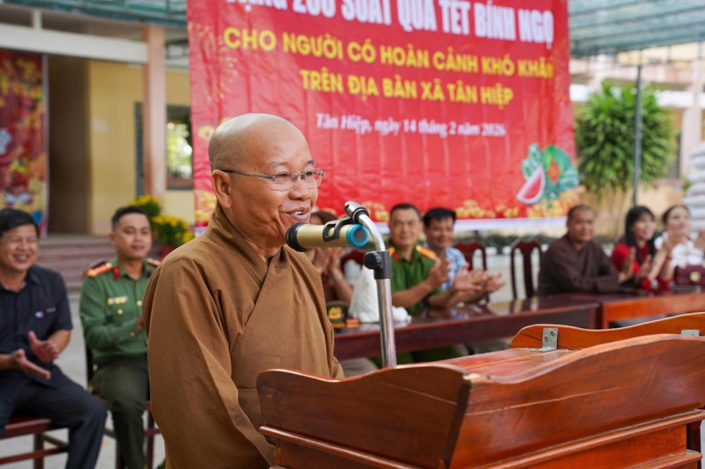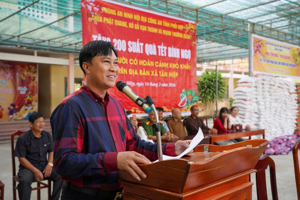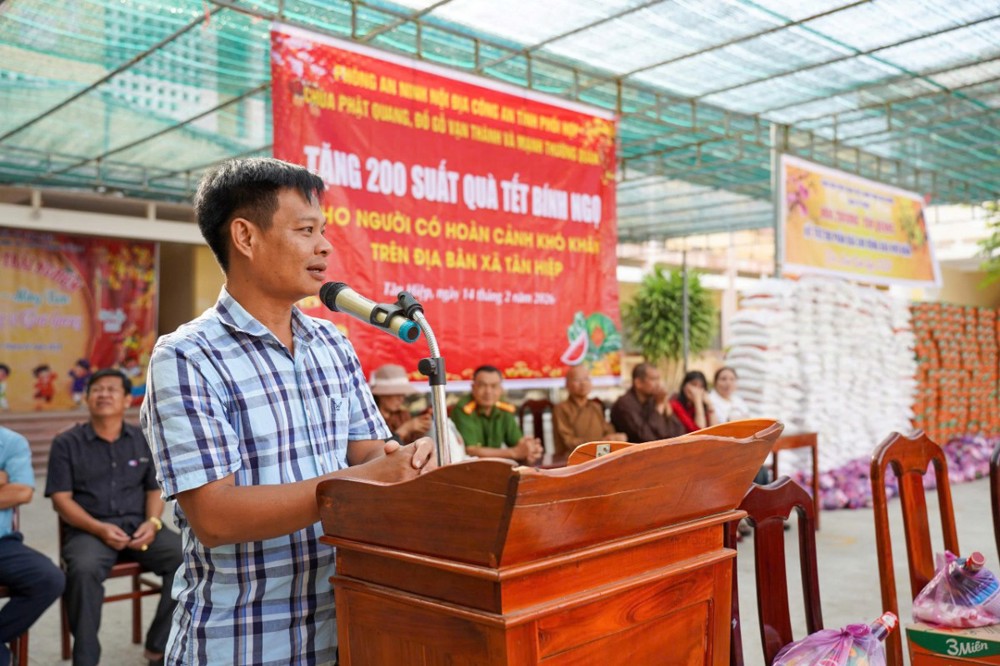 Trước khi trao quà, ông Trương Quang Tình – Chủ nhiệm Ủy ban Kiểm tra Đảng ủy xã Tân Hiệp – bày tỏ sự tri ân đối với Ban Trị sự GHPGVN tỉnh, các đơn vị tài trợ đã quan tâm hỗ trợ người dân địa phương có điều kiện vui xuân đón Tết, đồng thời gửi lời chúc sức khỏe đến bà con.