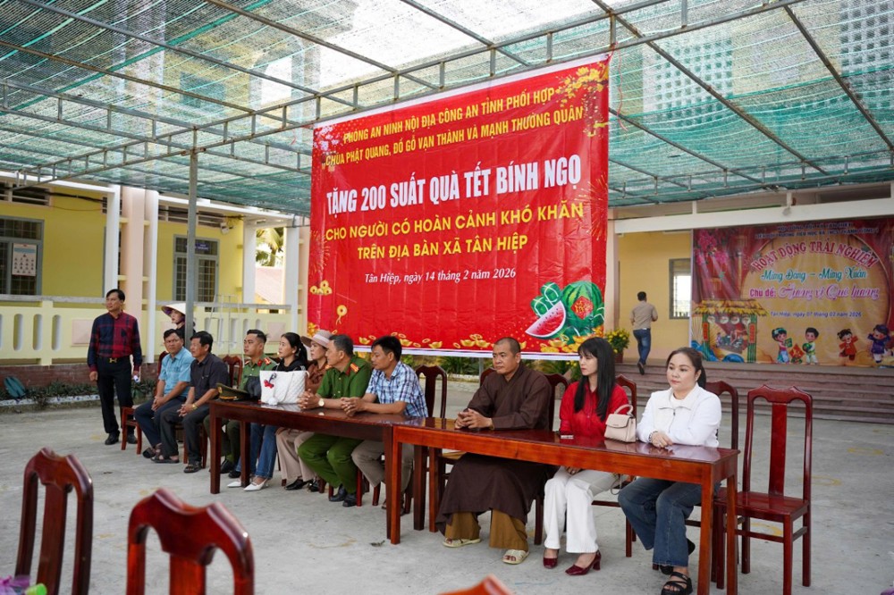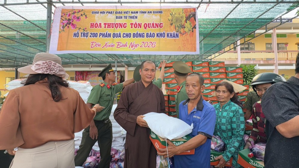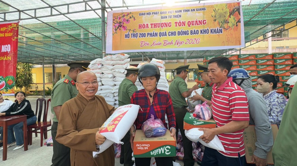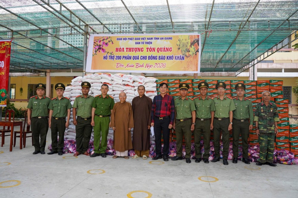 PSO – Ngày 14/2/2026 (nhằm 27 tháng Chạp Âm lịch), chùa Phật Quang (phường Rạch Giá, tỉnh An Giang) phối hợp Phòng An ninh nội địa Công an tỉnh An Giang và Doanh nghiệp đồ gỗ Vạn Thành tổ chức chương trình trao tặng 200 phần quà Tết cho các hộ có hoàn cảnh khó khăn trên địa bàn.