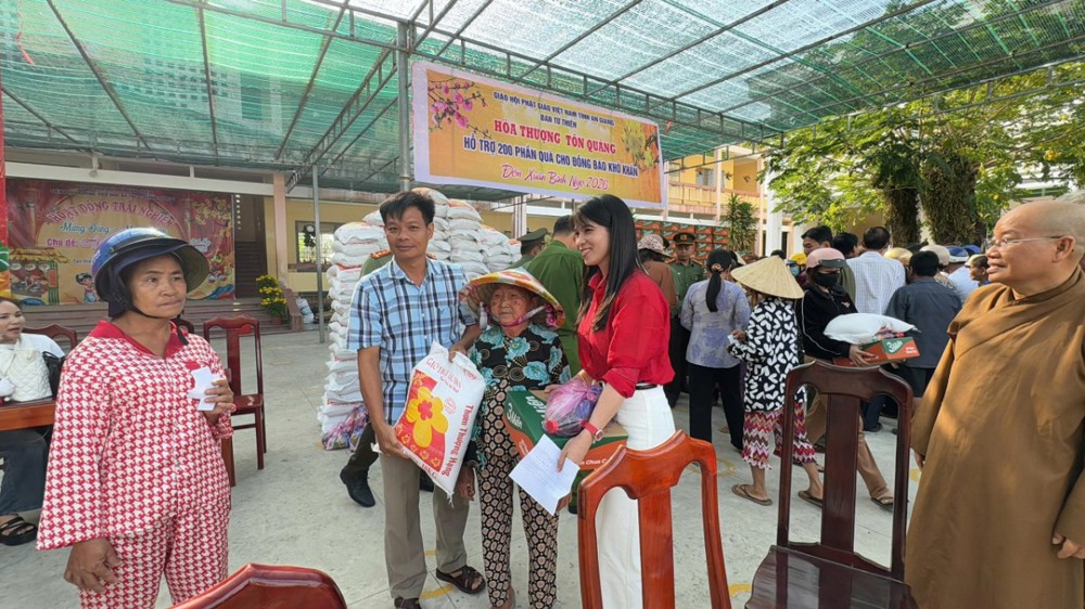 Đại diện người dân nhận quà cũng xúc động gửi lời cảm ơn đến chư Tôn đức GHPGVN tỉnh, chính quyền và các nhà hảo tâm đã mang đến sự sẻ chia thiết thực trong dịp cuối năm.