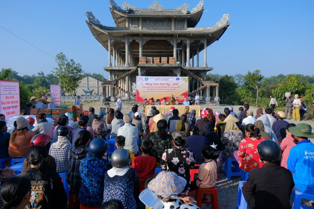 PSO - Nhằm góp phần chăm lo đời sống cho bà con có hoàn cảnh khó khăn trong dịp Tết cổ truyền, sáng 9/2/2026 (nhằm ngày 22 tháng Chạp năm Ất Tỵ), chùa Tân Phước (phường Vĩnh Thông, tỉnh An Giang) đã tổ chức trao tặng 100 phần quà Tết đến các hộ nghèo, cận nghèo trên địa bàn phường Rạch Giá và phường Vĩnh Thông. Buổi trao quà diễn ra trong không khí thân tình, ấm áp, mang đậm nghĩa tình đạo – đời.