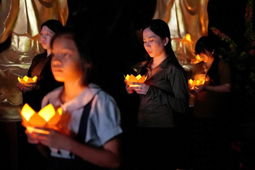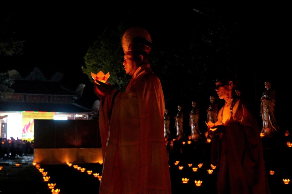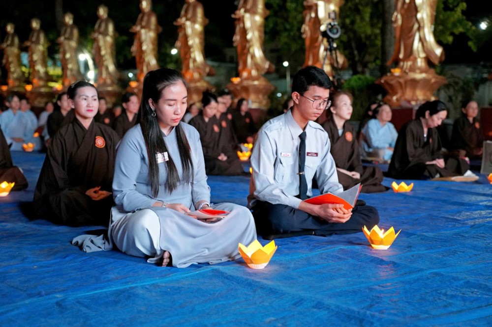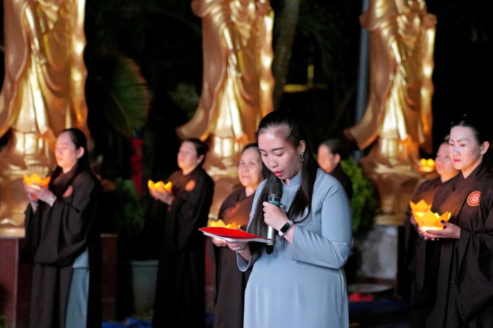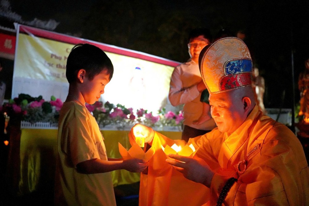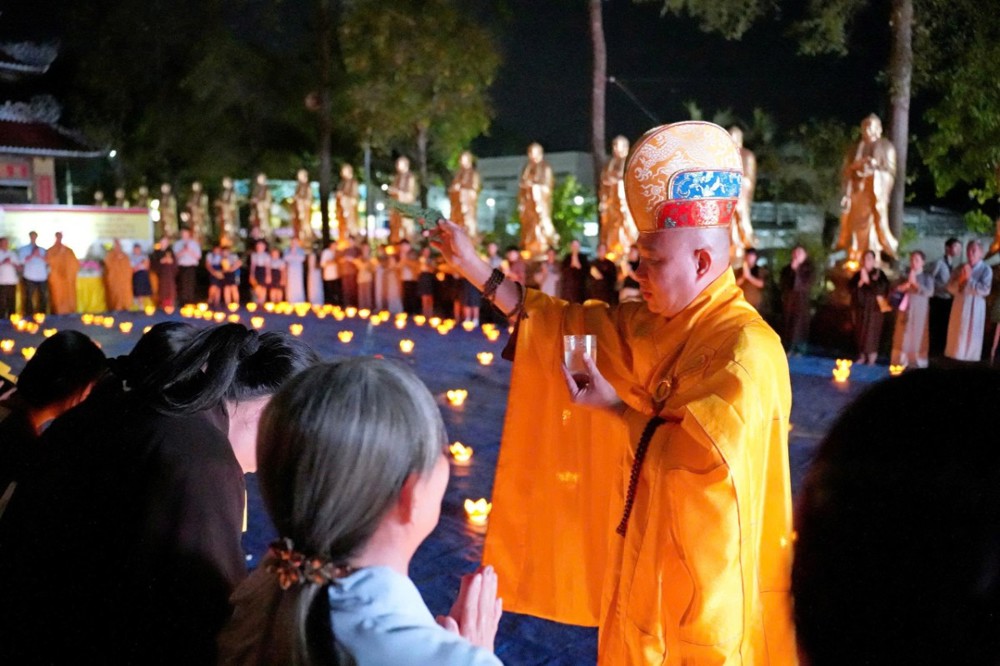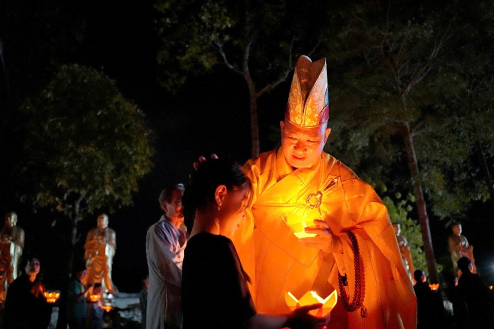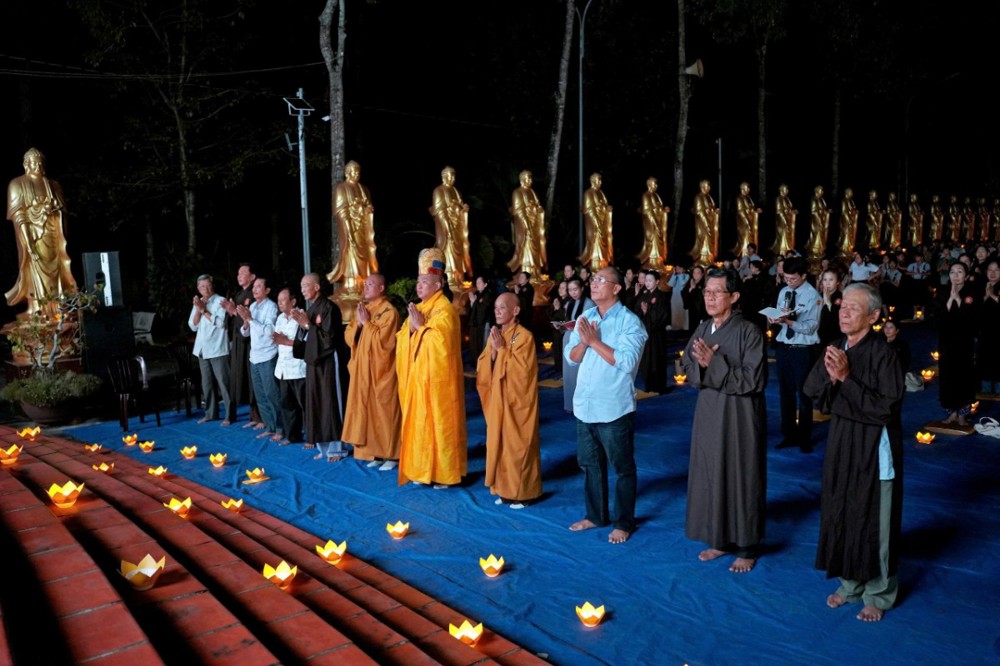 Trong ánh đèn lung linh huyền diệu, đại chúng đã thành kính tham dự các nghi thức sái tịnh – truyền đăng hoa đăng, niệm Phật và kinh hành. Những ngọn nến hoa đăng được thắp sáng, truyền trao từ ngọn lửa thiêng nơi Tam Bảo, tượng trưng cho ánh sáng trí tuệ được tiếp nối, lan tỏa khắp đạo tràng, gửi gắm ước nguyện hòa bình, an vui và hạnh phúc đến muôn loài.