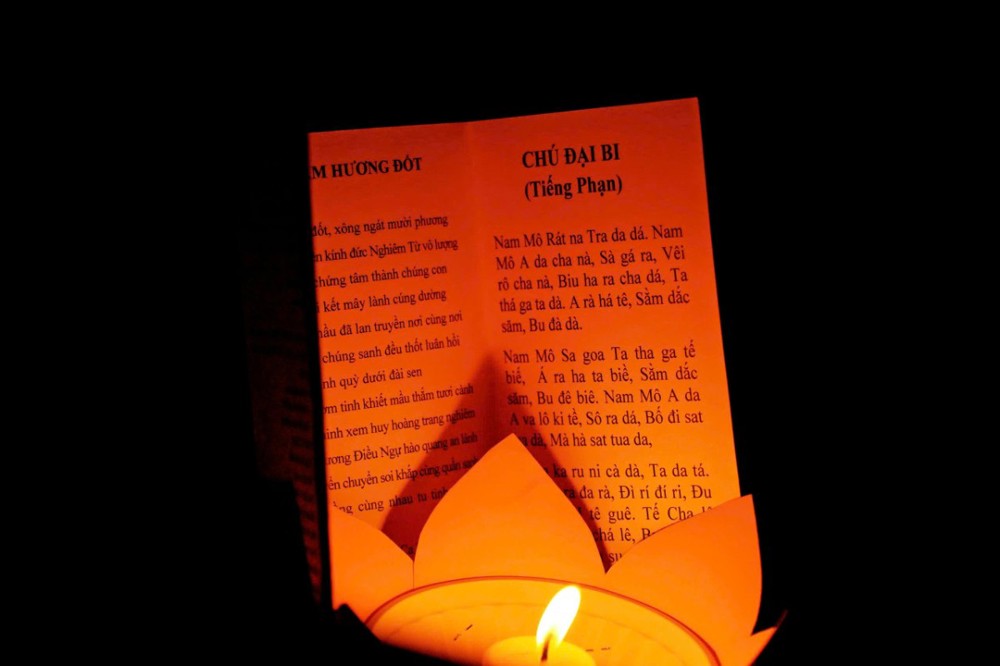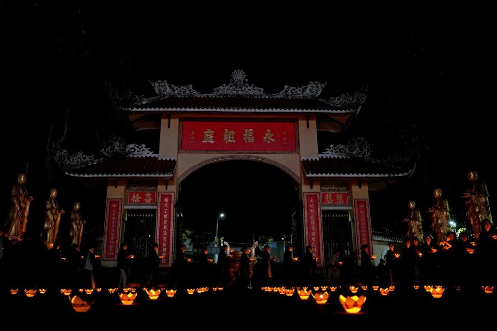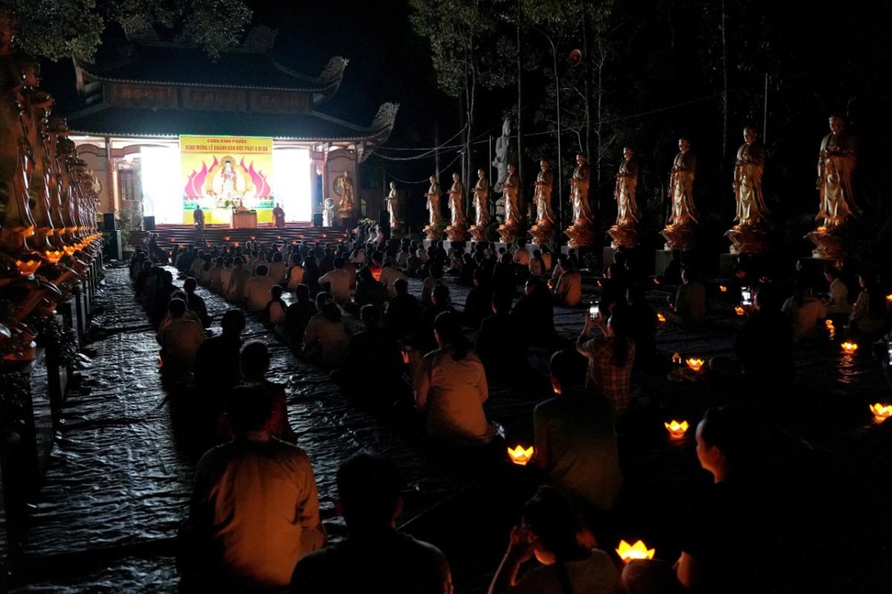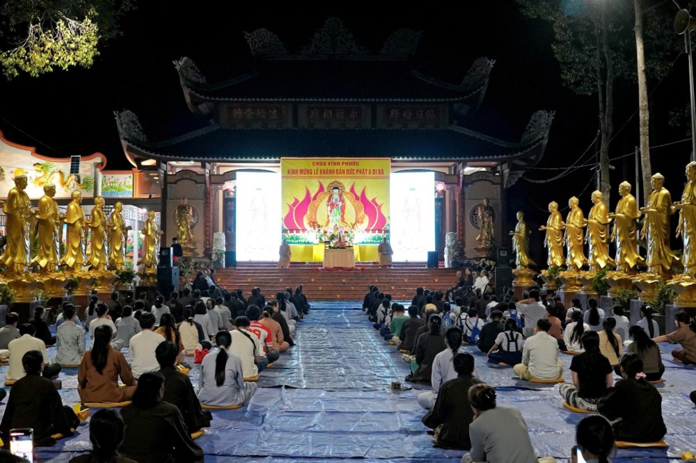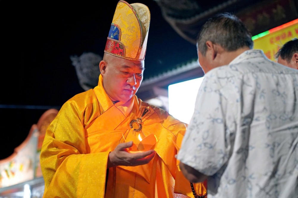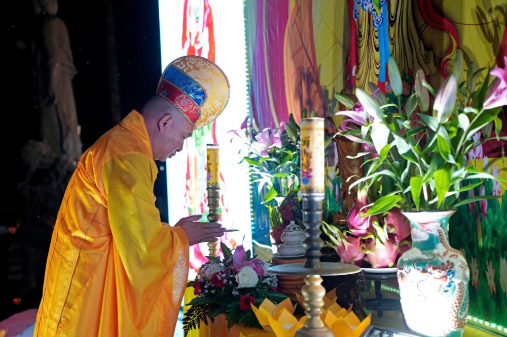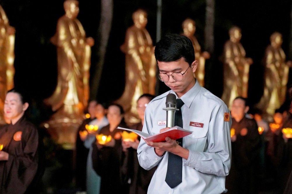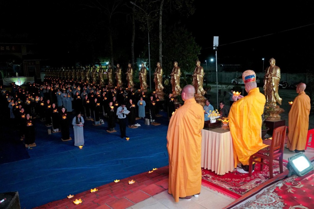 Trong ánh đèn lung linh huyền diệu, đại chúng đã thành kính tham dự các nghi thức sái tịnh – truyền đăng hoa đăng, niệm Phật và kinh hành. Những ngọn nến hoa đăng được thắp sáng, truyền trao từ ngọn lửa thiêng nơi Tam Bảo, tượng trưng cho ánh sáng trí tuệ được tiếp nối, lan tỏa khắp đạo tràng, gửi gắm ước nguyện hòa bình, an vui và hạnh phúc đến muôn loài.