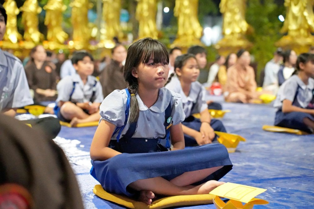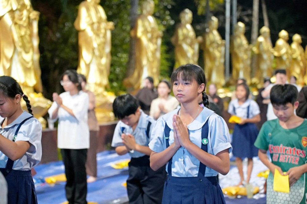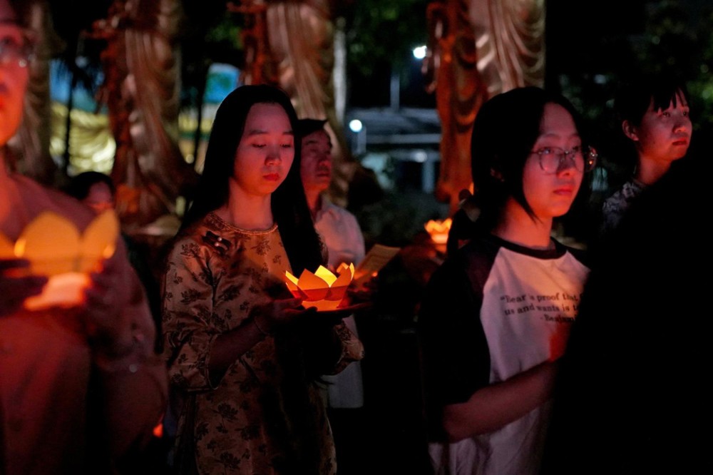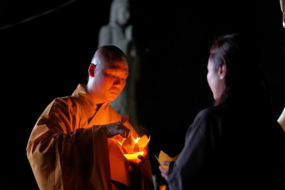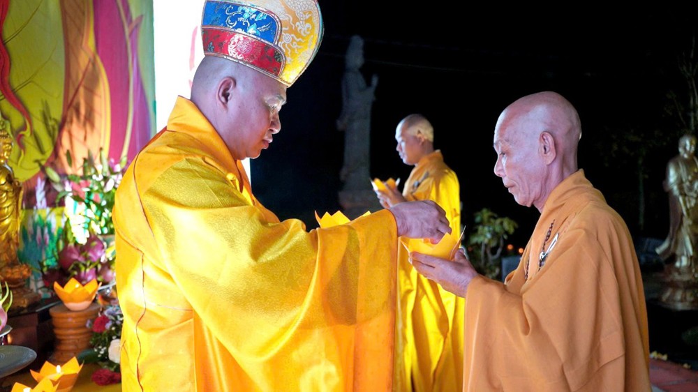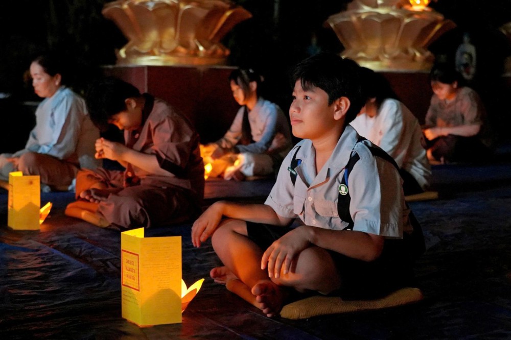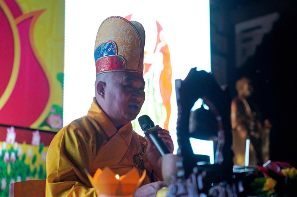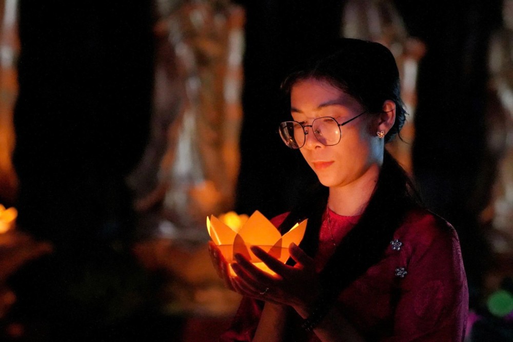 Trong ánh đèn lung linh huyền diệu, đại chúng đã thành kính tham dự các nghi thức sái tịnh – truyền đăng hoa đăng, niệm Phật và kinh hành. Những ngọn nến hoa đăng được thắp sáng, truyền trao từ ngọn lửa thiêng nơi Tam Bảo, tượng trưng cho ánh sáng trí tuệ được tiếp nối, lan tỏa khắp đạo tràng, gửi gắm ước nguyện hòa bình, an vui và hạnh phúc đến muôn loài.