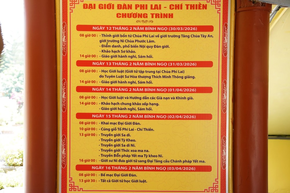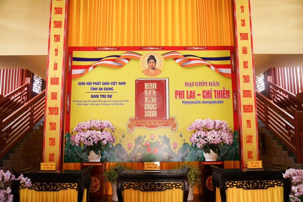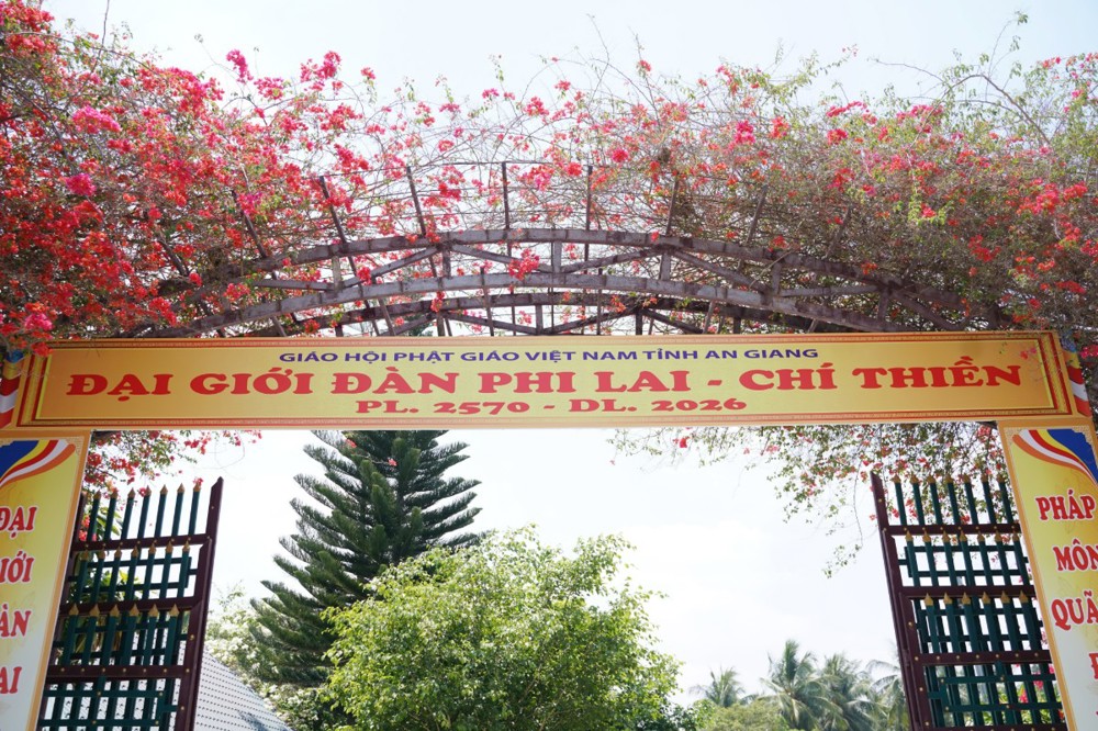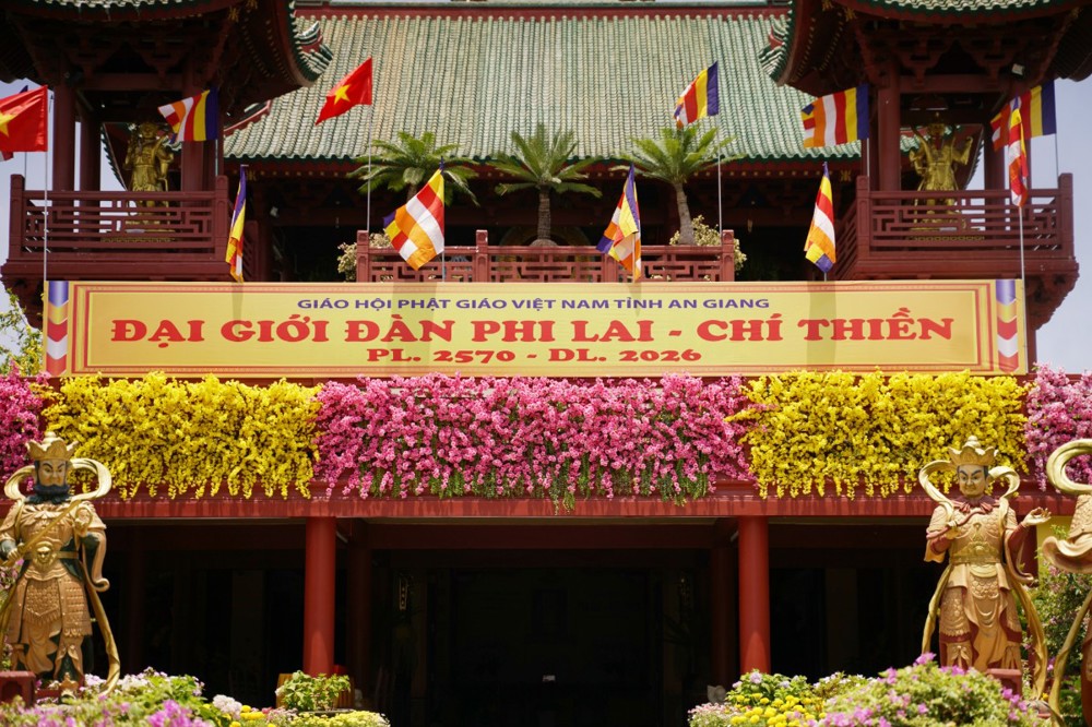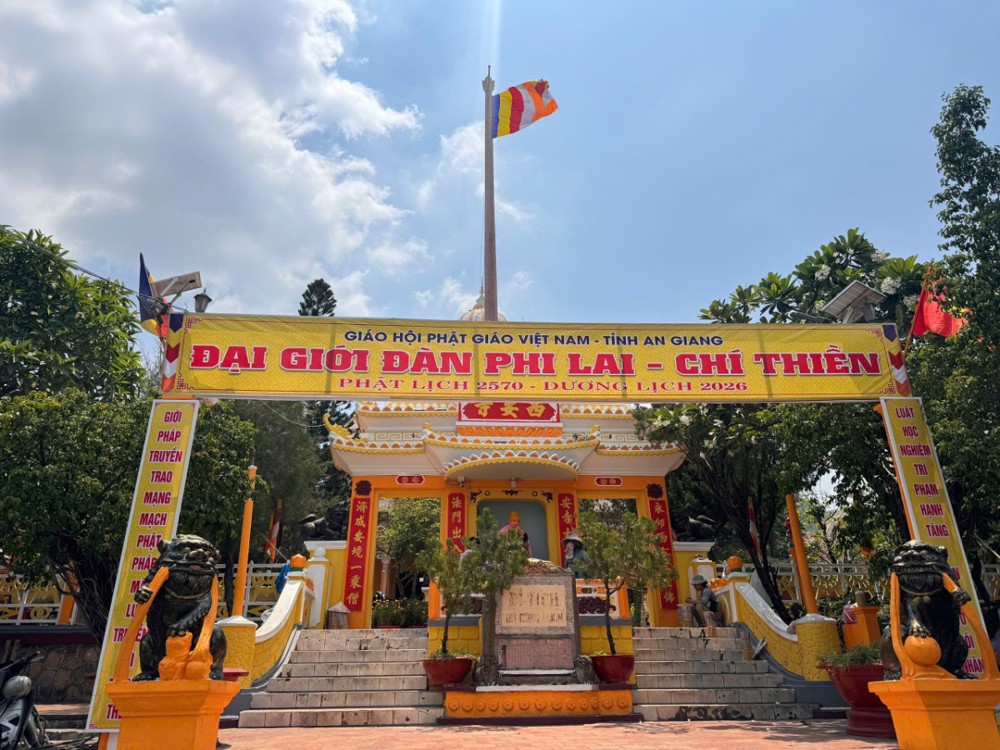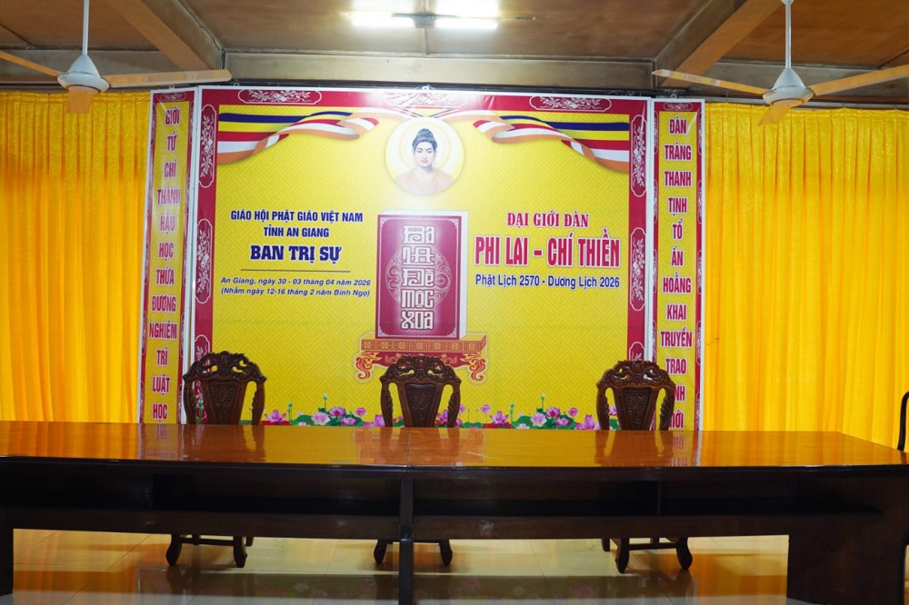 Tại Tổ đình Phi Lai (phường Chi Lăng, tỉnh An Giang) – địa điểm chính diễn ra Đại Giới đàn, các khâu trang trí như cổng chùa, lễ trường khai mạc, khu vực khảo hạch giới tử đã được hoàn thiện. Cờ hoa, băng rôn được trang hoàng trang nghiêm, tạo không khí thanh tịnh, sẵn sàng đón chào giới tử thập phương.