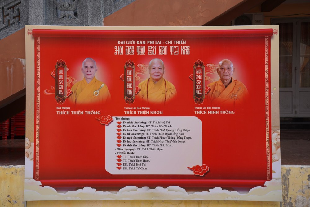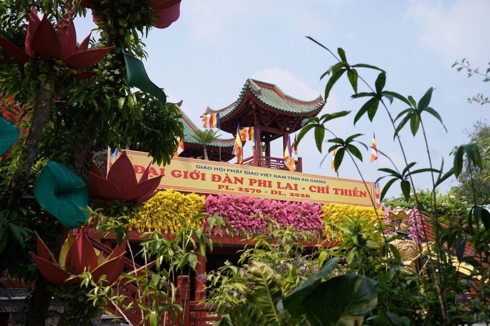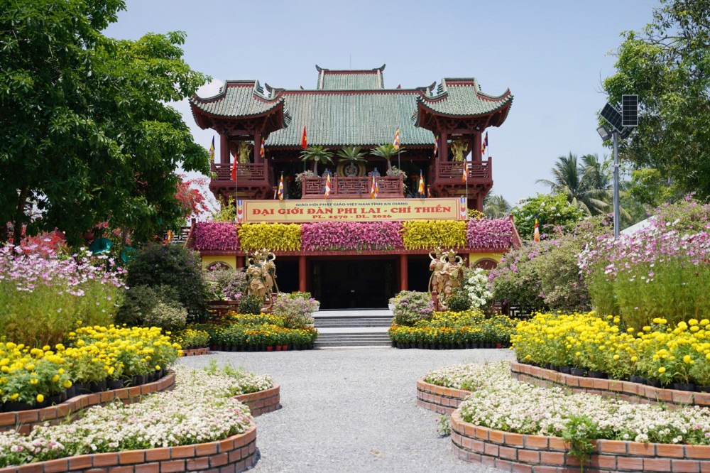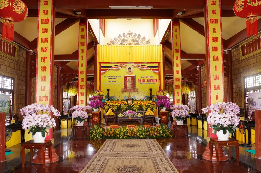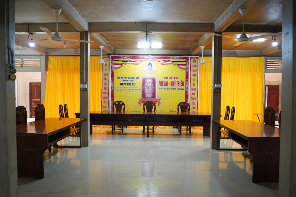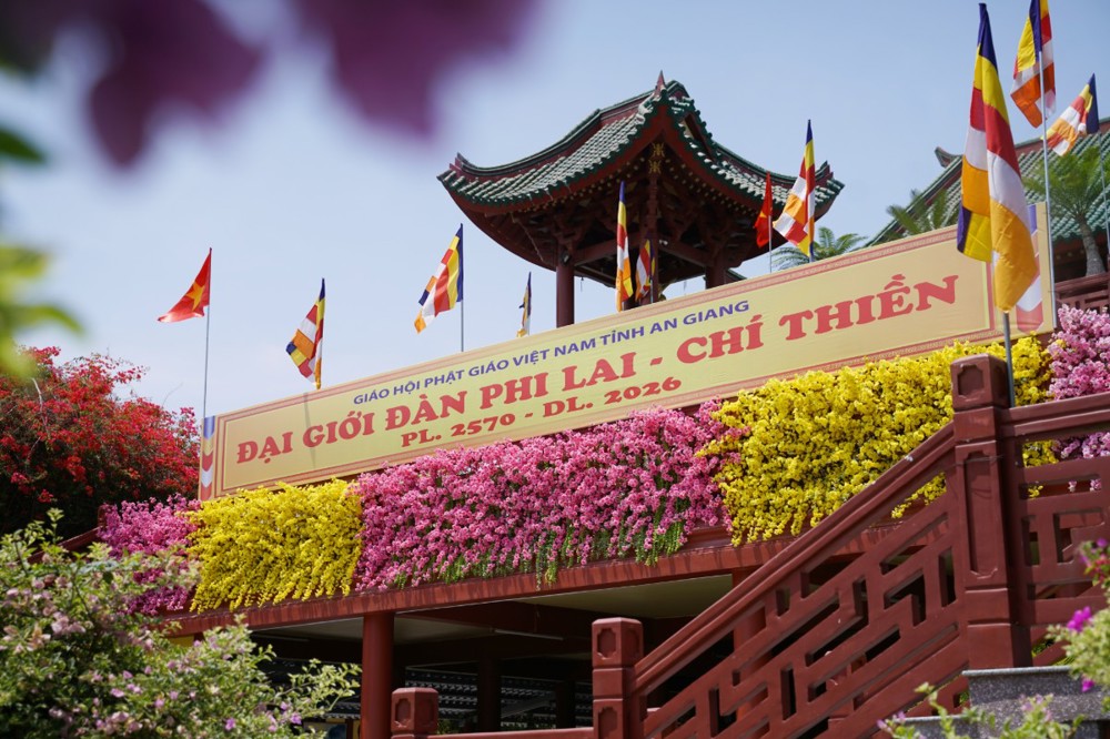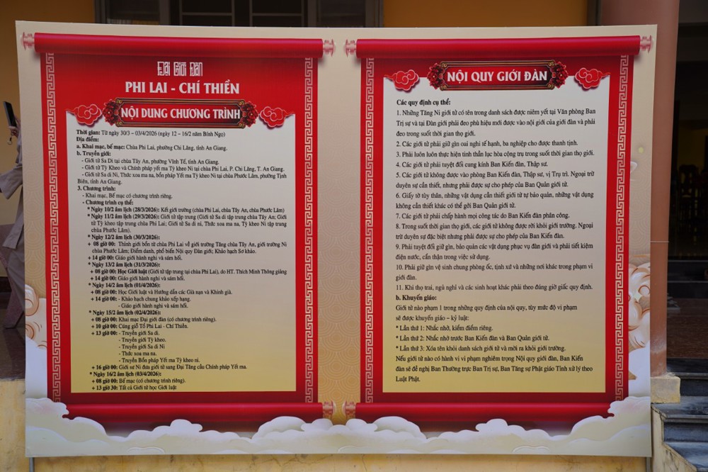 Tại Tổ đình Phi Lai (phường Chi Lăng, tỉnh An Giang) – địa điểm chính diễn ra Đại Giới đàn, các khâu trang trí như cổng chùa, lễ trường khai mạc, khu vực khảo hạch giới tử đã được hoàn thiện. Cờ hoa, băng rôn được trang hoàng trang nghiêm, tạo không khí thanh tịnh, sẵn sàng đón chào giới tử thập phương.