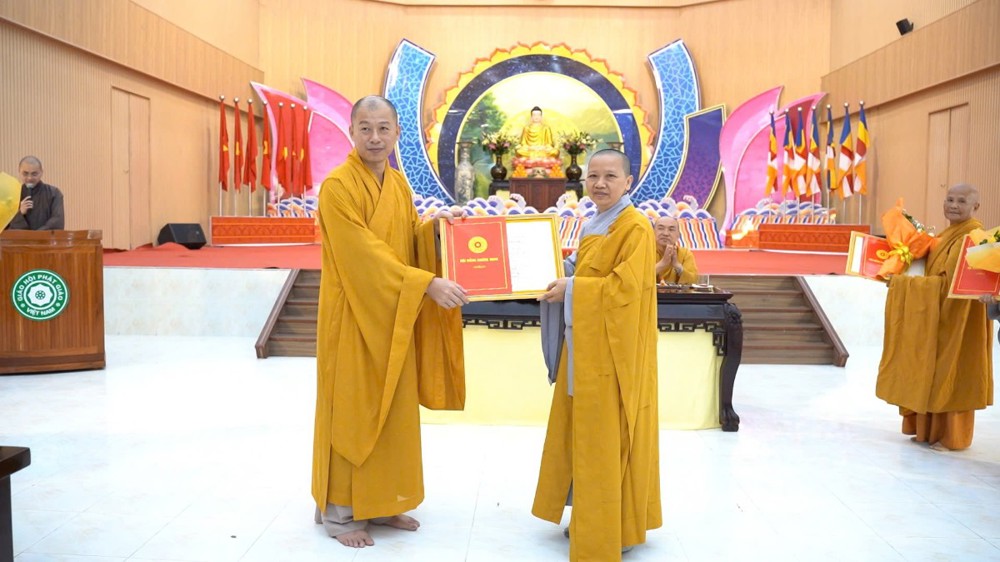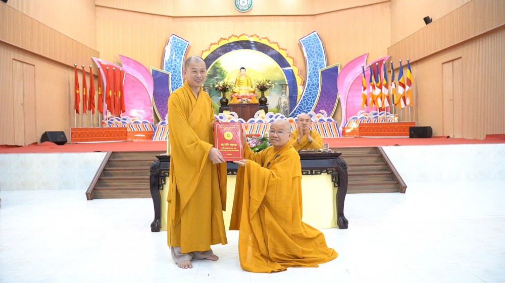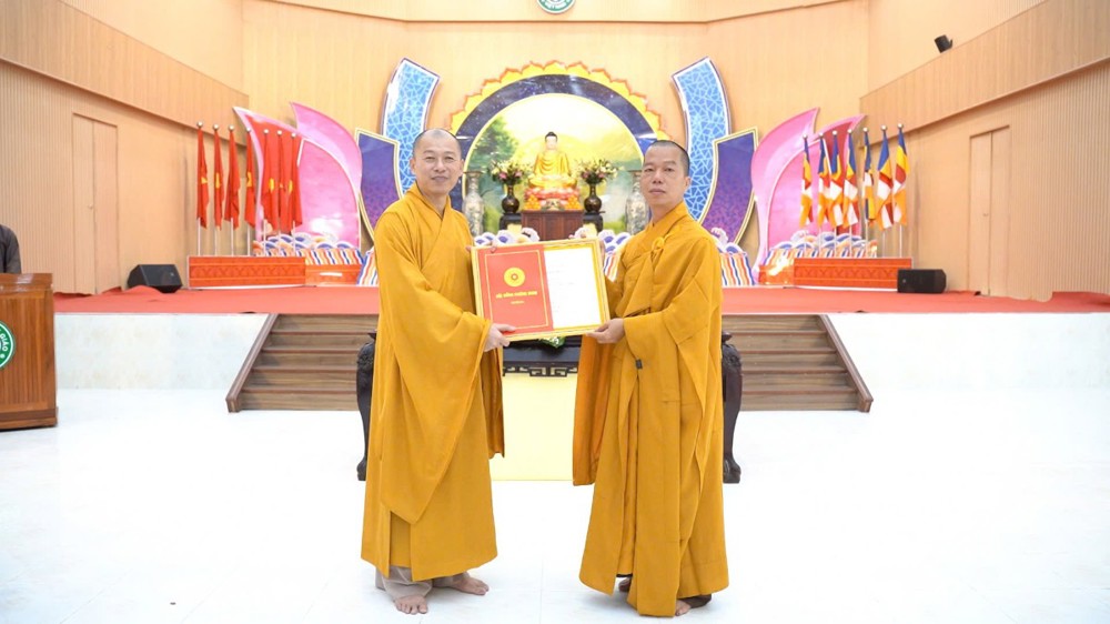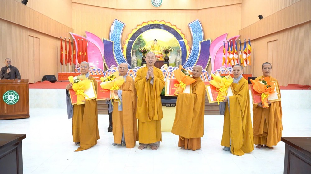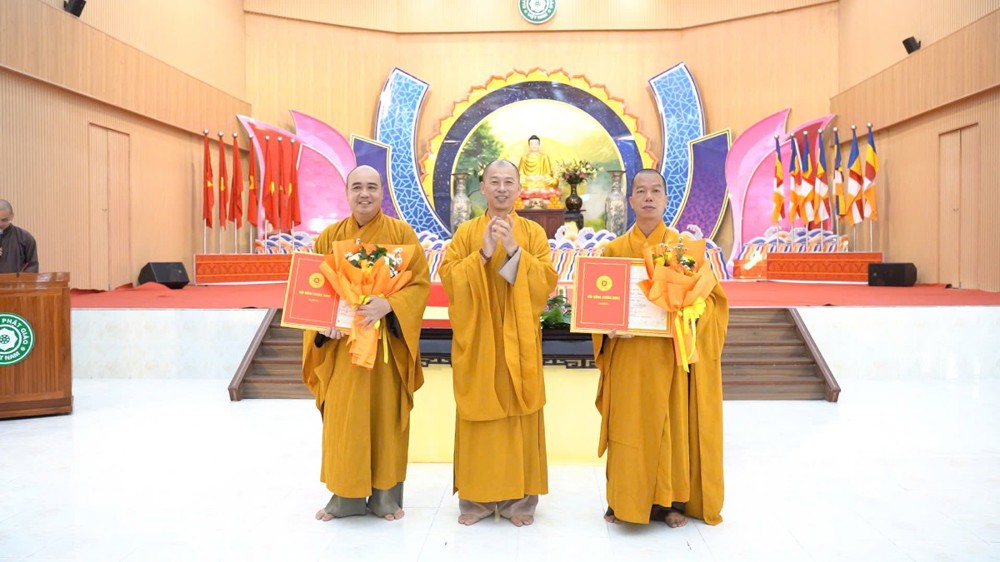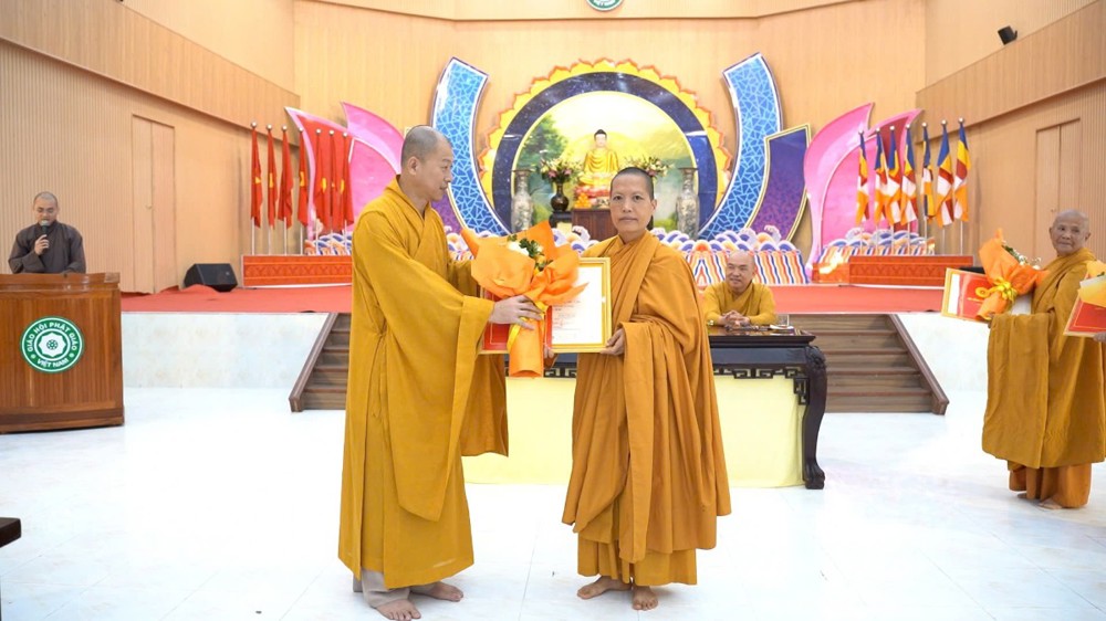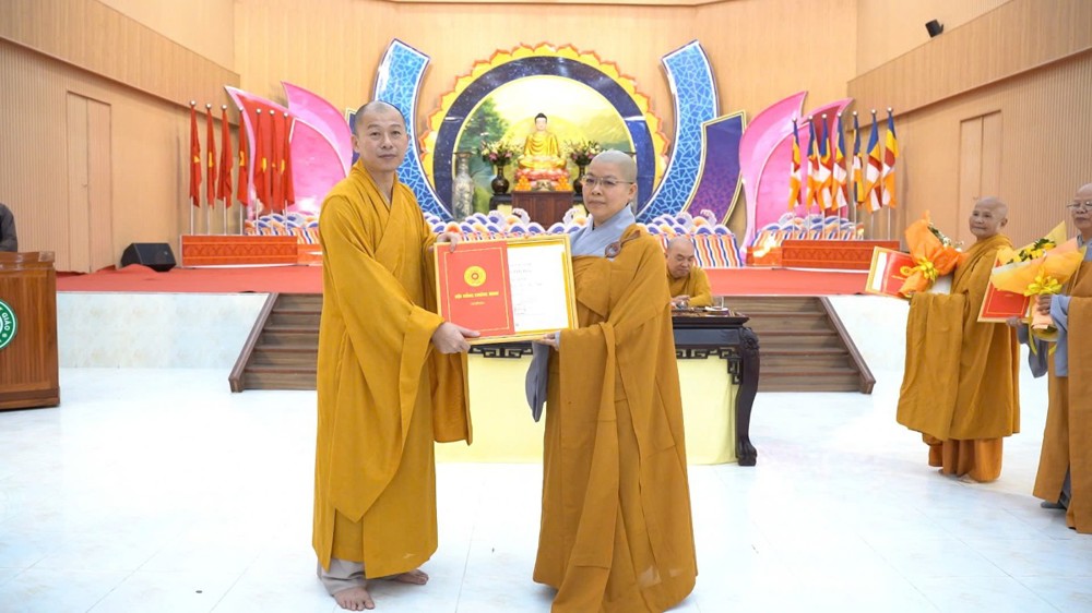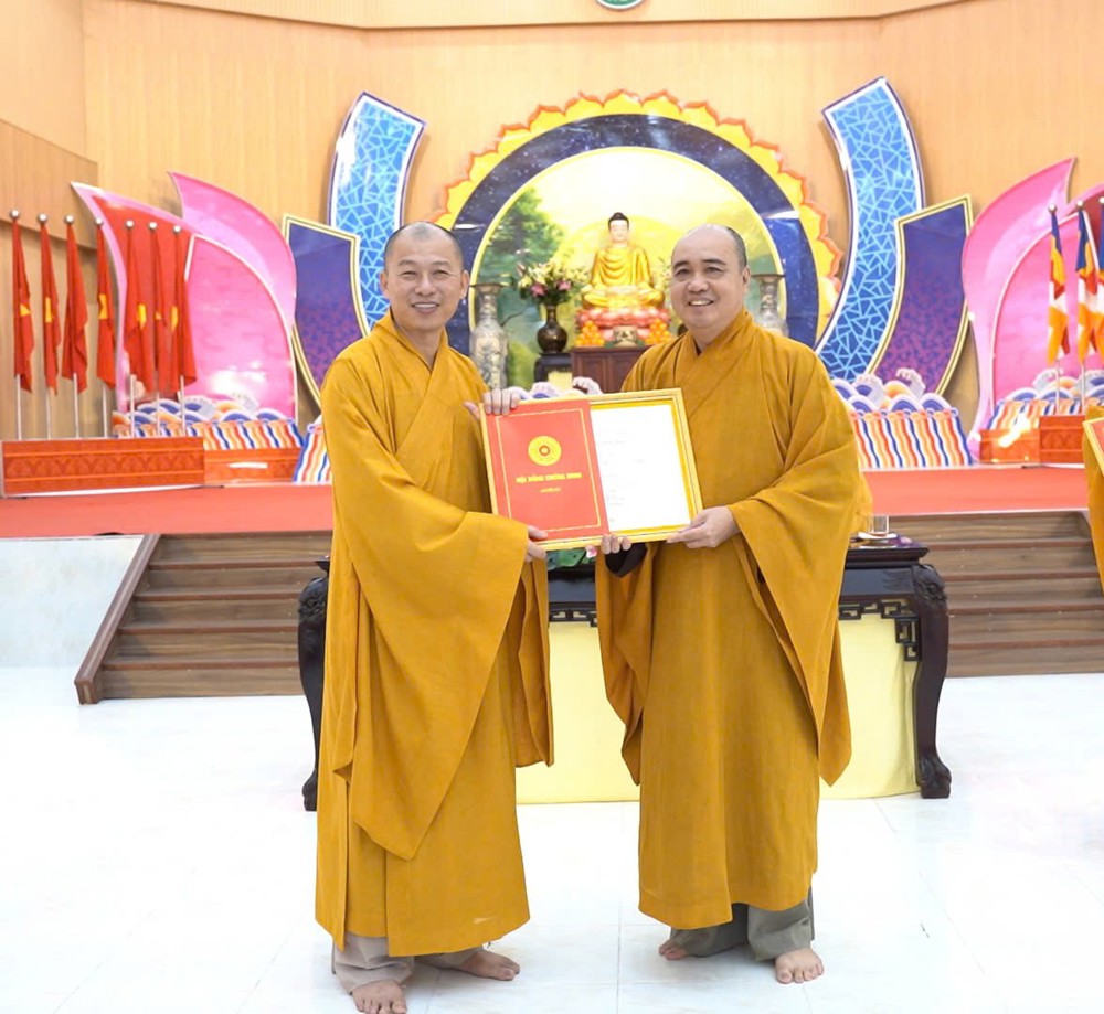 Thượng tọa Thích Minh Nhẫn đã trao Quyết định và tặng hoa chúc mừng, ghi nhận quá trình tu học, hành đạo và đóng góp của chư Tôn đức đối với Giáo hội.
