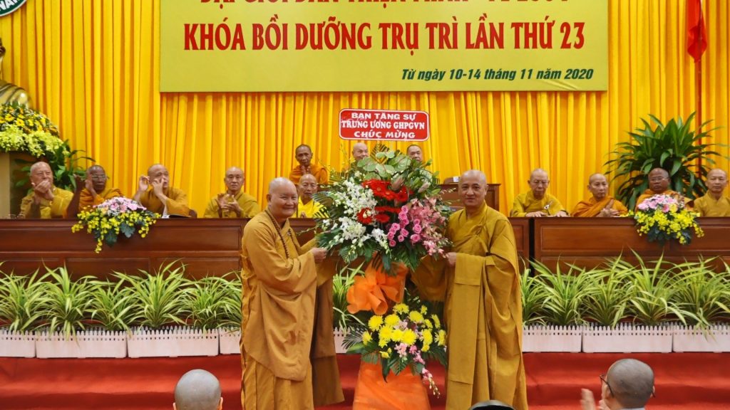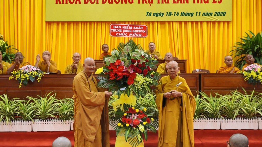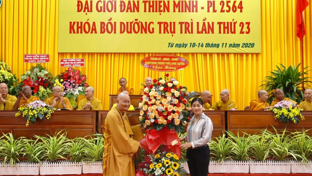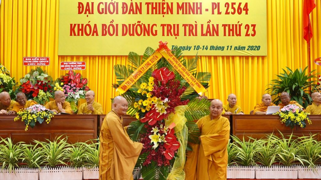 Đại diện giới tử dâng lời phát nguyện, luôn cố gắng tinh cần tu học để xứng đáng là sứ giả của Như lai mà truyền thừa mạng mạch Phật Pháp. Ban tổ chức cũng đón nhận những lẵng hoa và quà của HĐTS, các ban viện, chính quyền trao tặng.