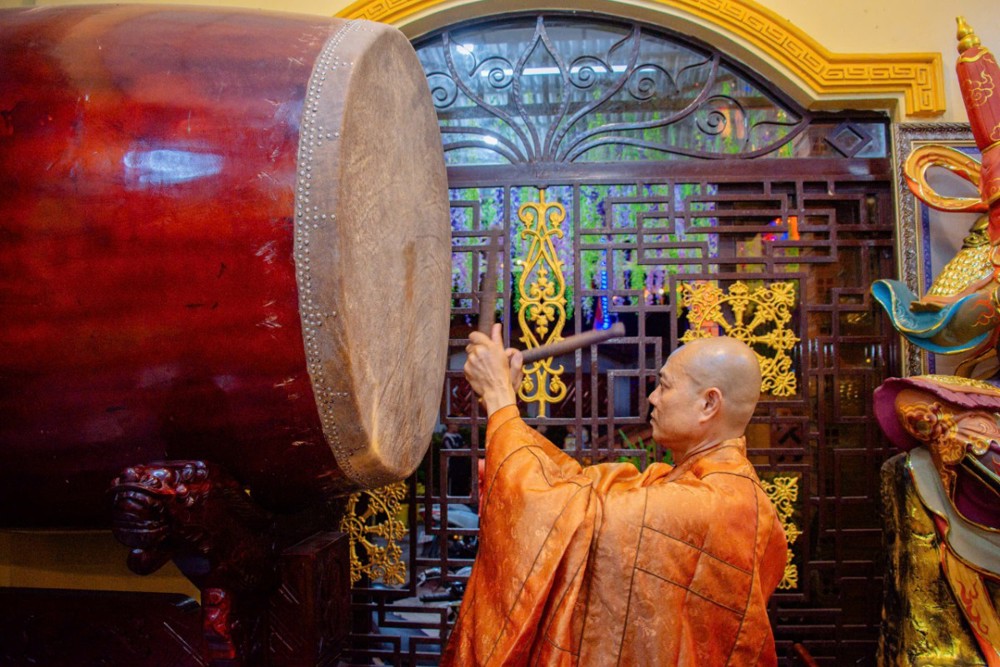 Đúng thời khắc thiêng liêng, sau nghi thức niêm hương tại Tổ đường, Thượng tọa trụ trì Thích Thiện Đức quang lâm chánh điện, cử hành khóa lễ khai kinh bạch Phật, khai chung bảng và trì tụng Kinh Dược Sư Bổn Nguyện Công Đức. Tiếng chuông bảng ngân vang trong đêm xuân tĩnh lặng như đánh thức tâm thức mỗi người con Phật, nhắc nhở quay về nương tựa Tam bảo, gieo trồng thiện nghiệp trong năm mới.