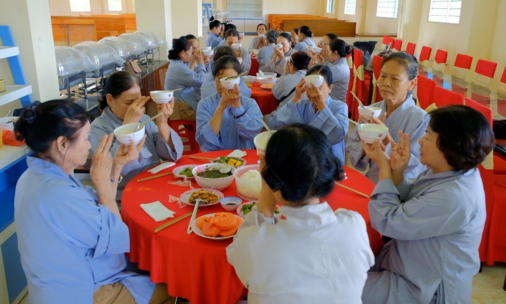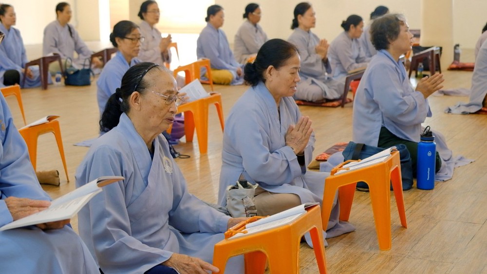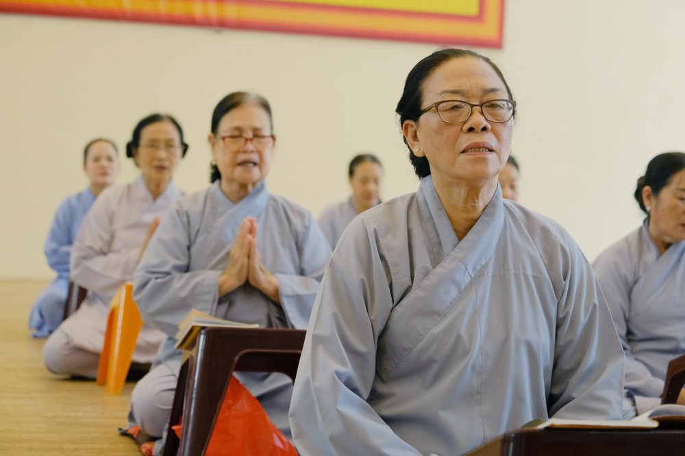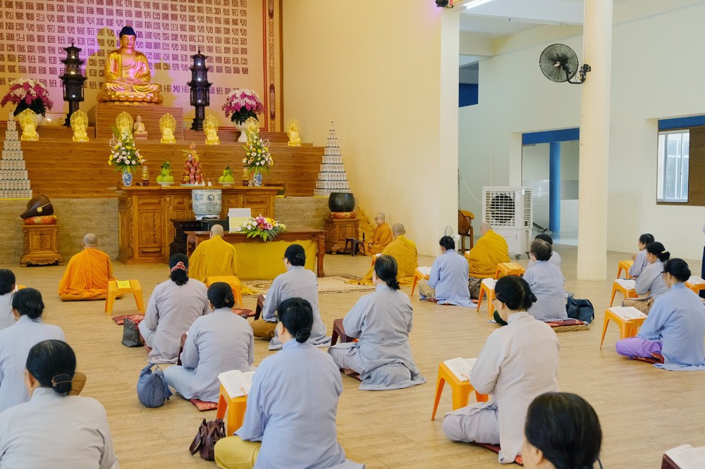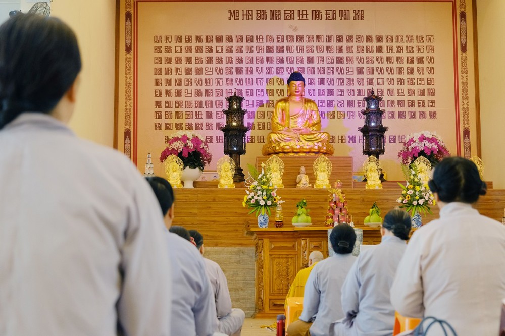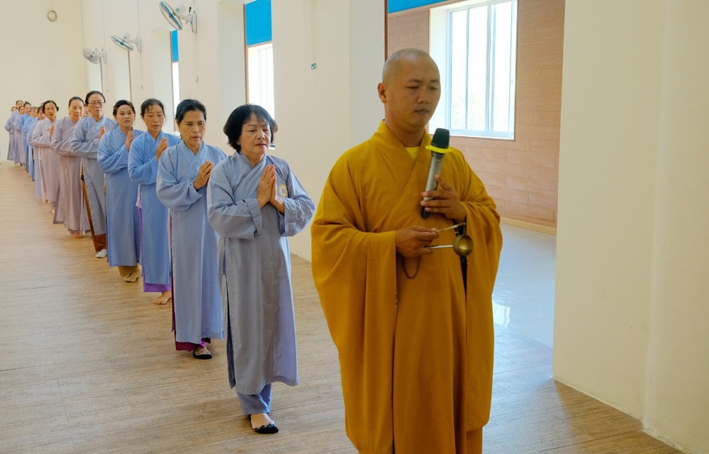 Buổi sáng, đại chúng được Đại đức Thích Tuệ Túc, Phó ban Hướng dẫn Phật tử GHPGVN tỉnh An Giang hướng dẫn truyền giới Bát quan trai, tiếp đến là thời tụng kinh Sám hối, lạy Phật Hồng danh và trì tụng Kinh Địa Tạng (phẩm thứ 7). Không khí tu học trang nghiêm, thanh tịnh, giúp hành giả gột rửa phiền não, làm mới thân tâm.