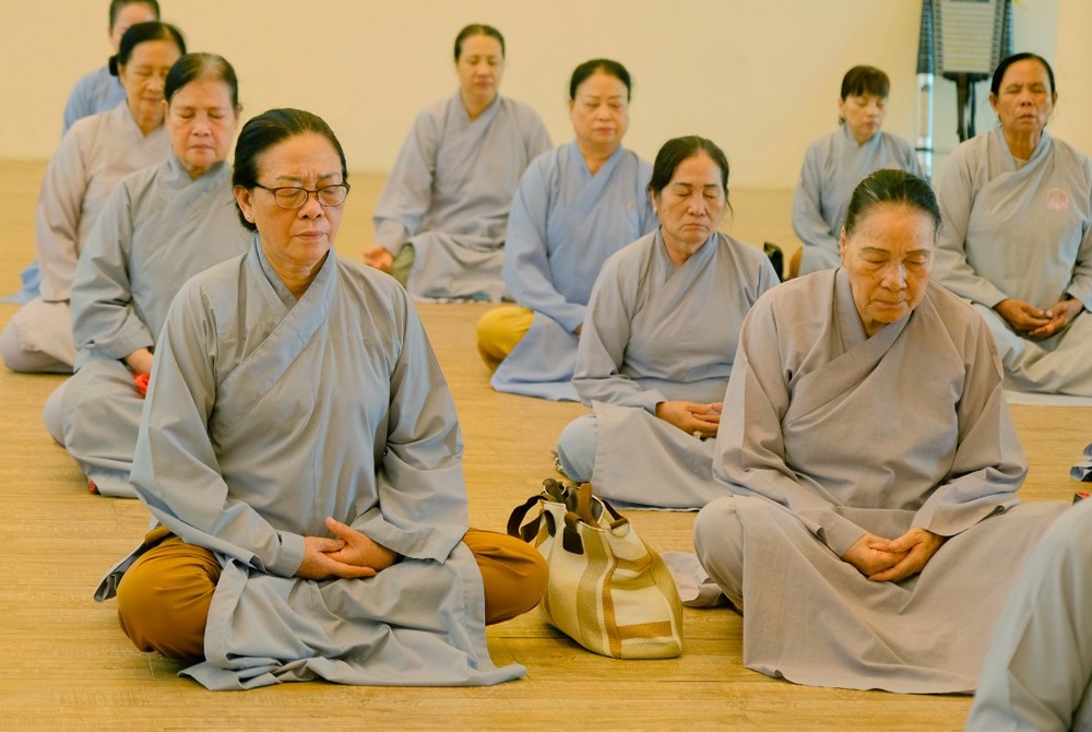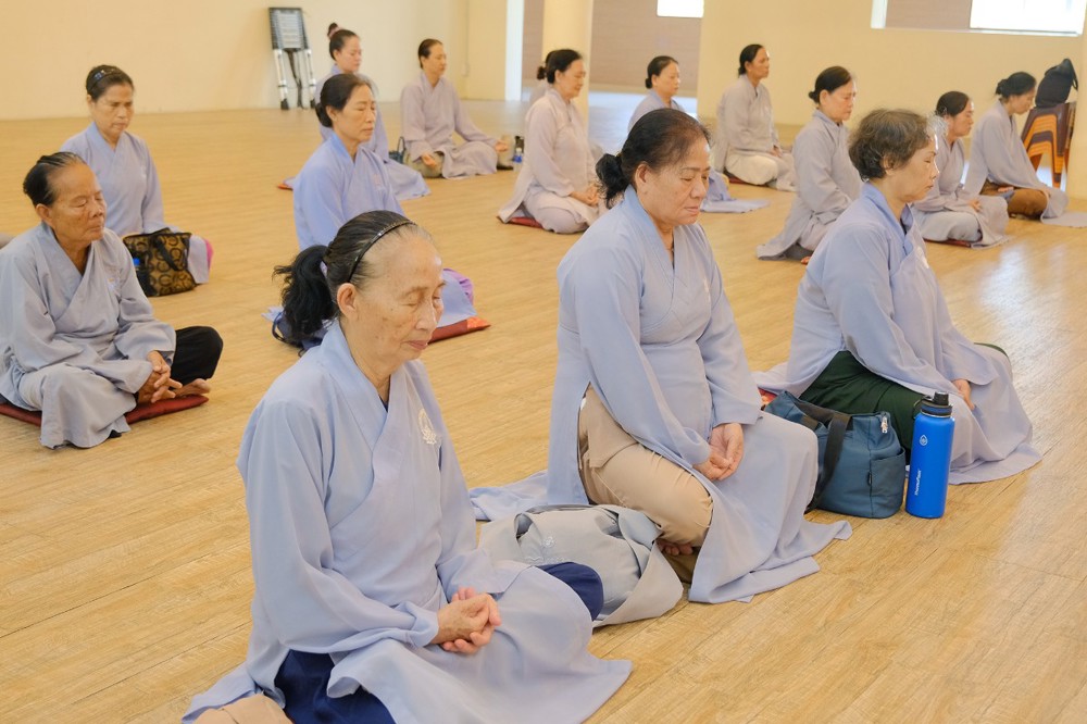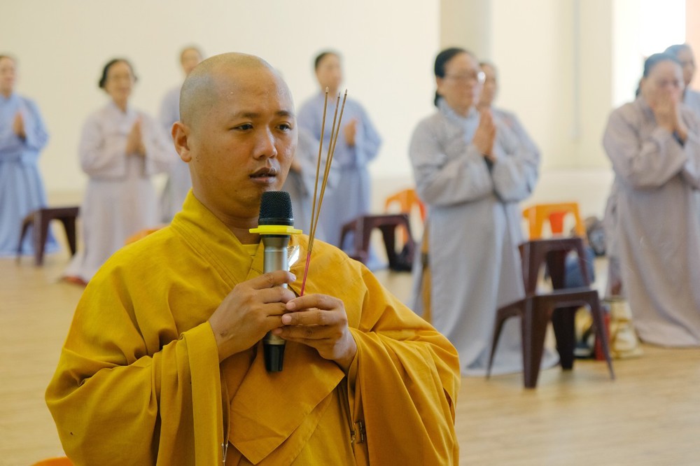 Buổi chiều, đại chúng tham dự thời thiền tọa và nghe pháp thoại do Thượng tọa Thích Minh Nhẫn thuyết giảng, với nội dung sâu sắc, gần gũi, giúp Phật tử hiểu rõ hơn ý nghĩa của việc giữ giới, hành thiền và ứng dụng Phật pháp trong đời sống hằng ngày.