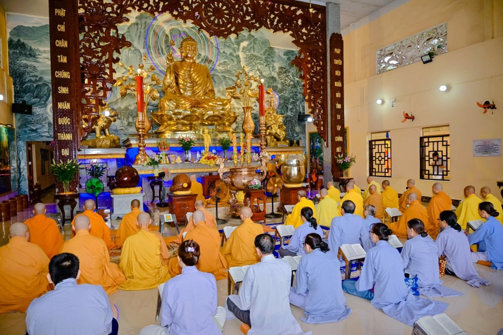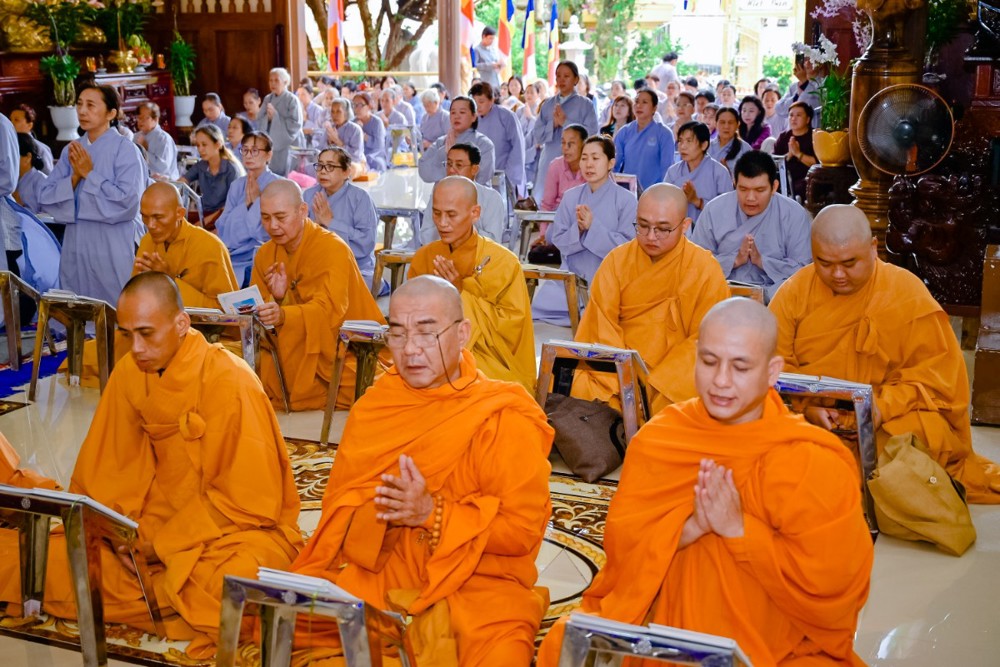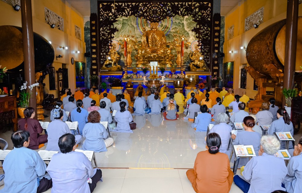 Mở đầu là nghi thức niệm hương – cúng ngọ Phật dưới sự chủ sám của chư Tôn đức ban nghi lễ. Trong bầu không khí thanh tịnh và thành kính, toàn thể đại chúng đã nhất tâm trì tụng Kinh Di Giáo, nguyện cầu Giác linh Cố Ni sư cao đăng thượng phẩm, quả chứng vô sanh, tiếp tục gia hộ cho đạo tràng ngày một hưng long.