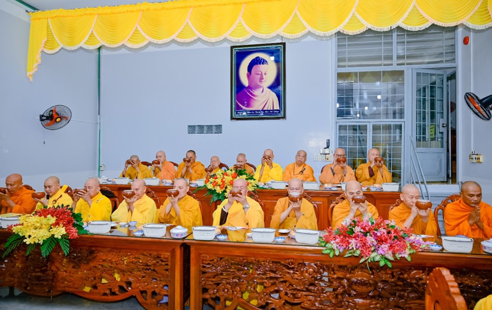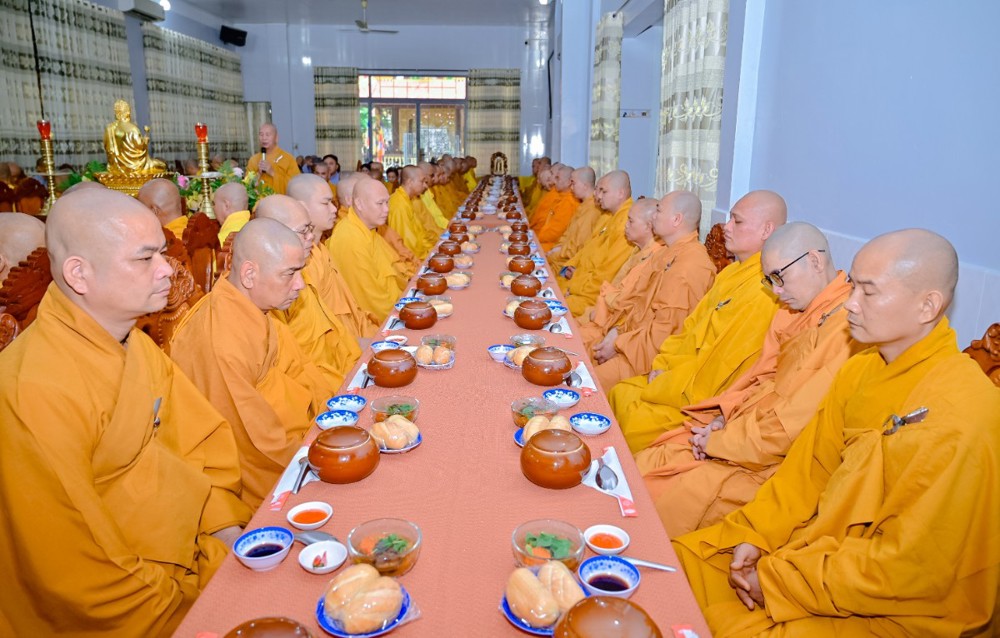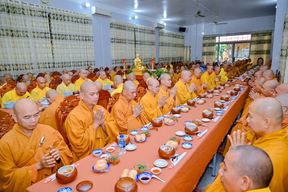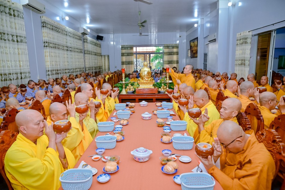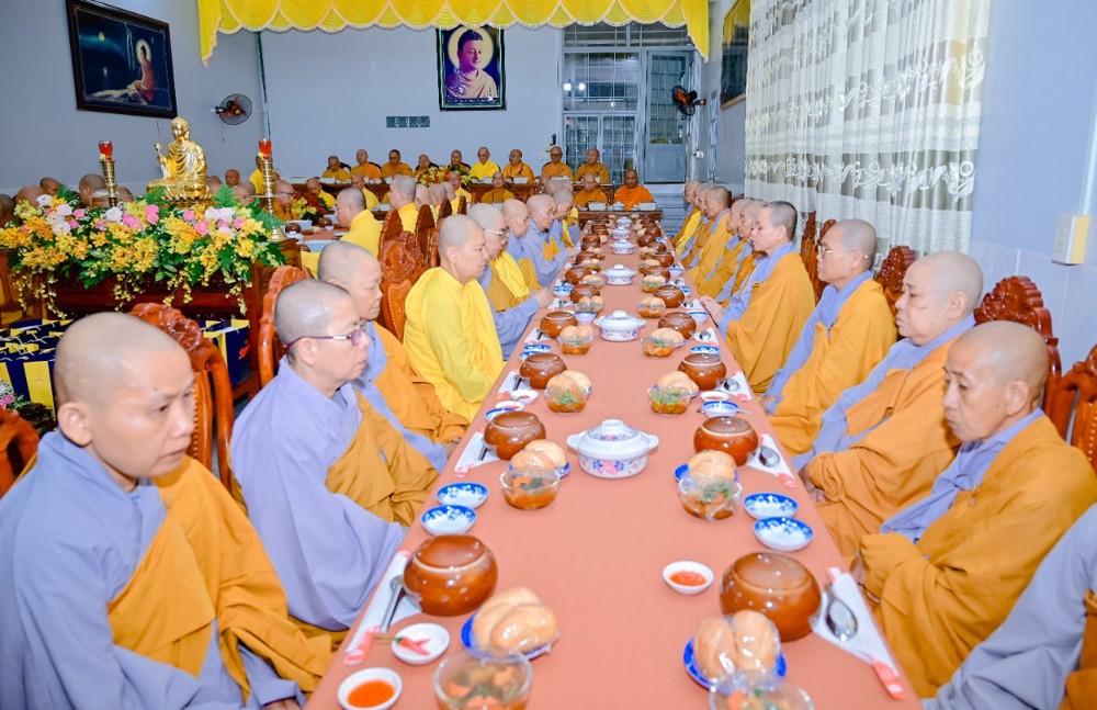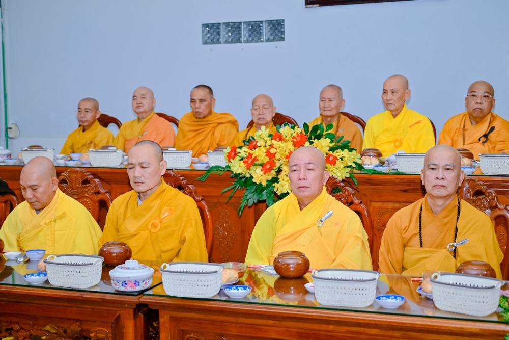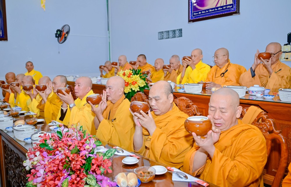 Tiếp đó, cung đối trước chư Tôn đức chứng minh, Thượng tọa Thích Chơn Nghĩa, Trụ trì Tịnh thất Trúc Lâm, thay mặt môn đồ hiếu quyến dâng lời tác bạch cúng dường trai tăng, bày tỏ lòng tri ân sâu sắc đối với chư Tôn thiền đức đã quang lâm chứng minh và hộ trì cho buổi lễ.