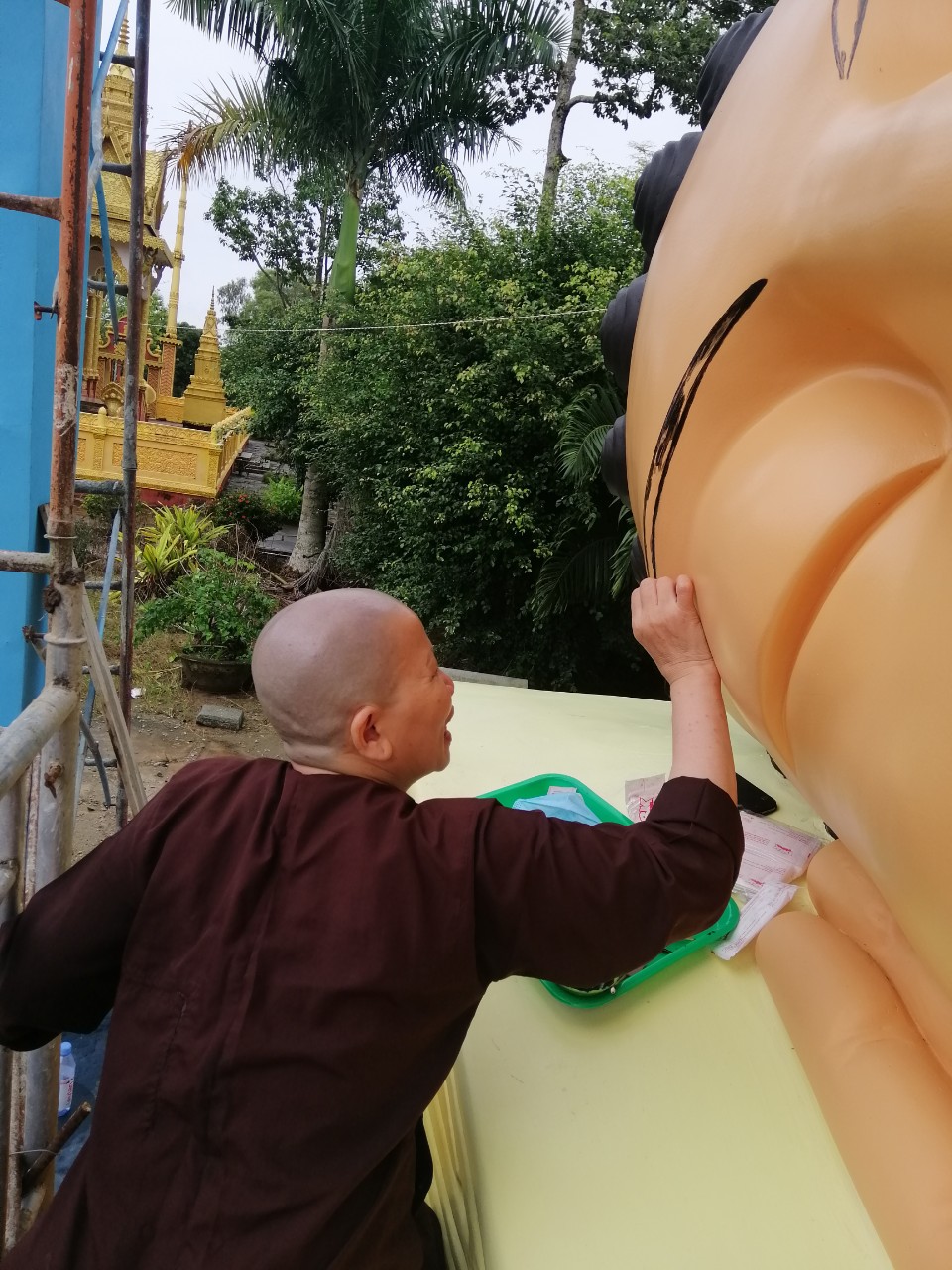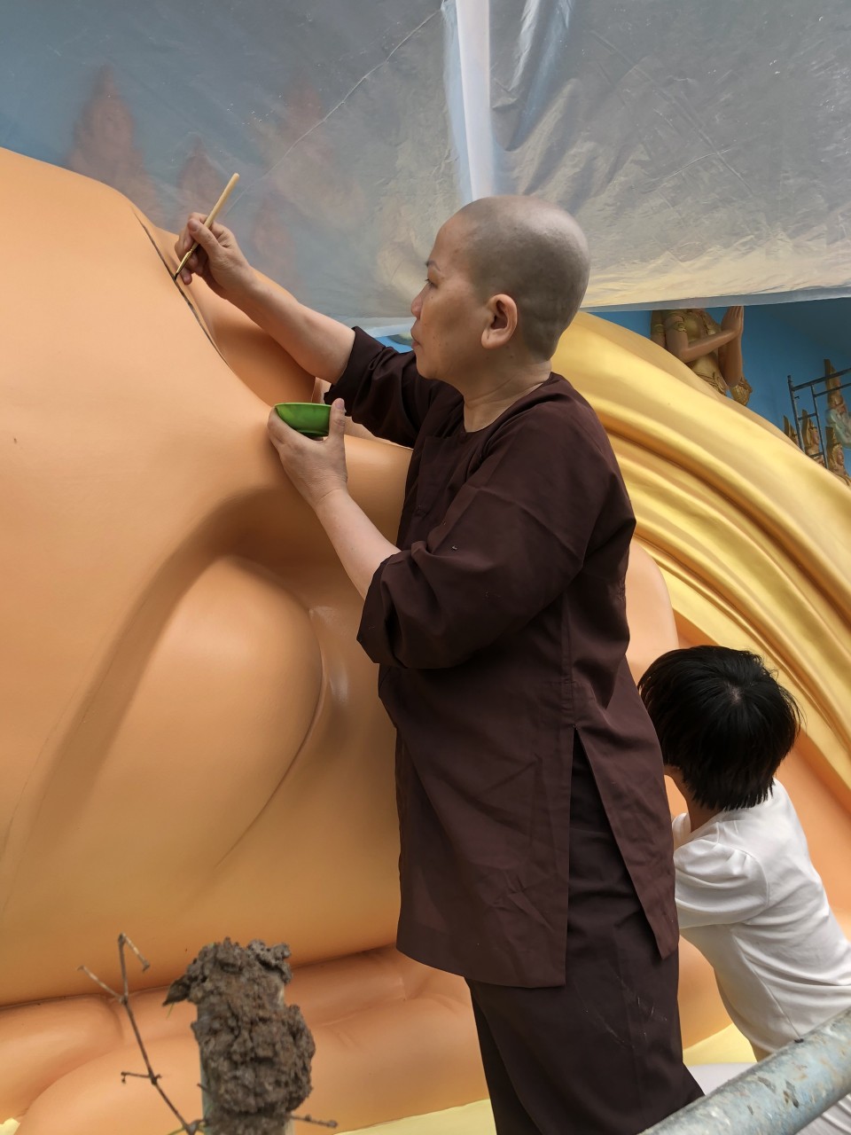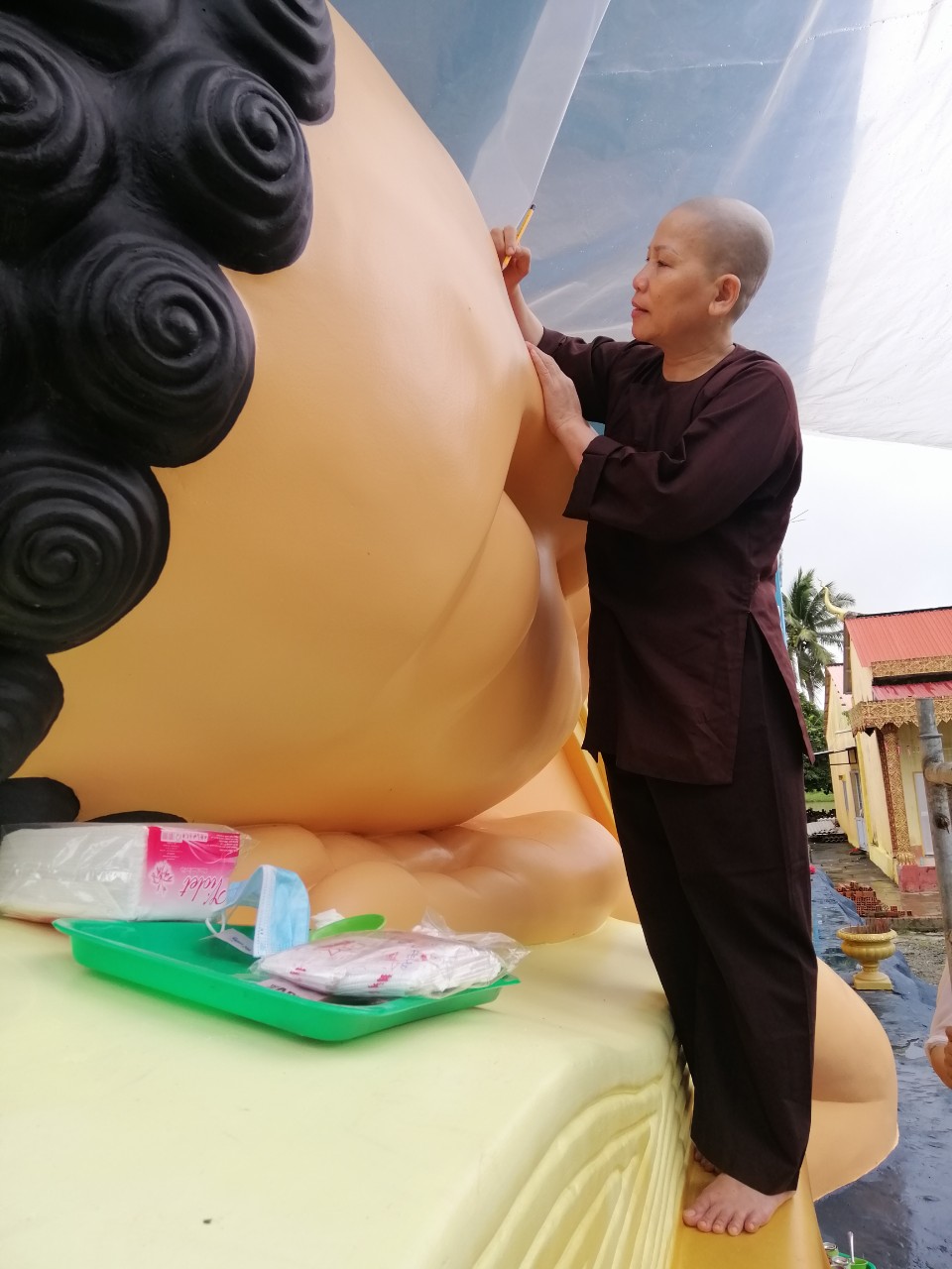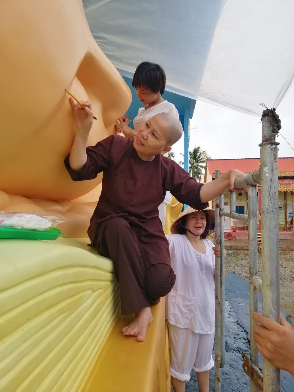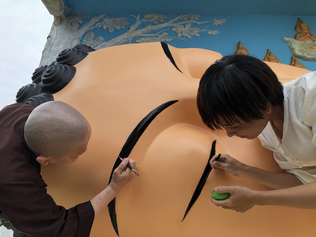 Những đường nét tôn tượng được Đại đức Thiên Giả; Sư Thiện Nhân; Sư cô Bi Nguyện và các thành viên Đội Thiện Nguyện gồm những thành viên như: Phật tử Sukha Panna, cô Phạm Thị Hoa, cô Mỹ Linh (TP. HCM); chị Nguyễn Thị Thu, anh Nguyễn Quốc Cường, cô Võ Thị Xuân Lộc (Đà Nẵng) tô vẽ tỉ mỹ với mong muốn xin được dâng phần phước báu thanh cao trong sạch đã làm được trong ngày hôm nay và xin kính chia đồng đều đến toàn thể hội chúng.