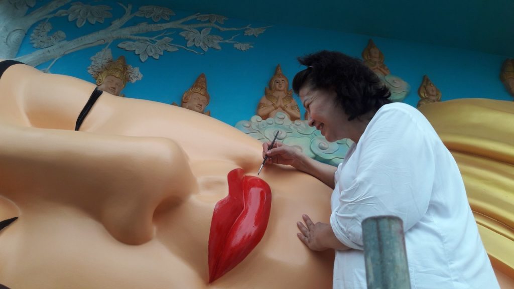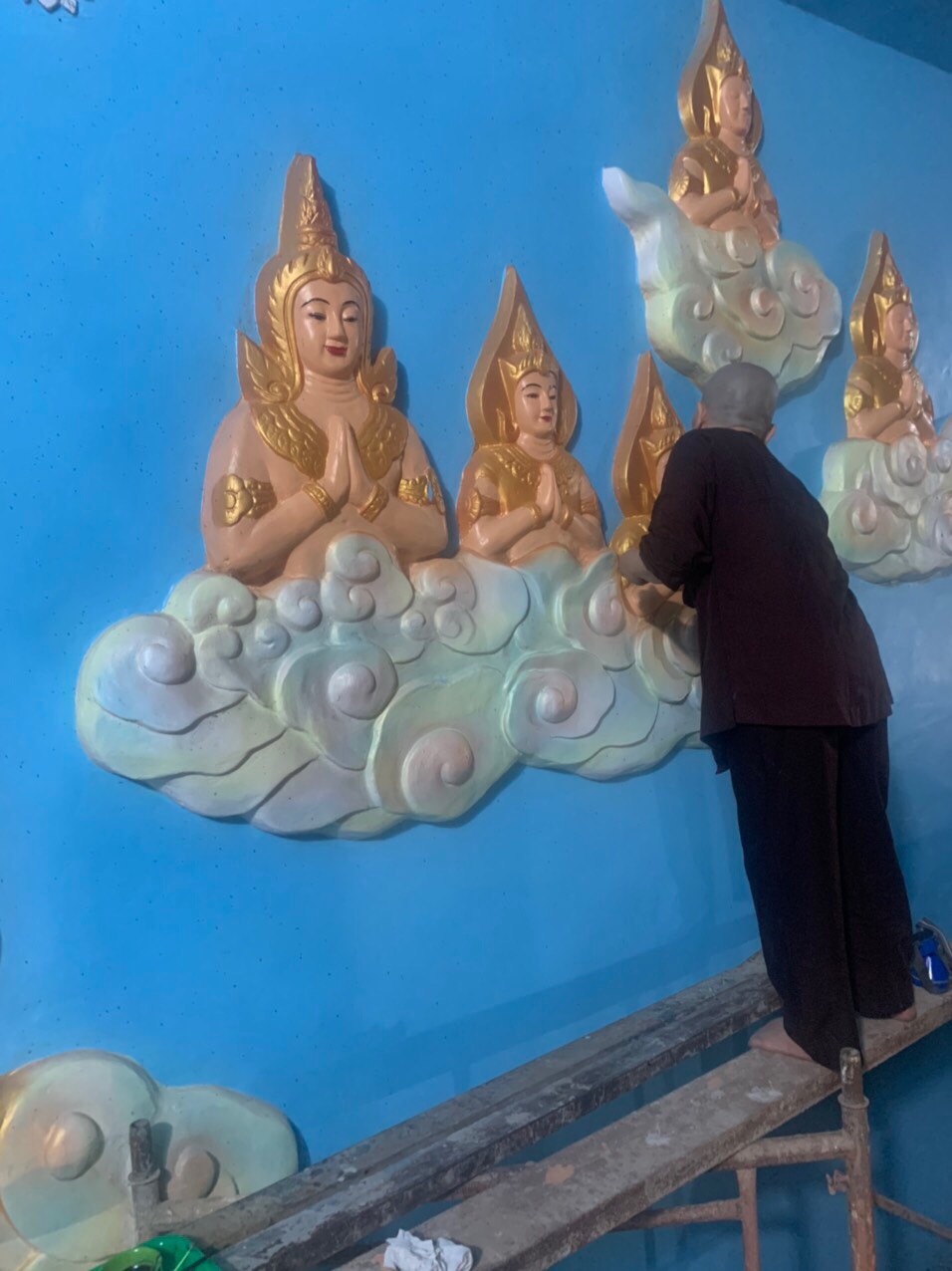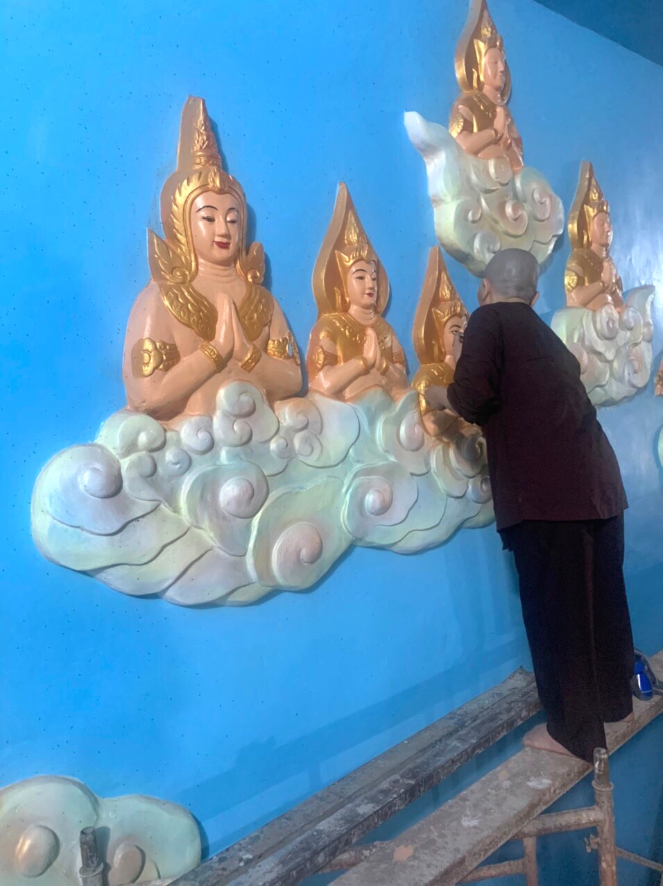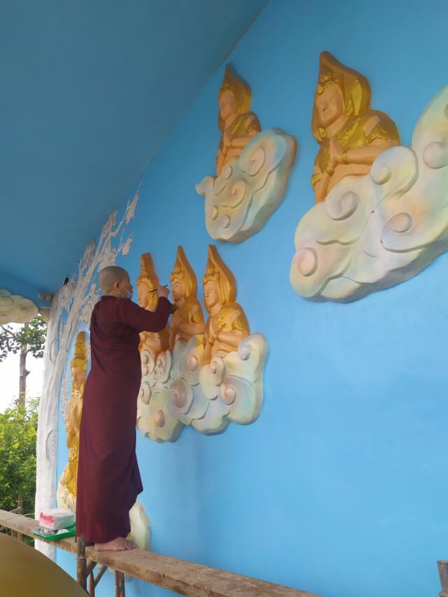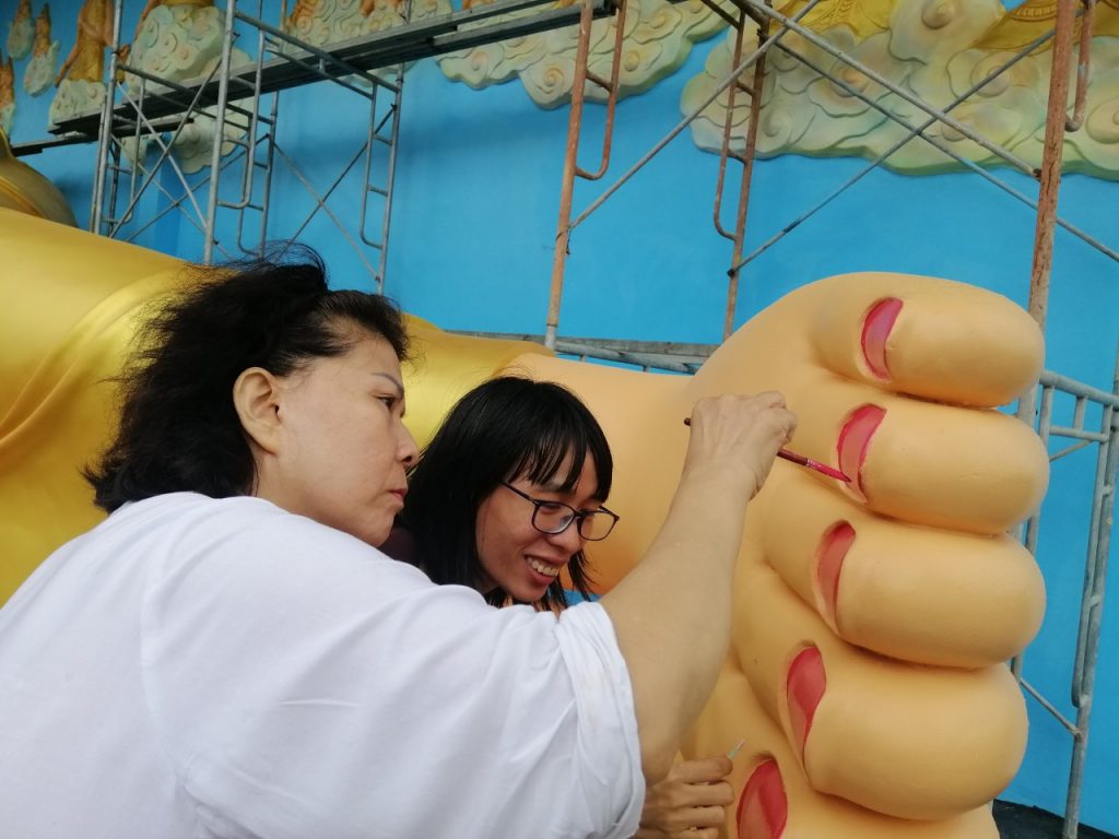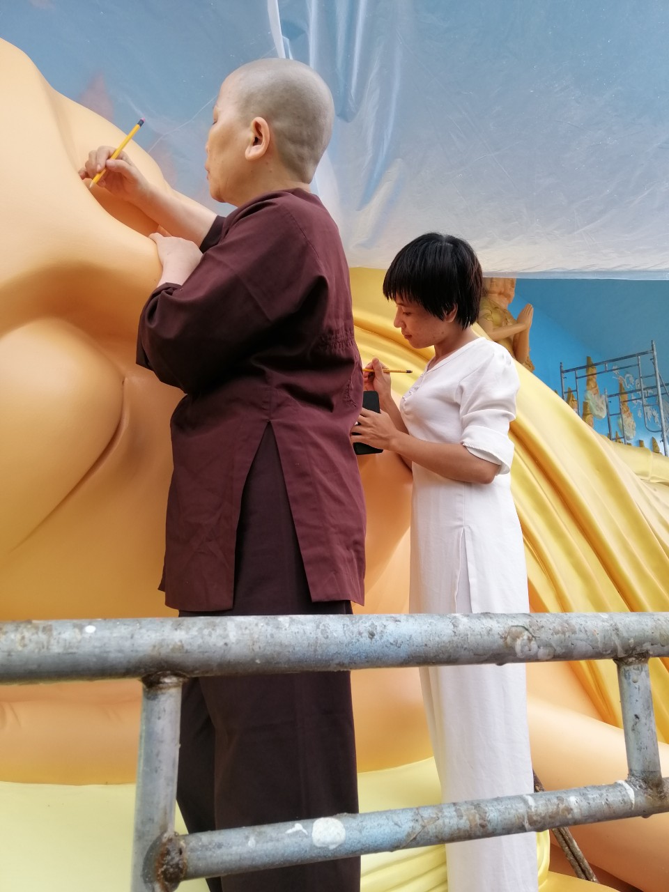 Những đường nét tôn tượng được Đại đức Thiên Giả; Sư Thiện Nhân; Sư cô Bi Nguyện và các thành viên Đội Thiện Nguyện gồm những thành viên như: Phật tử Sukha Panna, cô Phạm Thị Hoa, cô Mỹ Linh (TP. HCM); chị Nguyễn Thị Thu, anh Nguyễn Quốc Cường, cô Võ Thị Xuân Lộc (Đà Nẵng) tô vẽ tỉ mỹ với mong muốn xin được dâng phần phước báu thanh cao trong sạch đã làm được trong ngày hôm nay và xin kính chia đồng đều đến toàn thể hội chúng.