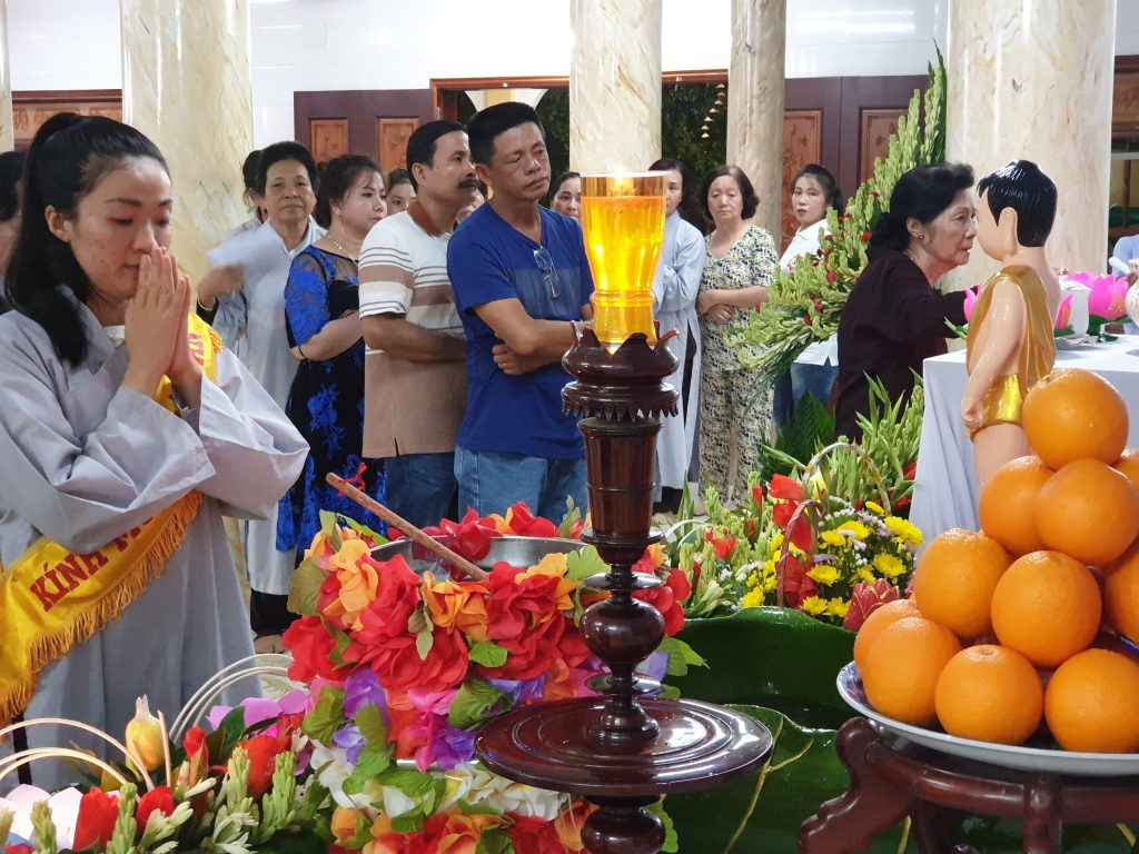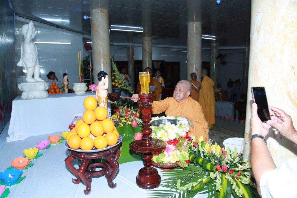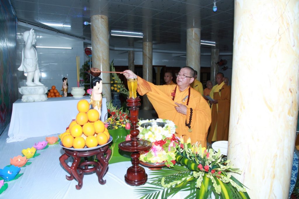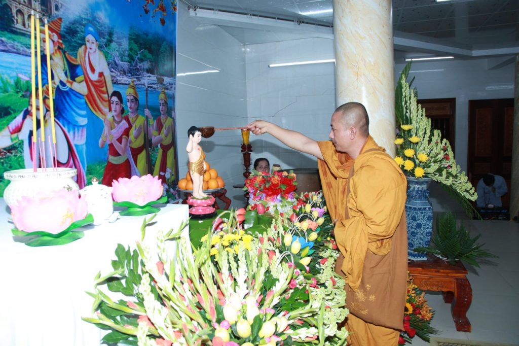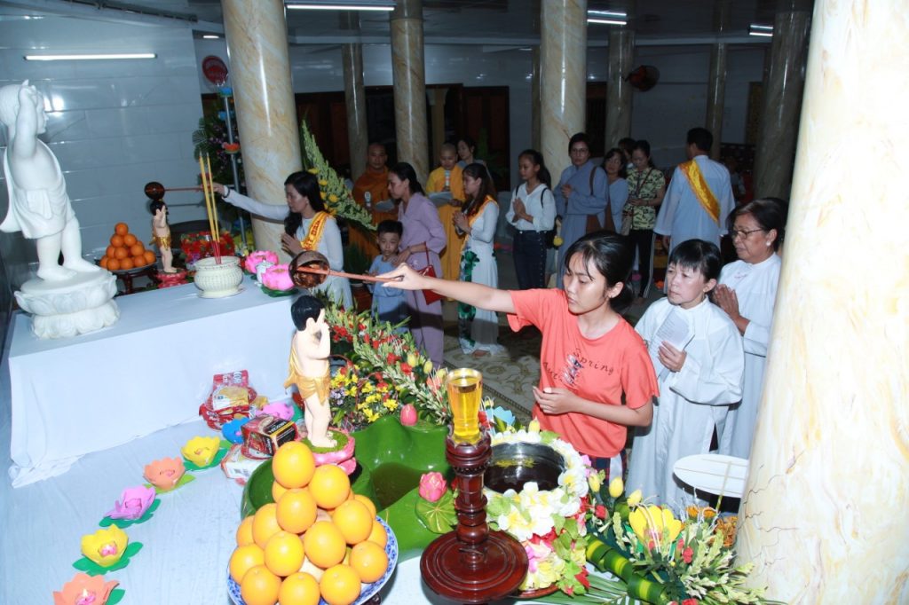 Thực hiện nghi thức truyền thống, niệm hương bạch Phật, trì tụng kinh chú, tắm Phật và hồi hướng.