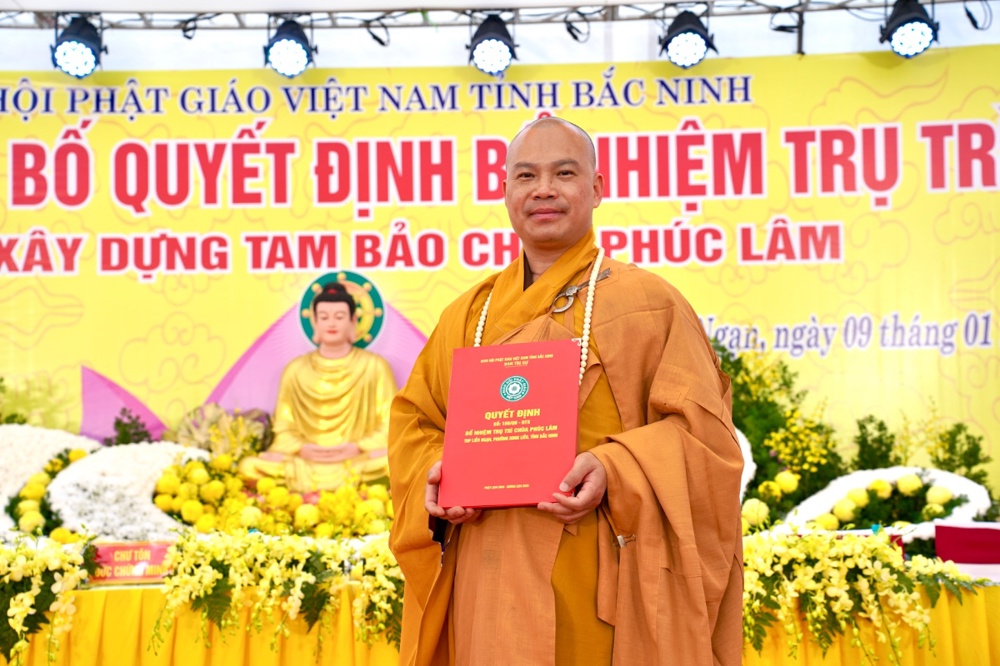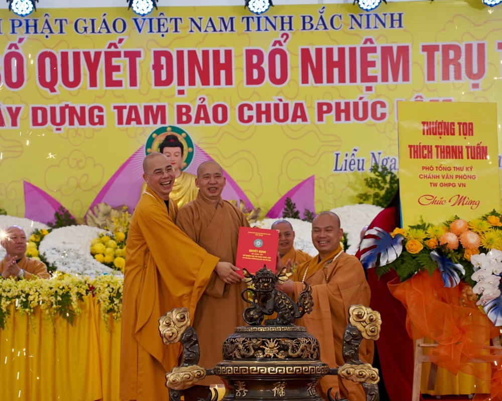 Thượng tọa Thích Thanh Tuấn và Thượng tọa Thích Thanh Sơn đã trang nghiêm trao Quyết định bổ nhiệm trụ trì chùa Phúc Lâm của Ban Trị sự GHPGVN tỉnh Bắc Ninh đến Đại đức Tân trụ trì.