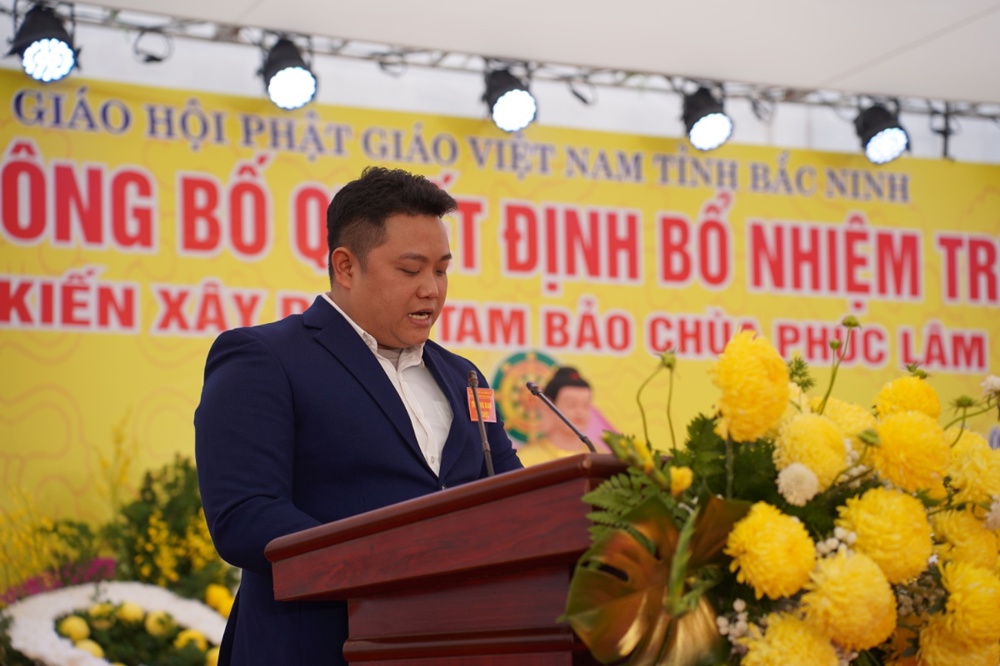 Tại buổi lễ, ông Nguyễn Gia Chuẩn – Chi ủy viên, Trưởng Ban Công tác Mặt trận tổ dân phố Liễu Ngạn phát biểu khai mạc Đại lễ công bố Quyết định bổ nhiệm trụ trì và định hướng xây dựng Tam Bảo chùa Phúc Lâm.