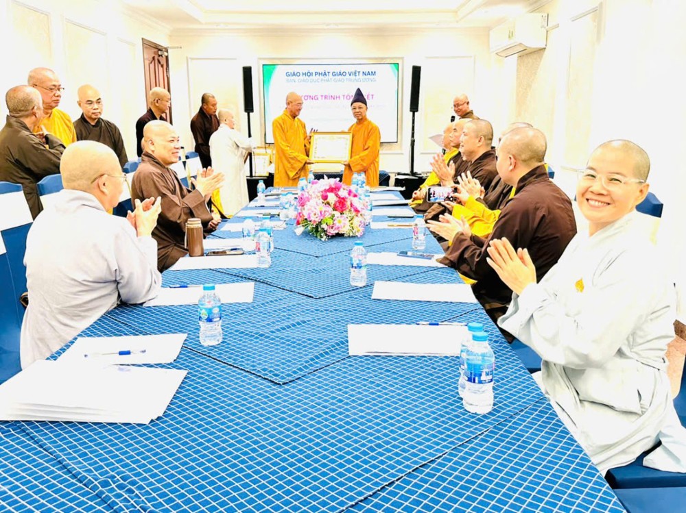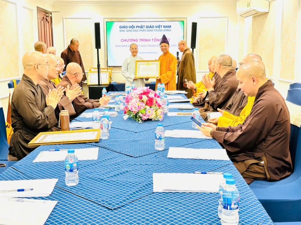 Tiếp đó, Hòa thượng Thích Thanh Quyết thay mặt Ban Thường trực Hội đồng Trị sự đã trao Bằng Tuyên dương Công đức của Hội đồng Trị sự cho tập thể Ban Giáo dục Phật giáo Trung ương và các cá nhân có nhiều đóng góp cho công tác giáo dục trong nhiệm kỳ vừa qua.