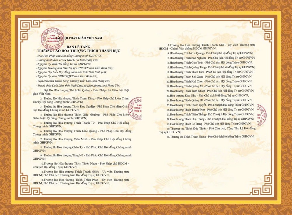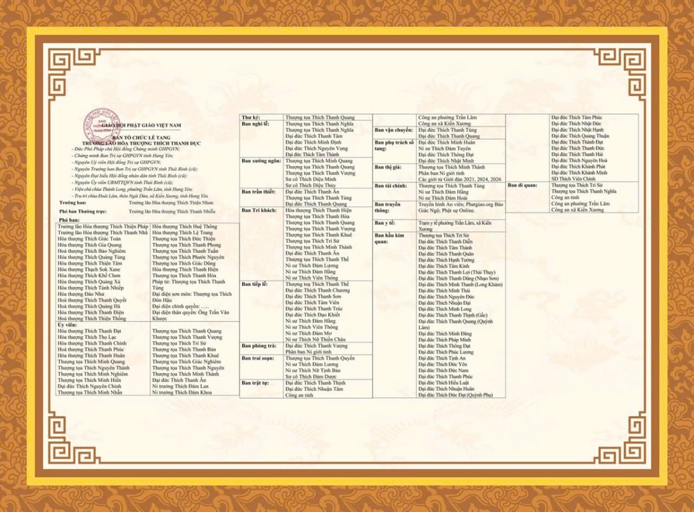 Theo đó, Đại lão Hòa thượng Thích Trí Quảng, Đức Pháp chủ GHPGVN làm Trưởng ban Lễ tang, cùng chư tôn giáo phẩm Phó Pháp chủ Hội đồng Chứng minh; chư Tôn đức Hội đồng Trị sự, lãnh đạo các Ban, Viện Trung ương, Ban Trị sự GHPGVN các tỉnh, thành và một số vị Ủy viên Ban Thường trực, đại diện pháp tử của cố Trưởng lão Hòa thượng tân viên tịch.