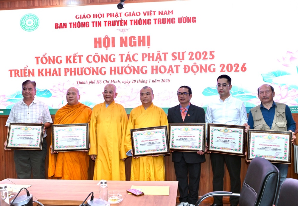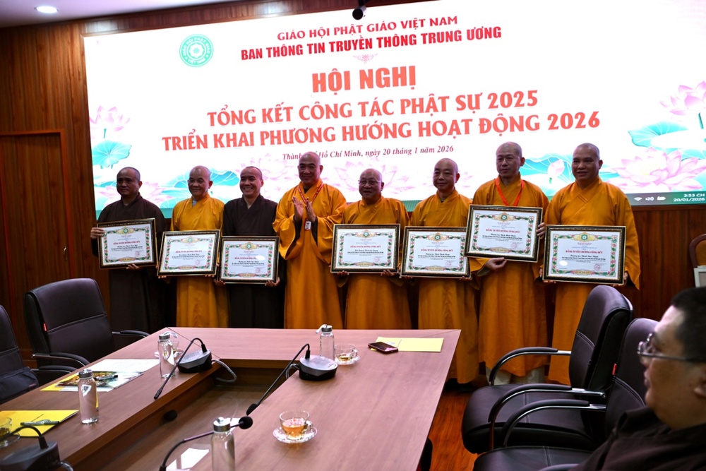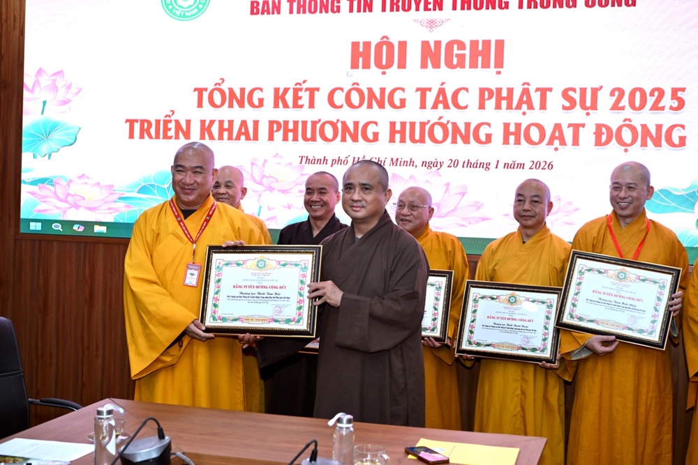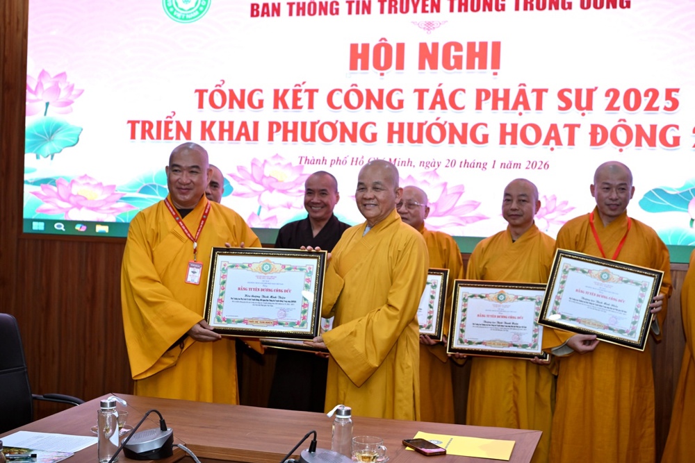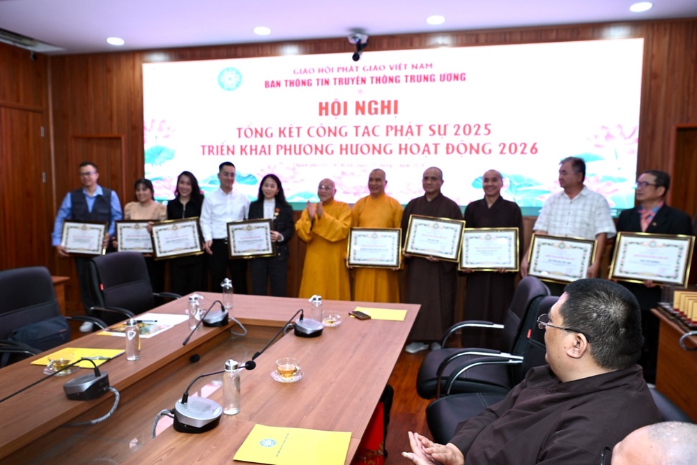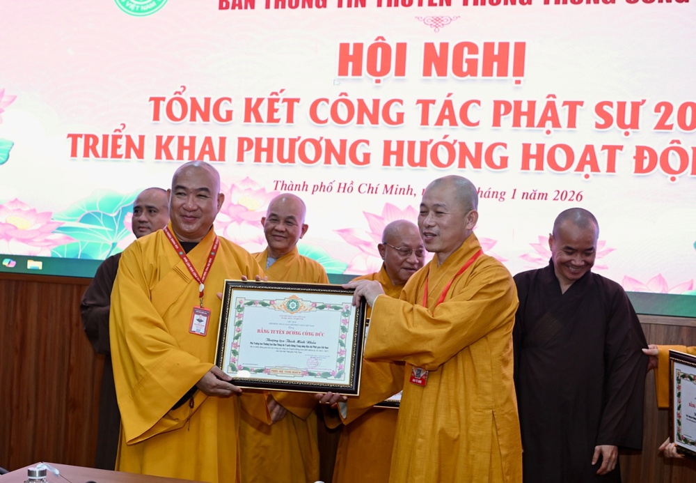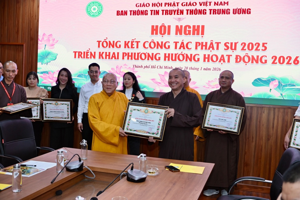 Dịp này, Ban Thường trực Hội đồng Trị sự trao Bằng tuyên dương công đức đến tập thể và cá nhân đã có nhiều thành tích xuất sắc trong các hoạt động Phật sự, thông tin truyền thông năm 2025 góp phần vào sự phát triển vững mạnh của GHPGVN.