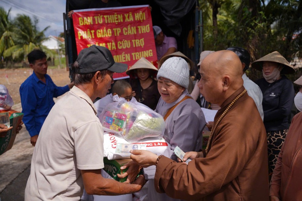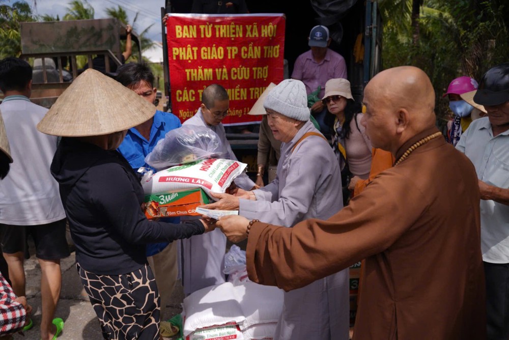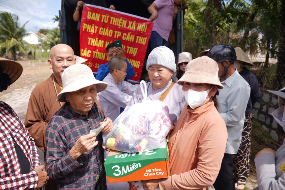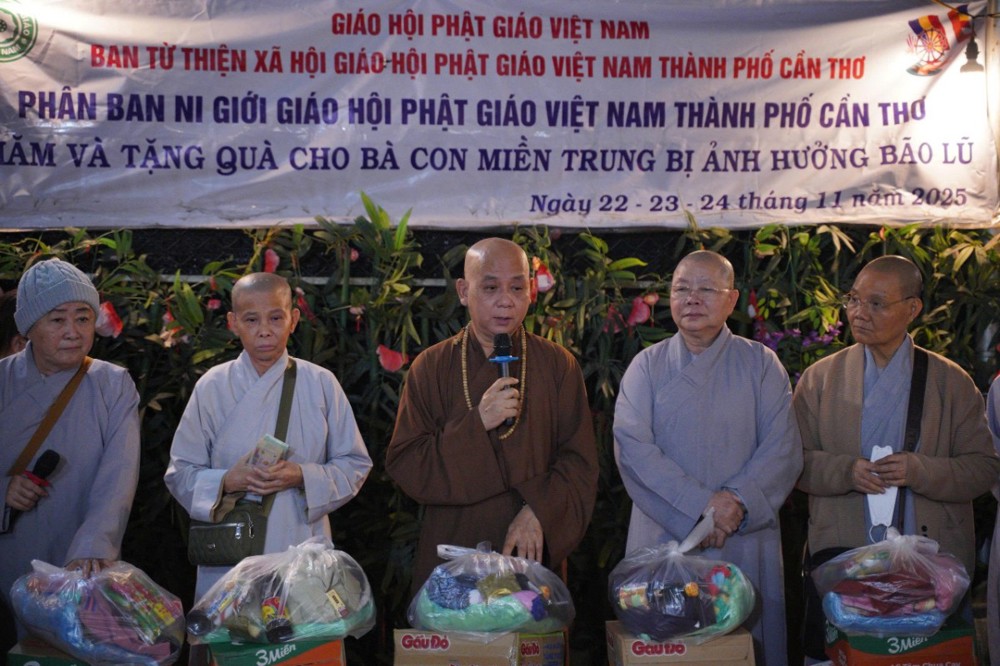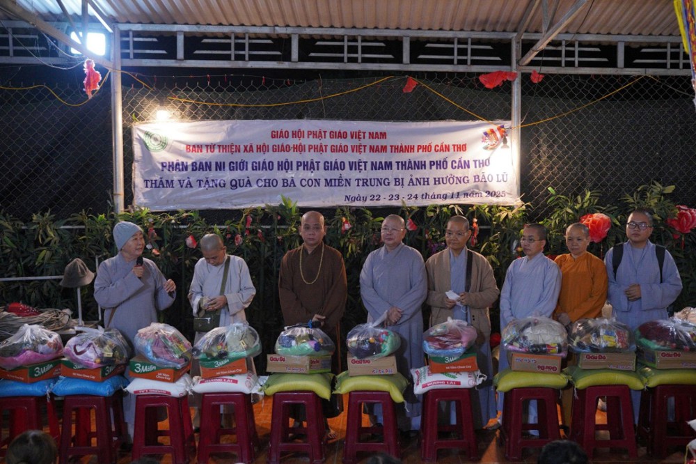 Thay mặt Ban Từ thiện GHPGVN TP. Cần Thơ, Sư cô Thích Nữ Từ Tâm đã gửi lời thăm hỏi và chia sẻ sâu sắc đến bà con vùng lũ, bày tỏ niềm cảm thông trước những mất mát mà người dân phải trải qua. Sư cô động viên bà con giữ vững tinh thần, cùng nhau vượt khó để sớm ổn định cuộc sống.