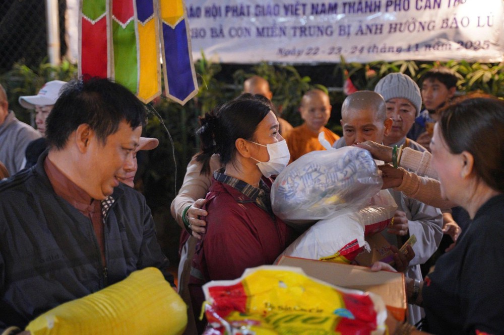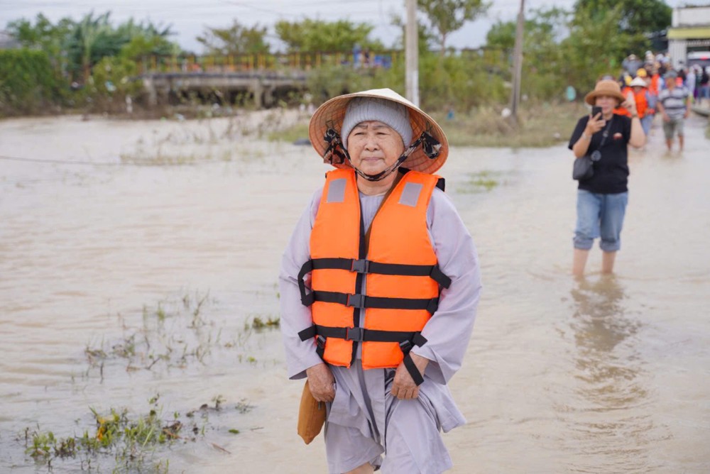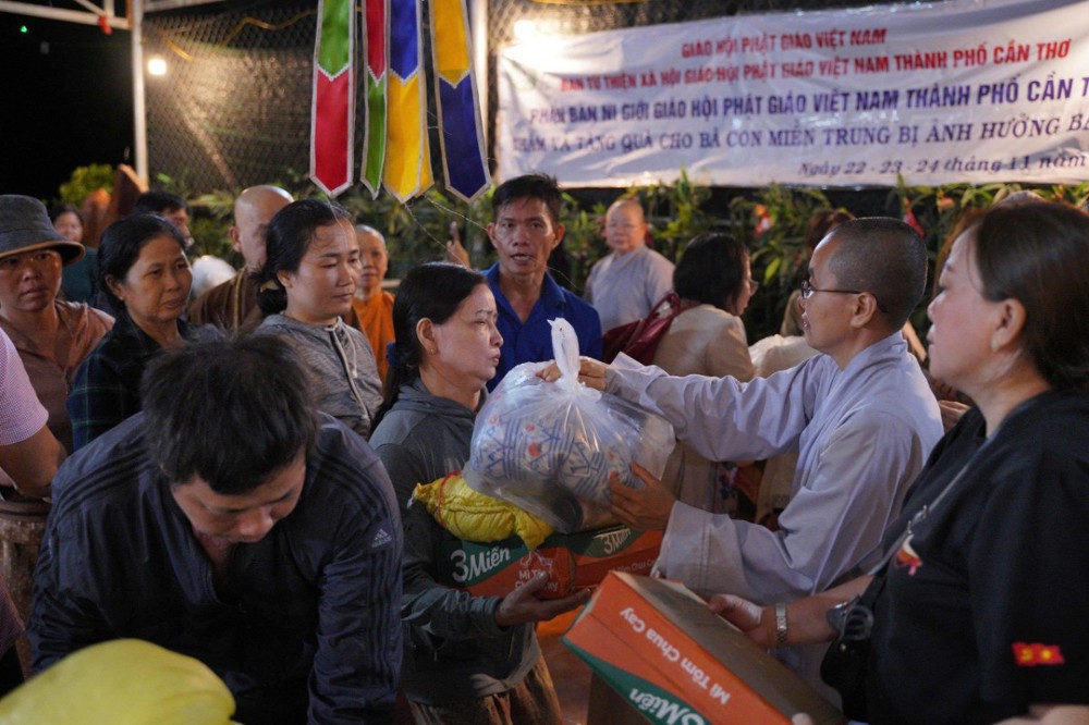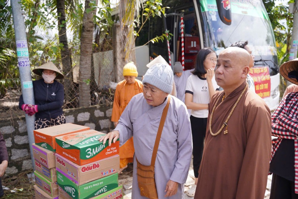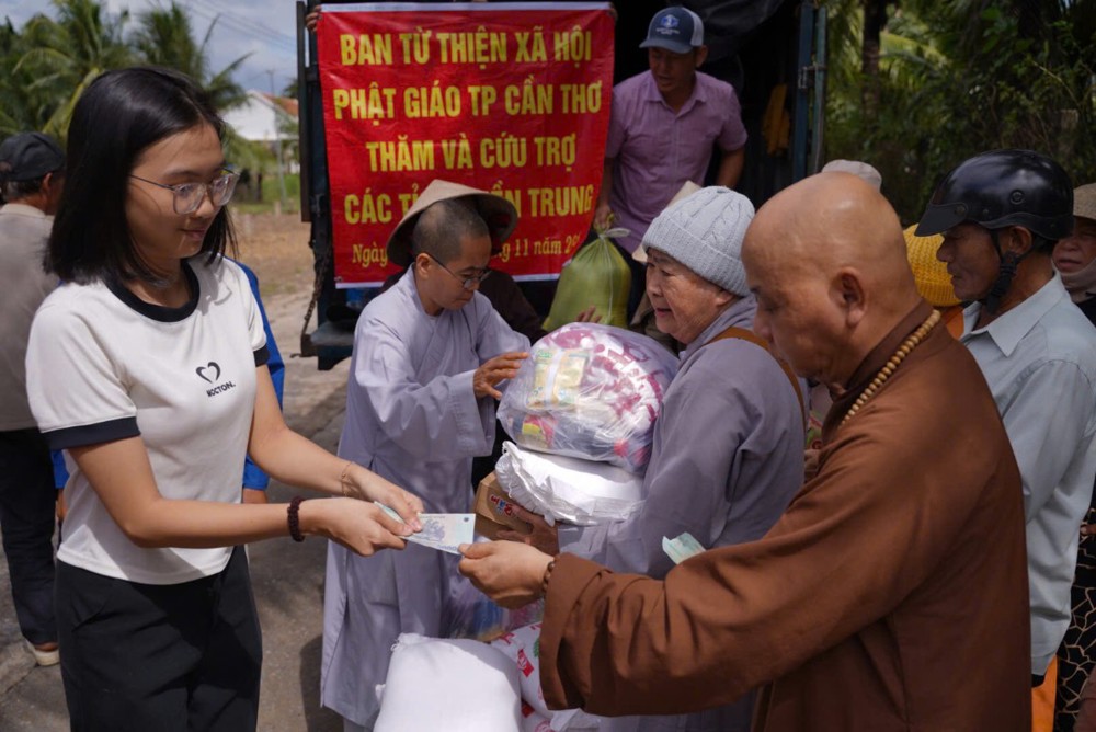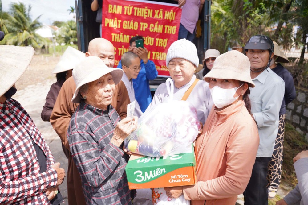 Thay mặt Ban Từ thiện GHPGVN TP. Cần Thơ, Sư cô Thích Nữ Từ Tâm đã gửi lời thăm hỏi và chia sẻ sâu sắc đến bà con vùng lũ, bày tỏ niềm cảm thông trước những mất mát mà người dân phải trải qua. Sư cô động viên bà con giữ vững tinh thần, cùng nhau vượt khó để sớm ổn định cuộc sống.