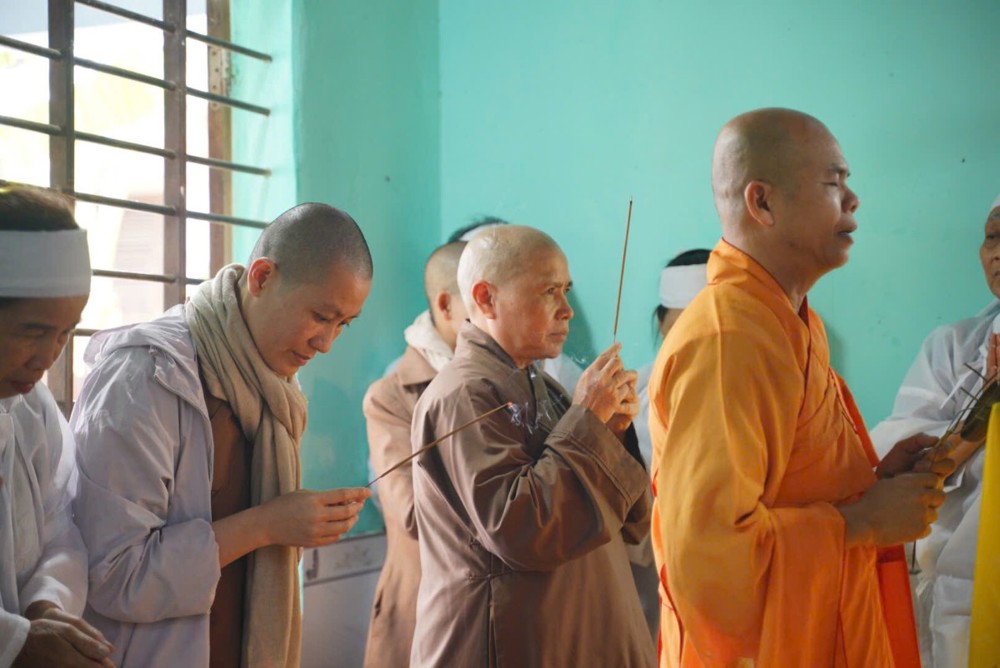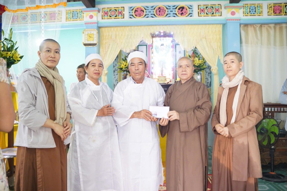 Dịp này, đoàn đã đến kính viếng một cụ bà vừa viên tịch, ra đi trong hoàn cảnh neo đơn, thiếu vắng tình thân quyến thuộc. Trước giác linh cụ bà, chư Tôn đức trong đoàn đã thành kính dâng hương tưởng niệm, cầu nguyện hương linh sớm siêu sanh về cảnh giới an lành, đồng thời gửi phần hỗ trợ tịnh tài như một tấm lòng tri ân và chia sẻ của Tăng Ni, Phật tử tỉnh Đồng Nai.