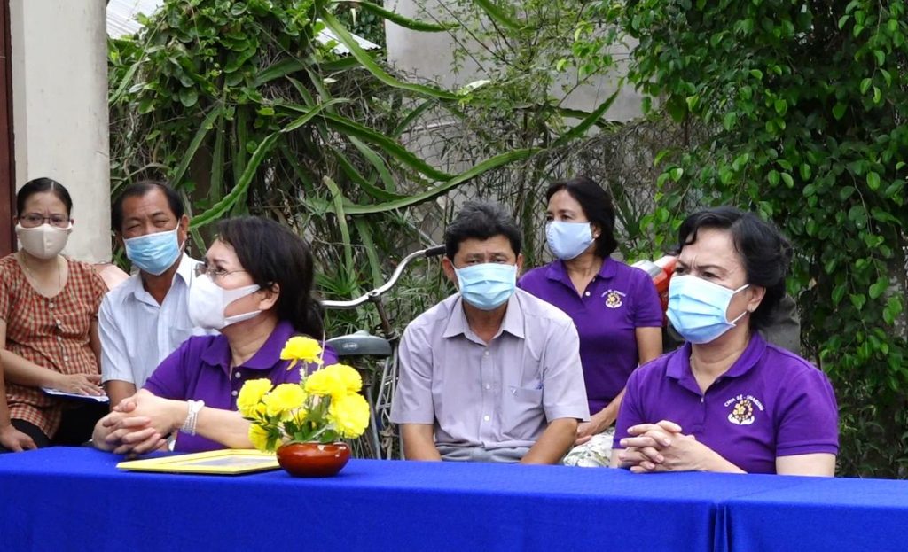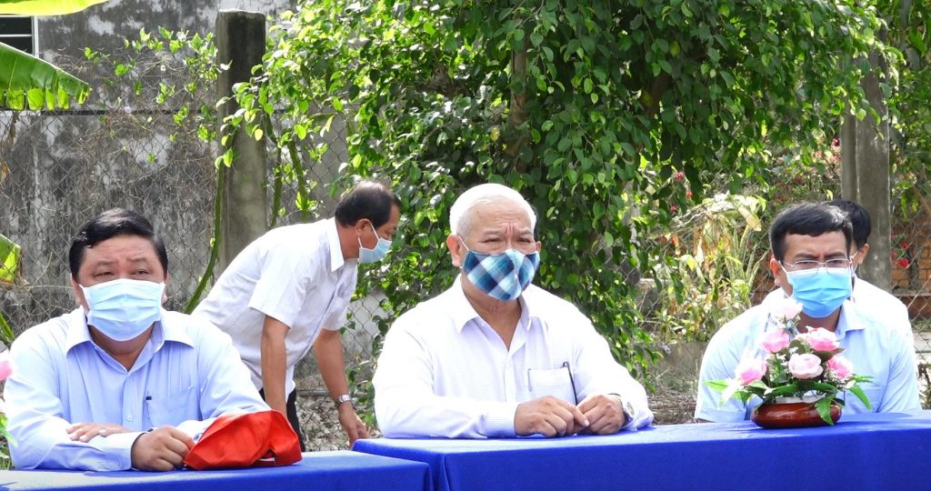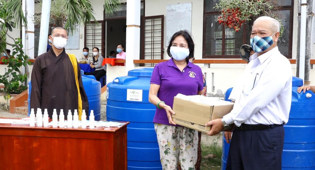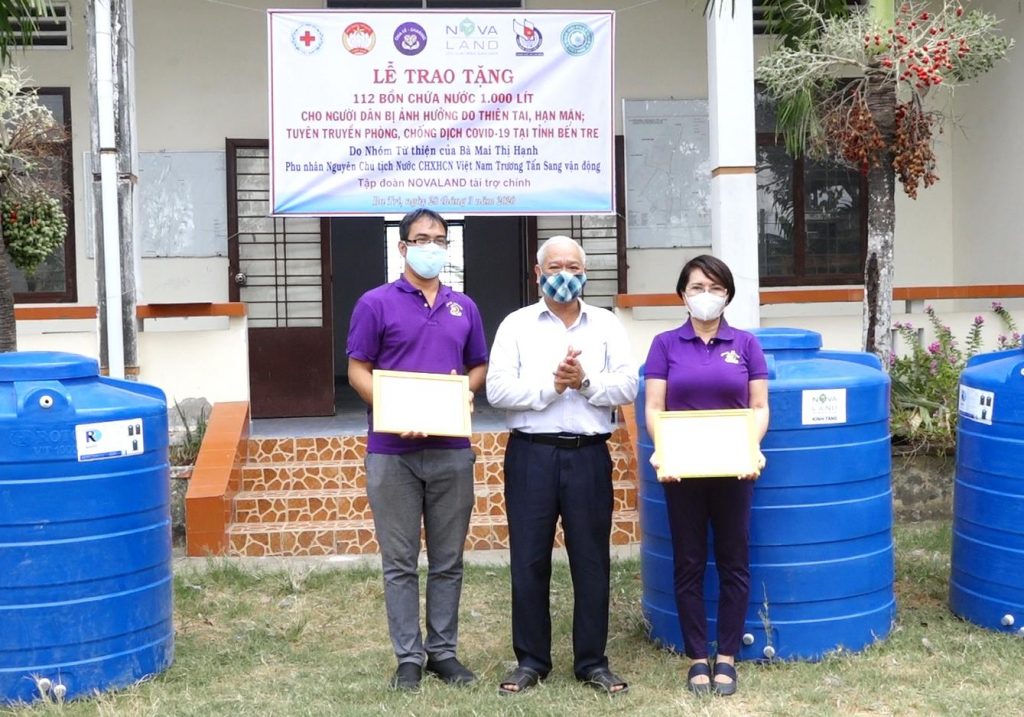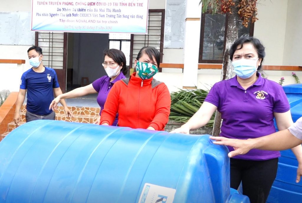 PSO - Tiếp nối sự chia sẻ đến bà con nghèo bị ảnh hưởng hạn mặn, ngày thứ ba của chuyến từ thiện, sáng ngày 28/03/2020, nhóm từ thiện ‘Chia sẻ - Sharing’ của bà Mai Thị Hạnh - Phu nhân nguyên Chủ tịch nước Trương Tấn Sang kết hợp với Thượng tọa Thích Thanh Phong - Trưởng Ban Từ thiện xã hội GHPGVN TP. HCM; Trung ương Hội chữ thập đỏ Việt Nam; Mặt trận tổ quốc Việt Nam TP.HCM; Hội nhà báo TP.HCM đã trao tặng 112 bồn nước cho bà con tại xã An Phú Trung, huyện Ba Tri, tỉnh Bến Tre bị ảnh hưởng của hạn hán, xâm nhập mặn và tặng khẩu trang góp phần tuyên truyền phòng, chống dịch Covid-19.