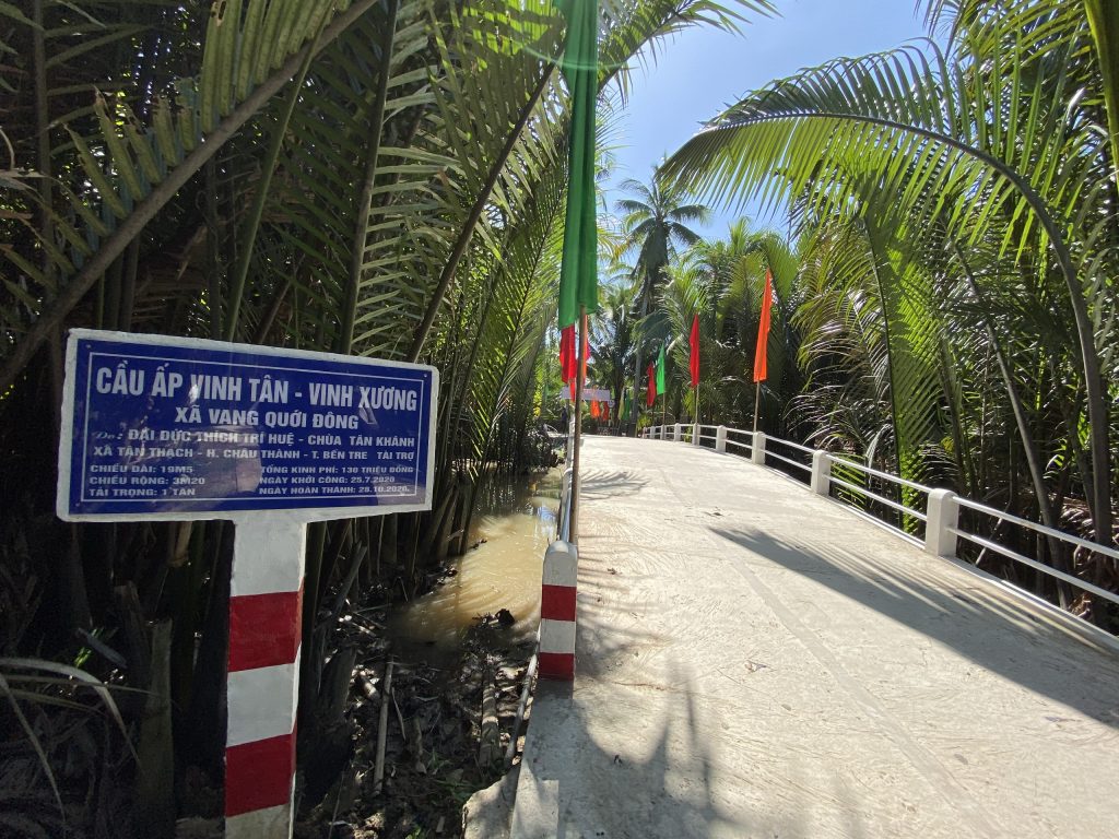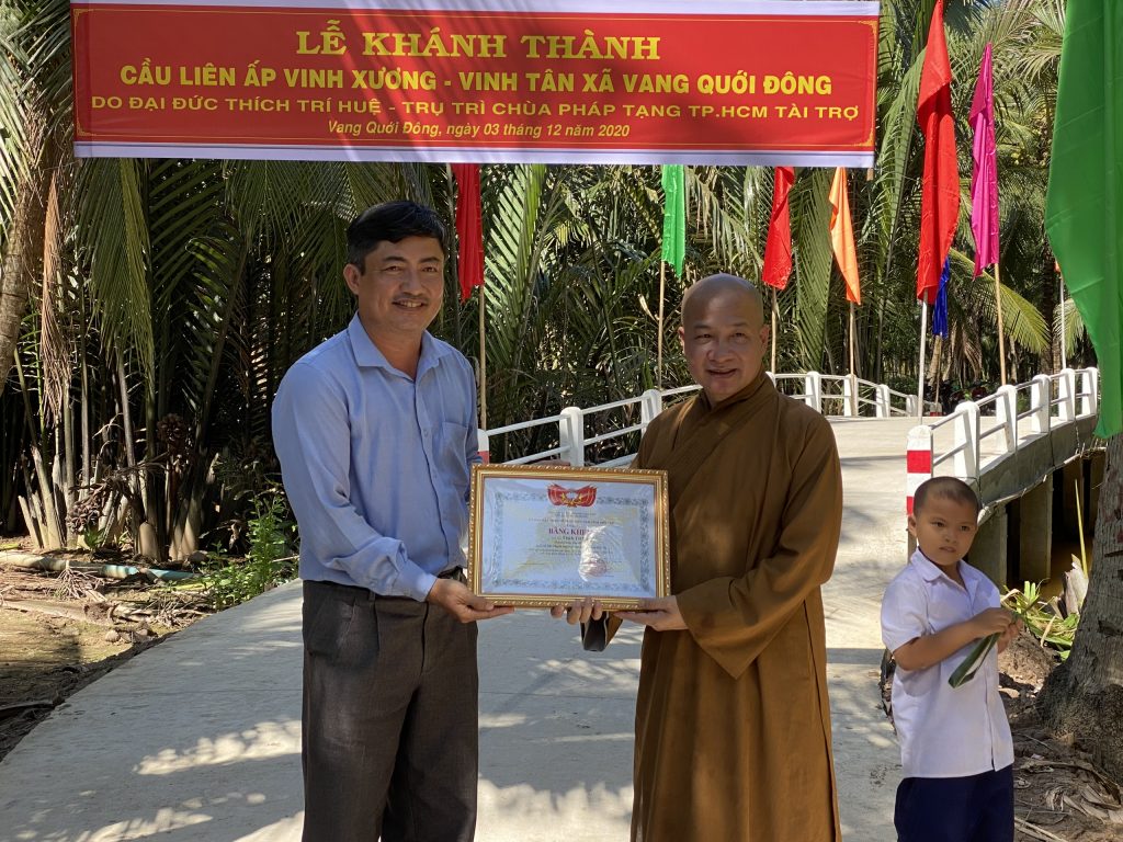 Trong niềm hân hoan khi hai ấp có được cây cầu Giao thông nông thôn mới vững chắc và sạch đẹp này, đại diện quý bà con địa phương đã gửi lời tri ân sâu sắc đến đoàn từ thiện. Đồng thời, dịp này, Ủy ban Mặt trận Tổ quốc Việt Nam tỉnh Bến Tre đã trao tặng bằng khen đến Đại đức Thích Trí Huệ - Trưởng Phân ban về những đóng góp tích cực trong thời gian qua. Không chỉ chăm lo phương tiện hỗ trợ đời sống của bà con nhân dân mà còn giúp cho việc phát triển kinh tế - xã hội của khu vực.