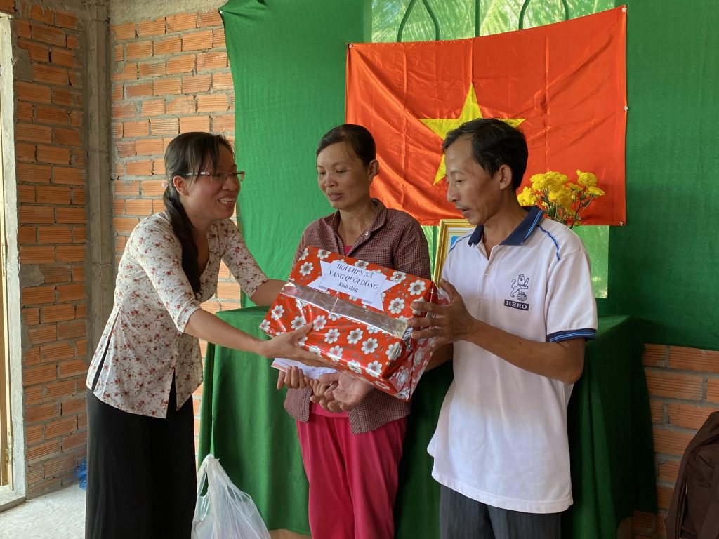 Điểm thứ nhất, phái đoàn Phân ban đến trao tặng Mái ấm tình thương cho hộ chị Lê Thị Mộng Thanh thuộc ấp Vinh Xương, xã Vang Quới Đông, huyện Bình Đại, tỉnh Bến Tre.