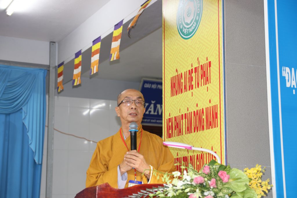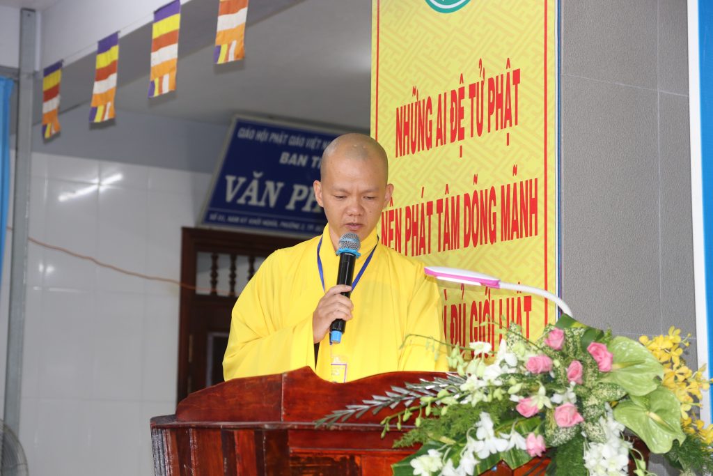 Thay mặt Ban tổ chức, HT.Thích Nhựt Tấn - UV TT HĐTS T.Ư GHPGVN, Phó ban Kiểm soát T.Ư GHPGVN, Trưởng BTS PG tỉnh Bến Tre, Trưởng Ban tổ chức phát biểu khai mạc buổi lễ Bế giảng khóa “Bồi dưỡng Trụ trì năm 2019”.