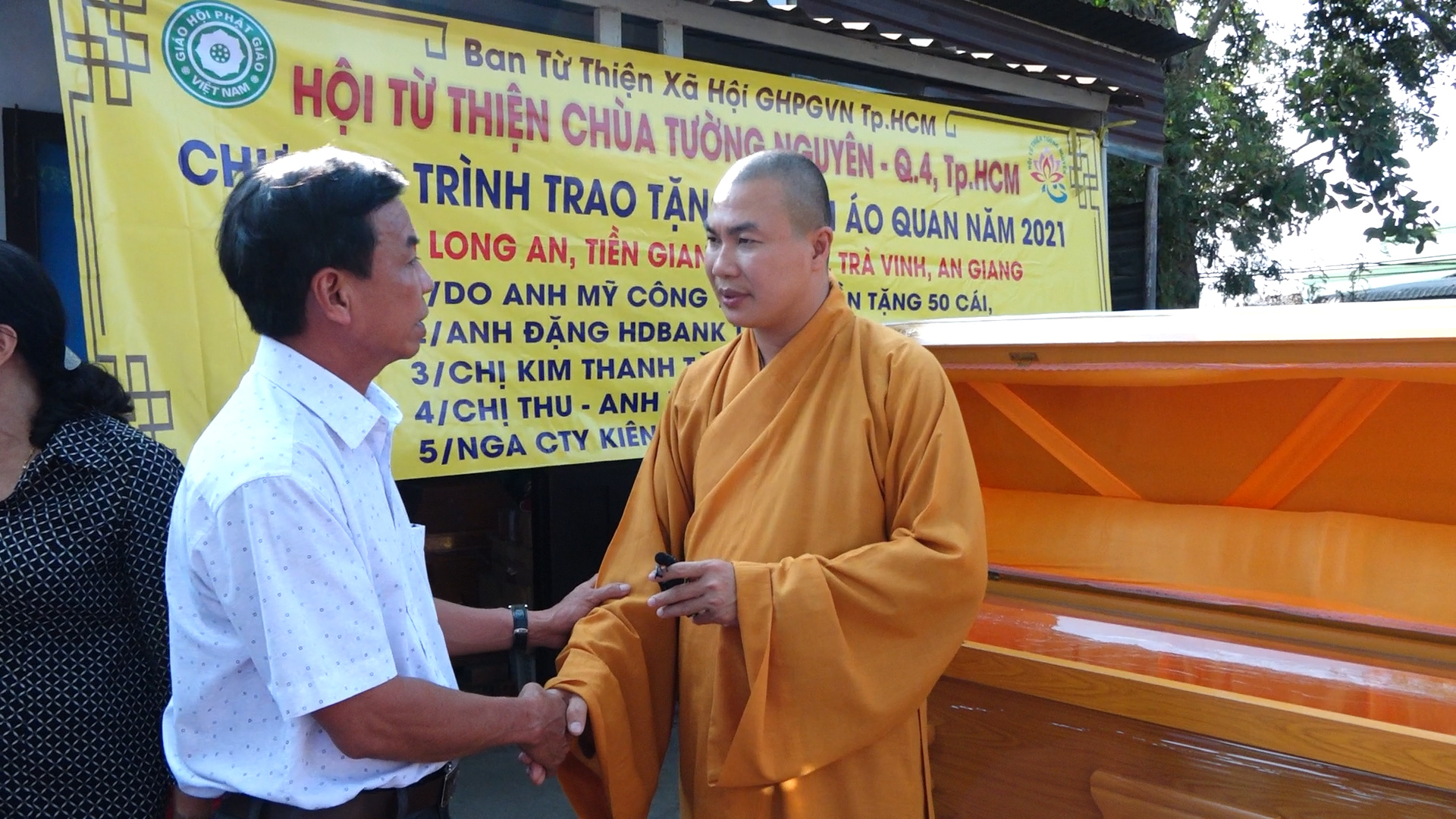 Tiếp đến, Hội từ thiện Tường Nguyên cũng đã thay mặt các nhà tài trợ trao tặng 95 chiếc áo quan cho những mảnh đời không may mắn khi có người thân mất đi mà không có áo quan để chôn cất. Được biết, mỗi chiếc áo quan có chiều dài 2m, cao 1m1, rộng 80cm, do các mạnh thường quân có tâm nguyện được giúp đỡ những mãnh đời không may mắn, có hoàn cảnh khó khăn.