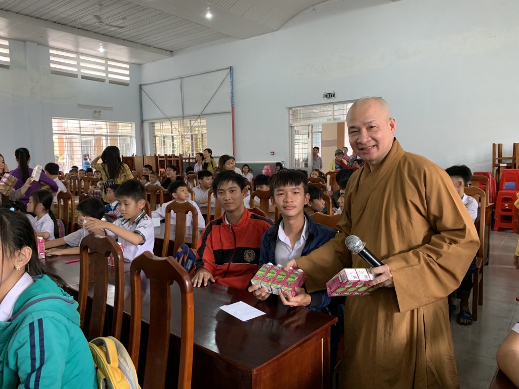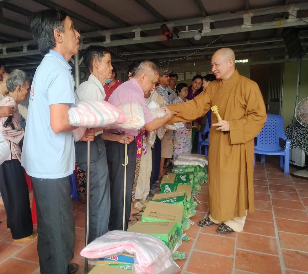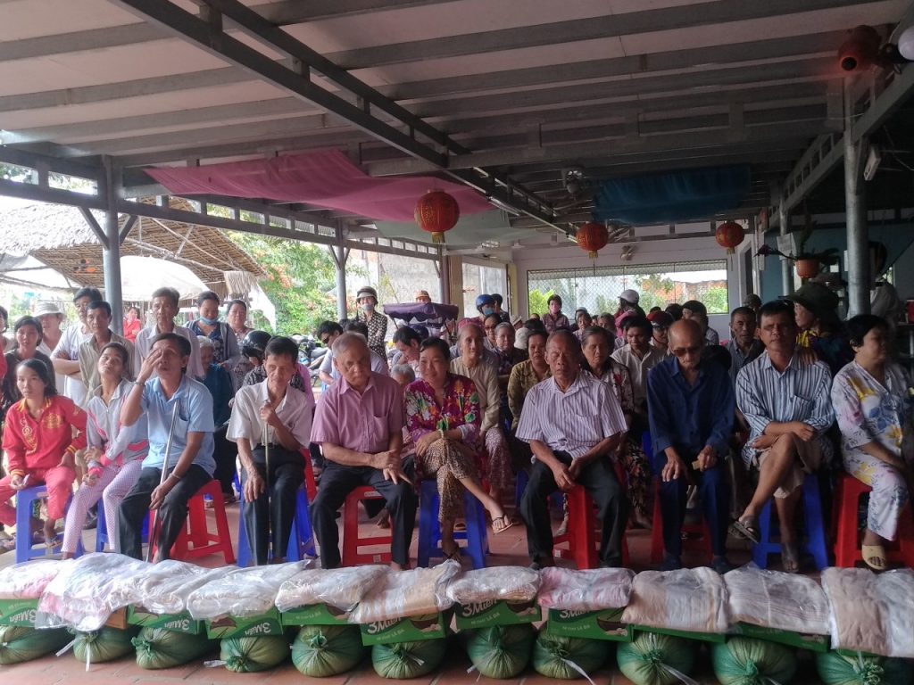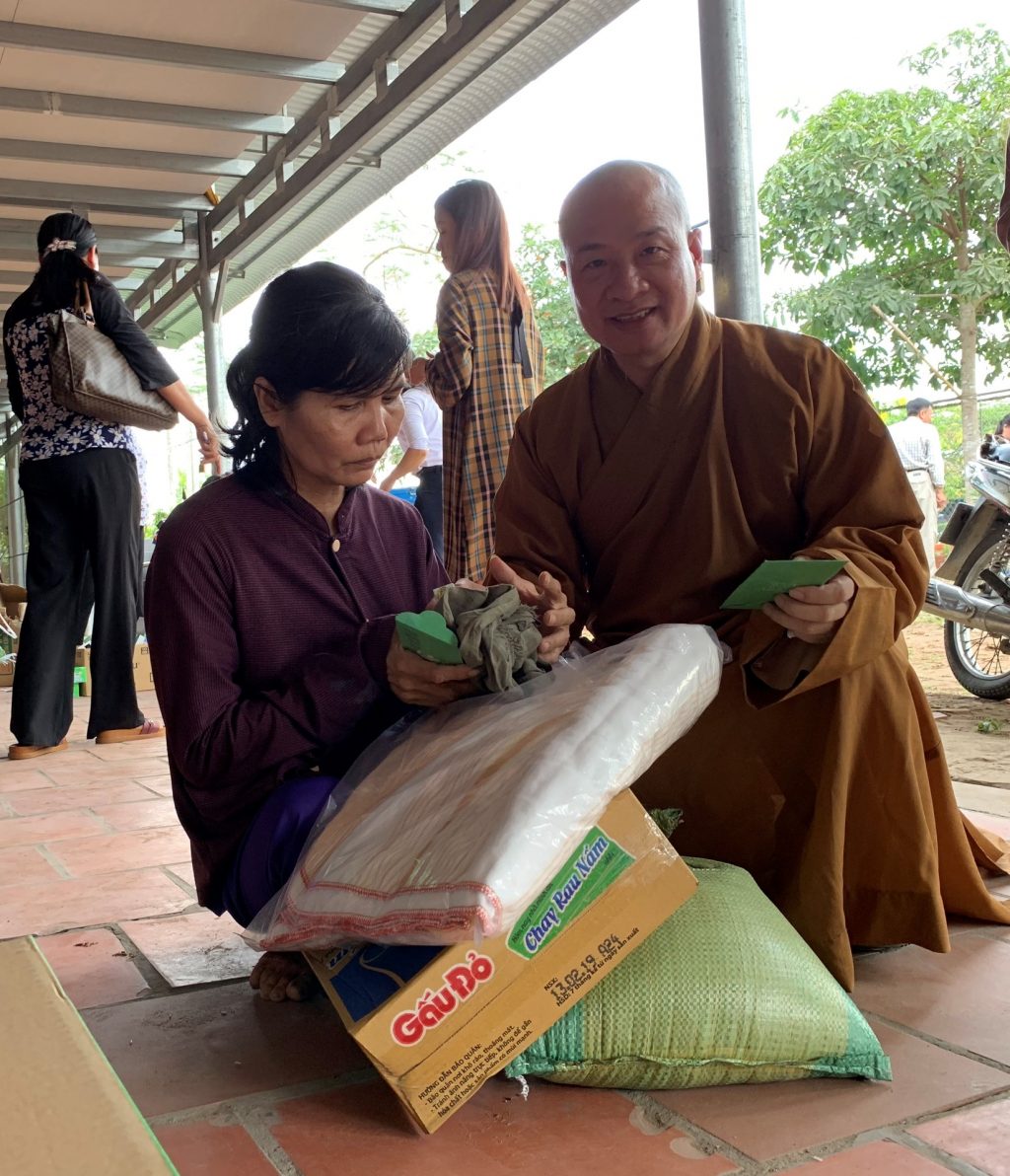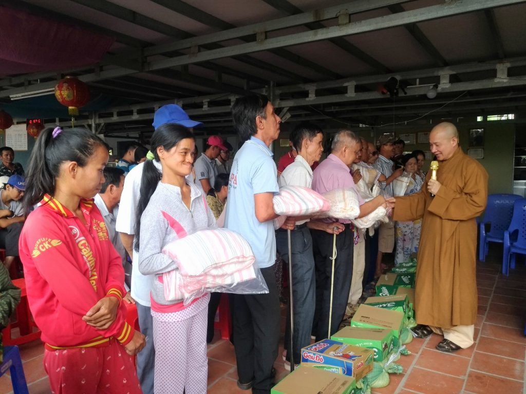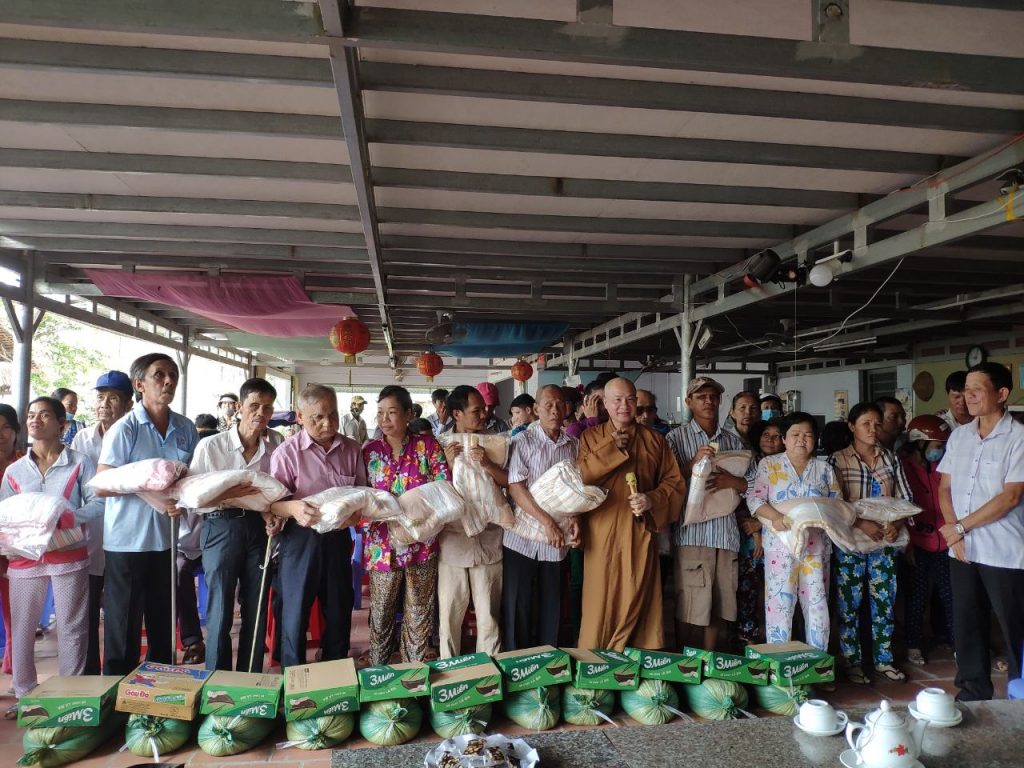 Tại đây, sau những lời thăm hỏi tận tình của Đại đức Thích Trí Huệ đến quý bà con là những phần quà gửi gắm những yêu thương được trao tận tay quý bà con, bao gồm: 10kg gạo, thùng mì gói, mền, dầu gió, áo thun và bao thư 100.000 đồng với trị giá 400.000 đồng mỗi suất. Riêng bà con Khiếm thị được đoàn gửi tặng thêm 1 bình thuốc rửa mắt. Đồng thời, bếp ăn cũng gửi những suất cơm nhân ái bổ dưỡng phục vụ phái đoàn và quý bà con trở về tham dự.