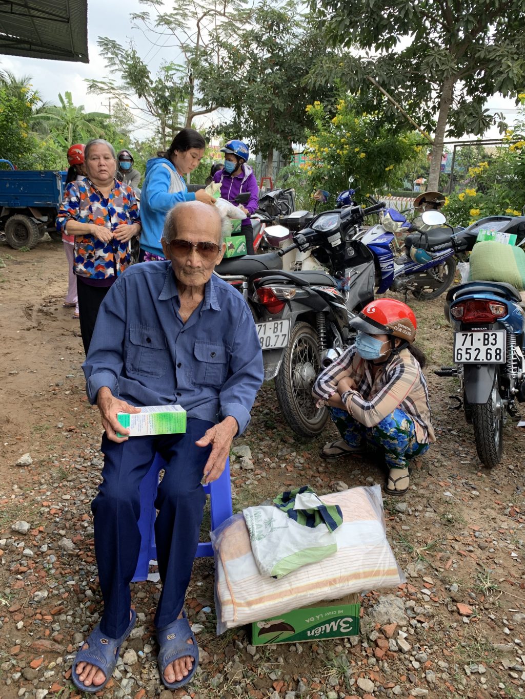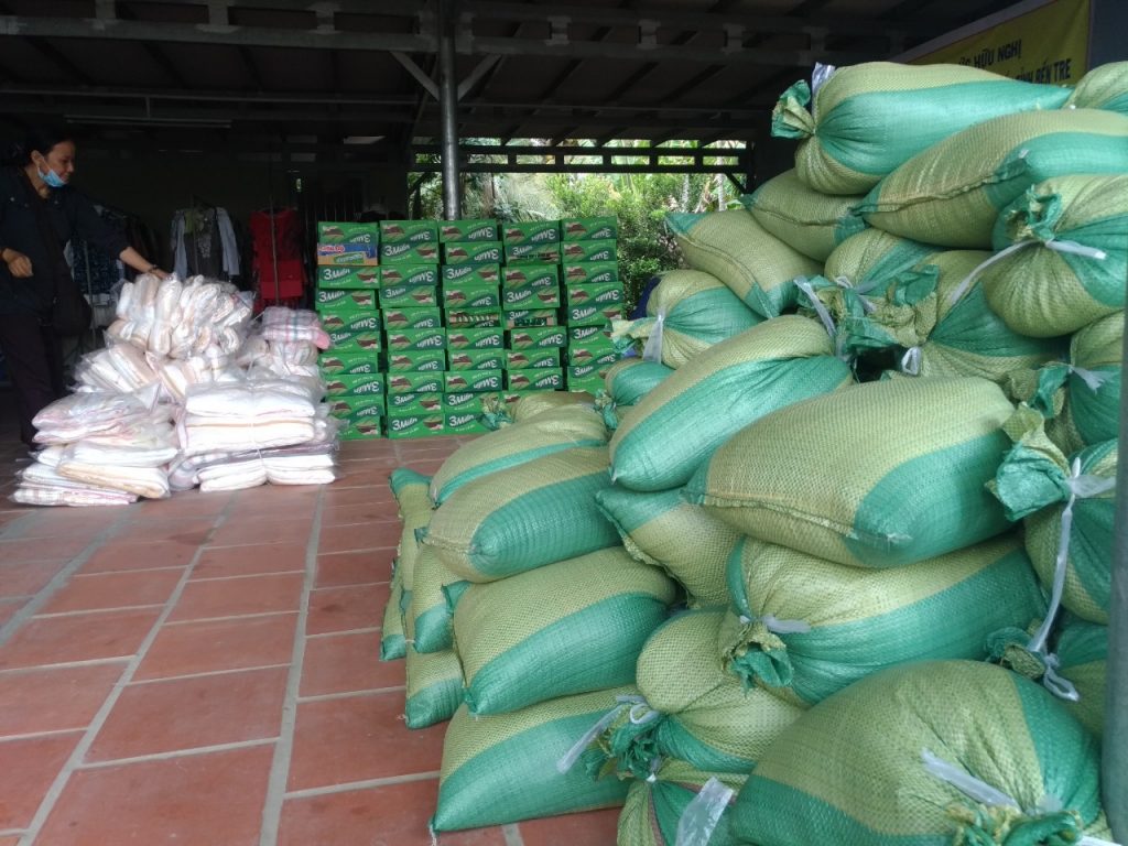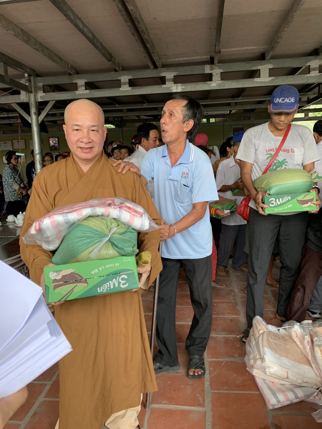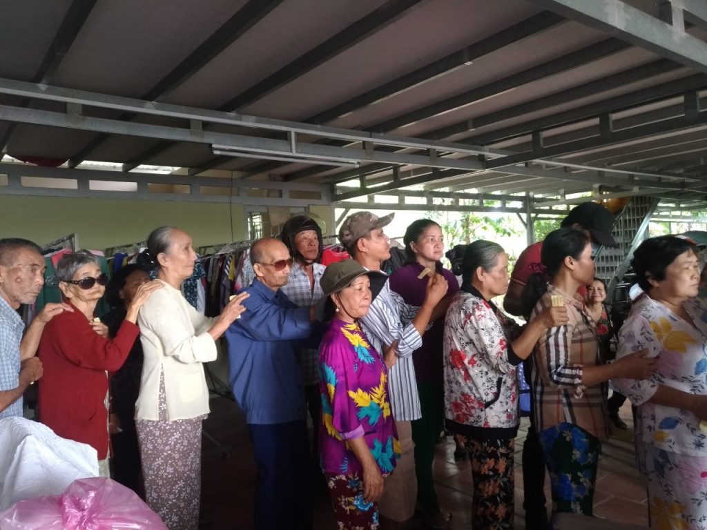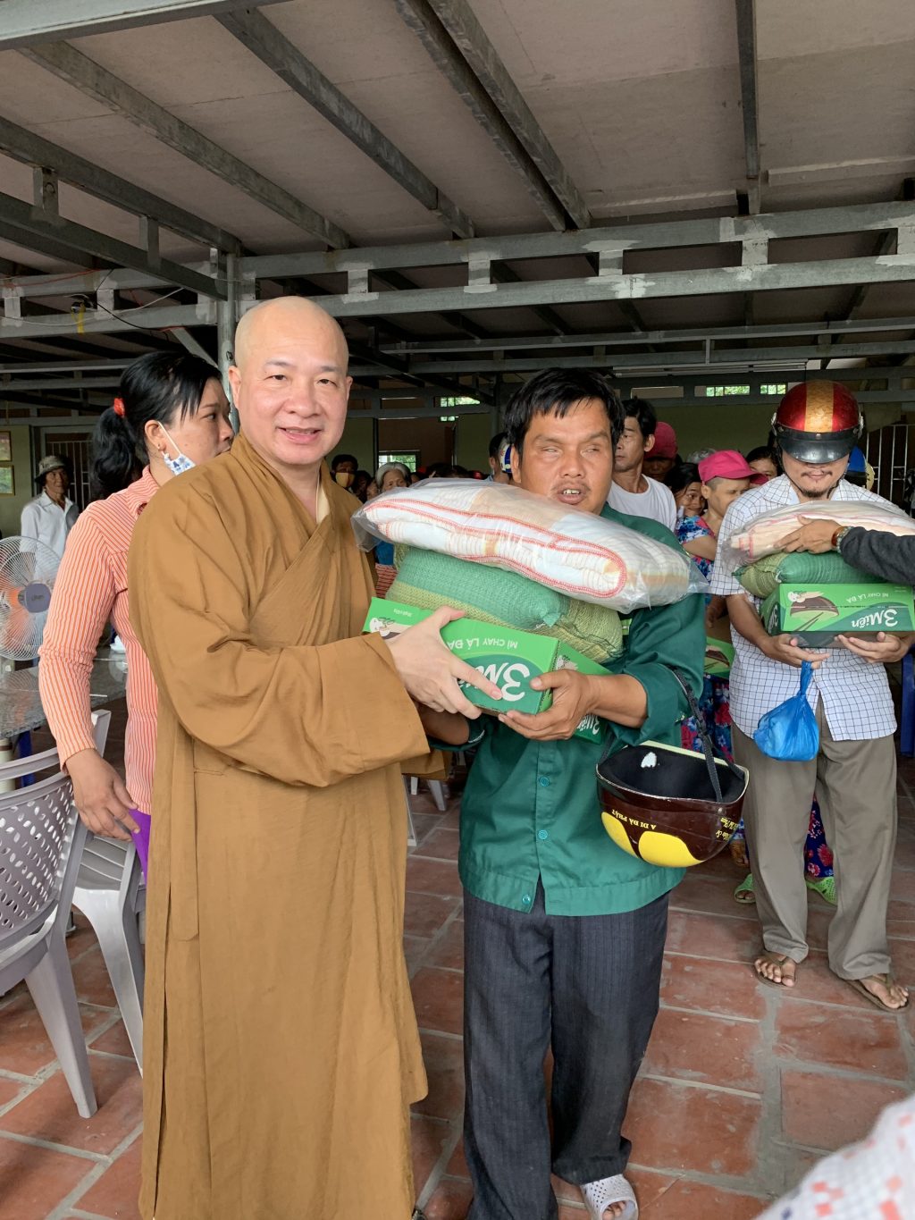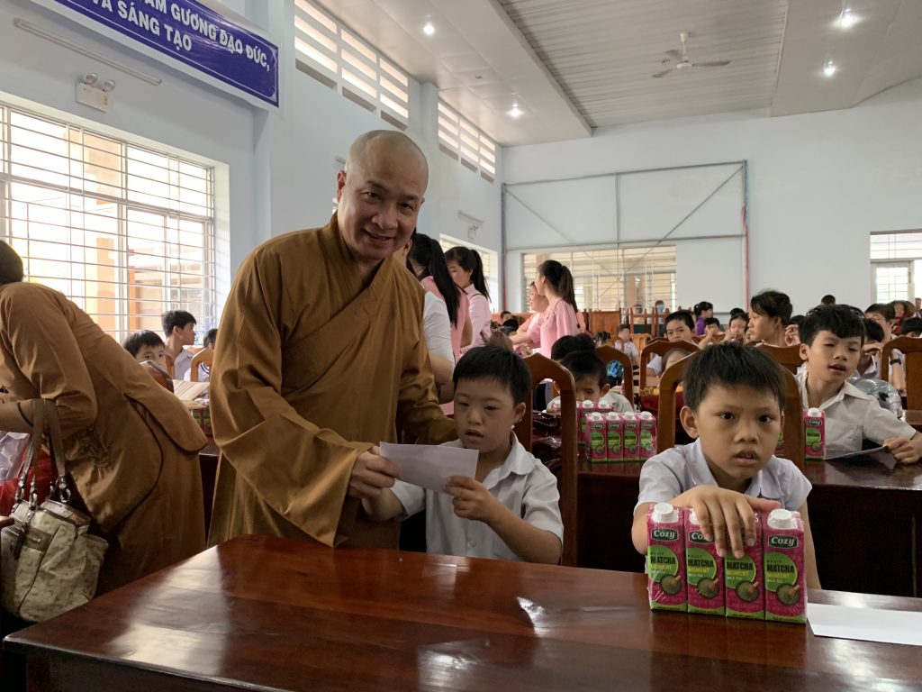 Tại đây, sau những lời thăm hỏi tận tình của Đại đức Thích Trí Huệ đến quý bà con là những phần quà gửi gắm những yêu thương được trao tận tay quý bà con, bao gồm: 10kg gạo, thùng mì gói, mền, dầu gió, áo thun và bao thư 100.000 đồng với trị giá 400.000 đồng mỗi suất. Riêng bà con Khiếm thị được đoàn gửi tặng thêm 1 bình thuốc rửa mắt. Đồng thời, bếp ăn cũng gửi những suất cơm nhân ái bổ dưỡng phục vụ phái đoàn và quý bà con trở về tham dự.