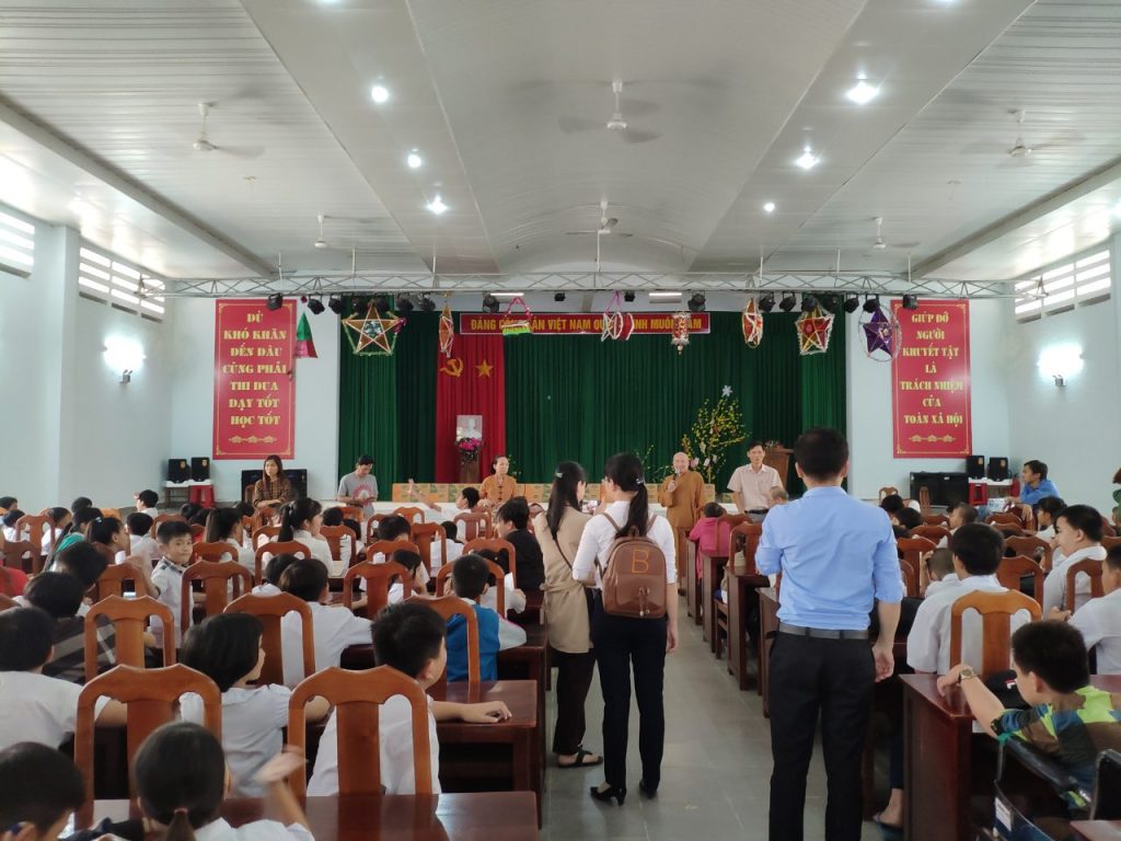 Cùng ngày, phái đoàn tiếp tục đến thăm các em học sinh tại Trường Nuôi Dạy Trẻ Em Khuyết Tật (Ấp 1, xã Sơn Đông, TP.Bến Tre). Được sự đón tiếp của ông Nguyễn Phước Vinh – Hiệu trưởng nhà trường; bà Trần Thị Hoa, bà Bùi Thị Lan – đồng Hiệu Phó nhà trường; cùng quý Thầy Cô chủ nhiệm các lớp, đoàn có buổi giao lưu và trao tặng 200 phần quà đến các em, trị giá 200.000 đồng mỗi phần, bao gồm: lốc sữa, quần áo, đồ chơi cùng bao thư tiền mặt 100.000 đồng.