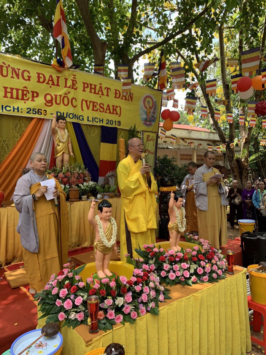Sau khi niêm hương bạch Phật Hòa thượng chứng minh có thời pháp thoại về ý nghĩa ngày Đản sanh.” Đức Phật đản sanh là một nhân duyên đặc biệt, sự xuất hiện của Ngài mang thông điệp yêu thương trên tinh thần vô ngã, vị tha. Trải qua hơn hai mươi năm thế kỷ đạo phật đi đến nơi nào đều mang sứ mạng hoà bình ổn định và phát triển bền vững ở nơi ấy. Vì vậy chúng ta tổ chức ngày Phật đản sanh với niềm tự hào và tâm thế vị tha của người con Phật”. Hàng Phật tử trang nghiêm thính pháp nhằm chuyển hóa khổ đau trong cuộc sống.