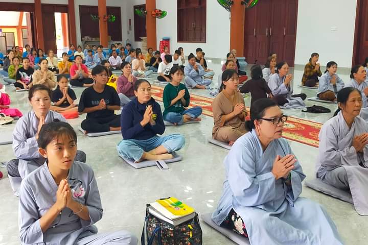 Vào lúc 08h00 quý Phật tử cùng vân tập về giảng đường, ổn định đạo tràng bước vào thời khóa niệm Phật kinh hành.